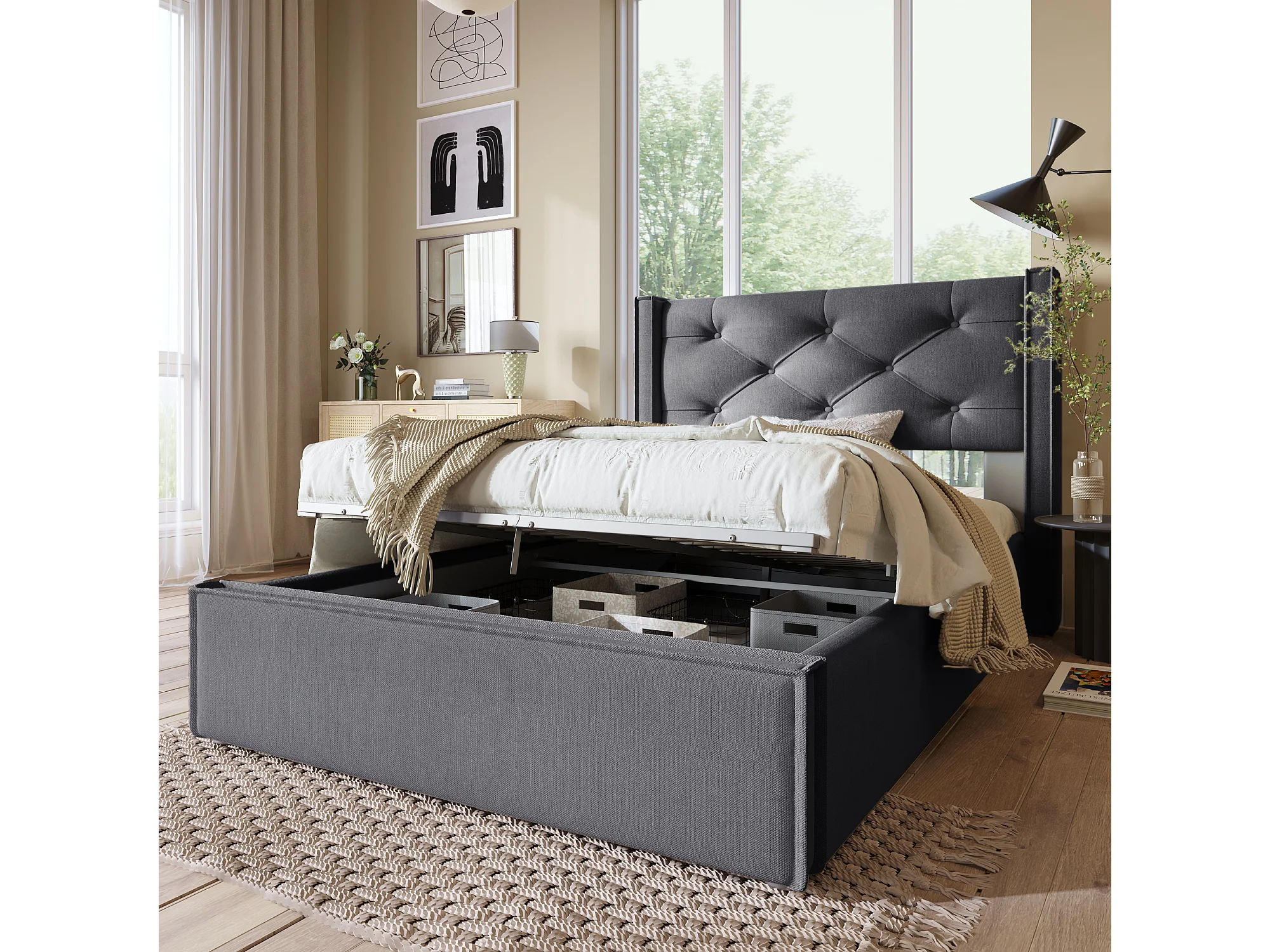 Lit hydraulique 90x200 cm, Tête de lit ajustable, Rangement, Matelas inclus, Velours, Gris (203x101x110 cm)