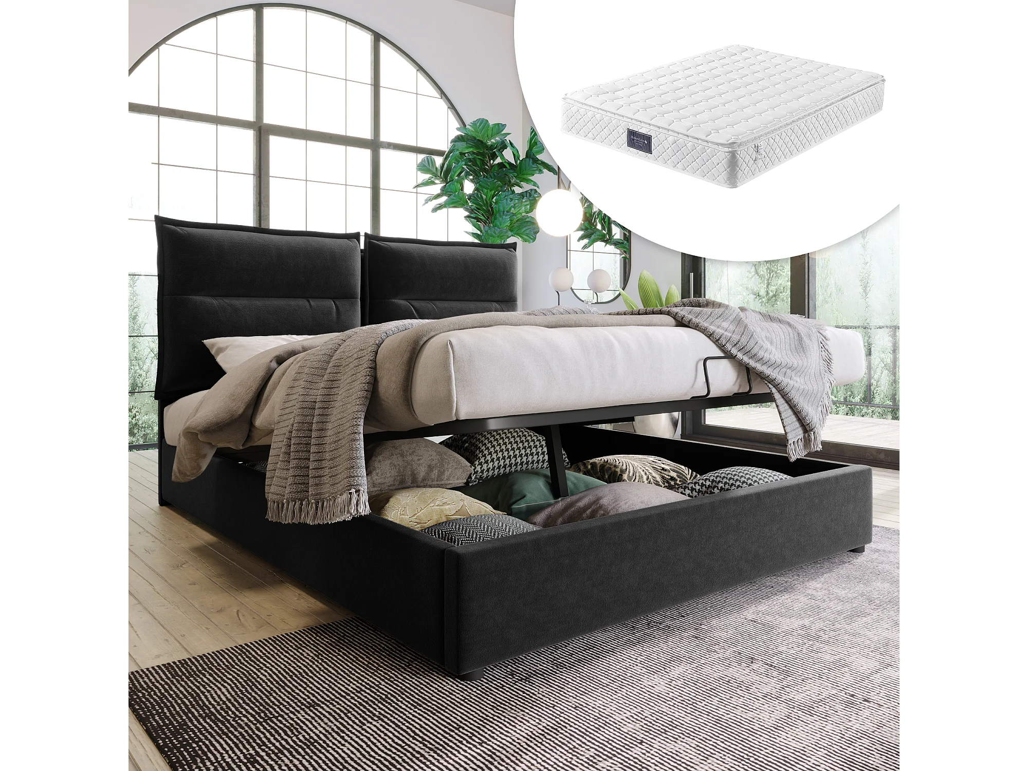 Lit Hydraulique Double - 140 X 200 cm - Structure Métallique - Velours - Espace De Rangement - Noir - Matelas Inclus