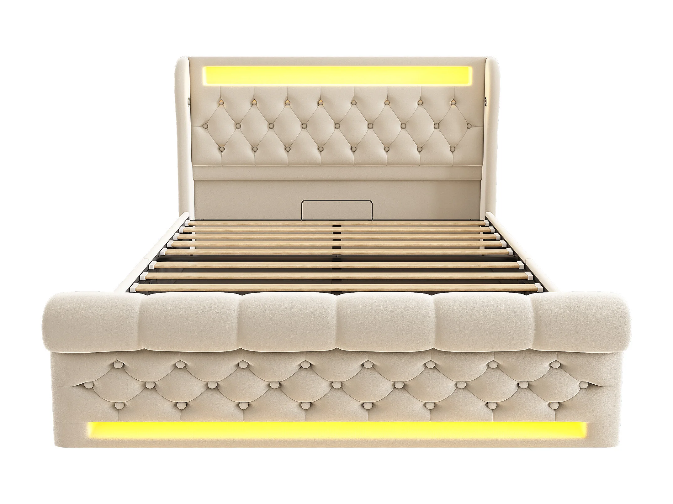 Lit hydraulique pour adulte 160 x 200 cm, avec éclairage LED, ports USB et Type-C, couleur beige, velours (sans matelas)