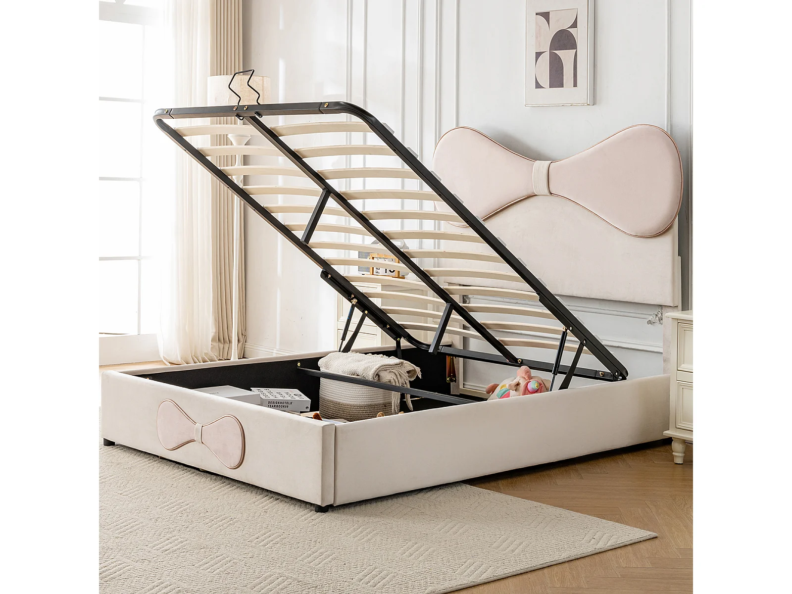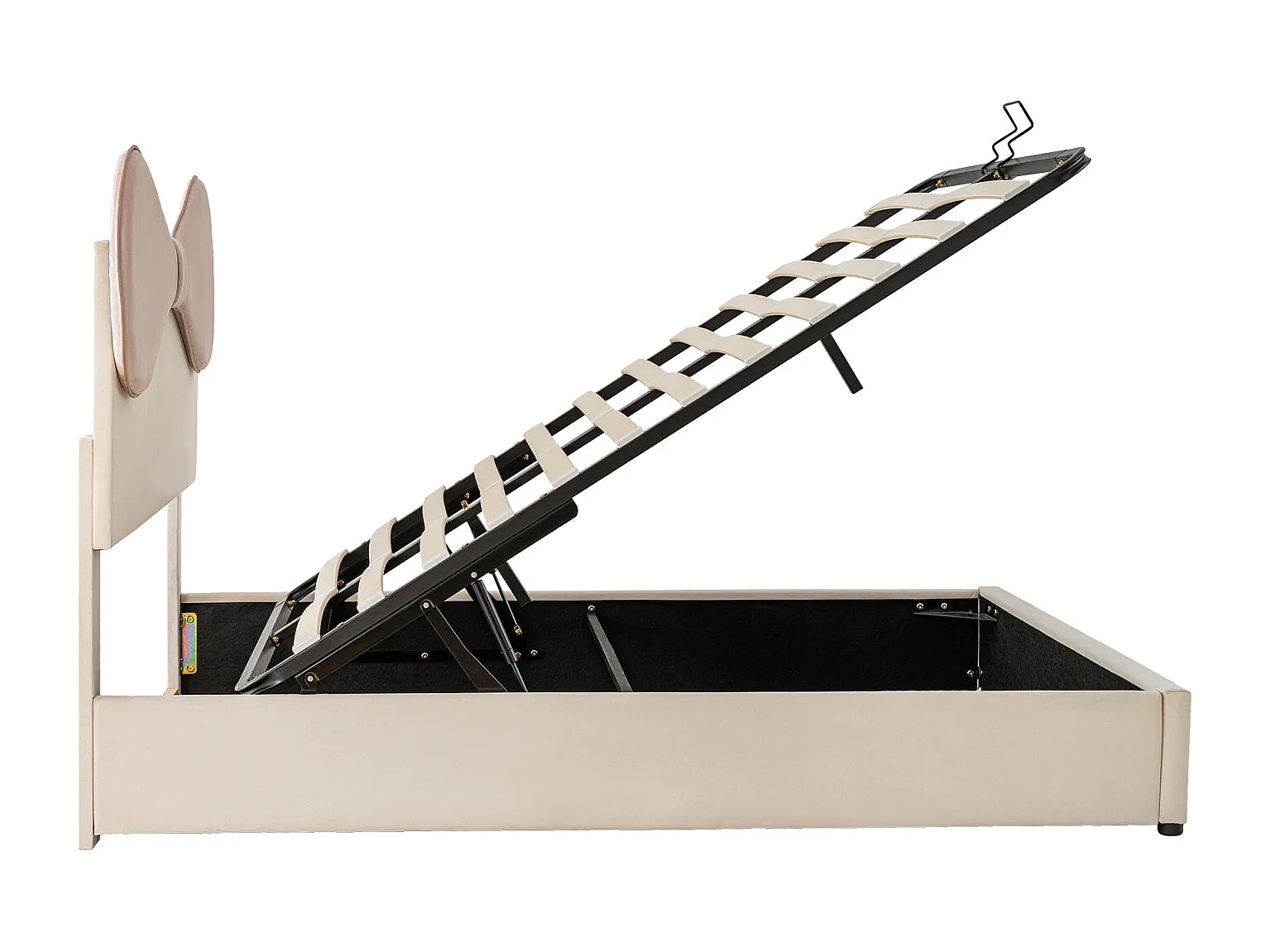 Lit hydraulique tapissé, double, tête de lit réglable (arc), sommier à lattes métalliques (rangement), velours, beige + rose, 140x200cm