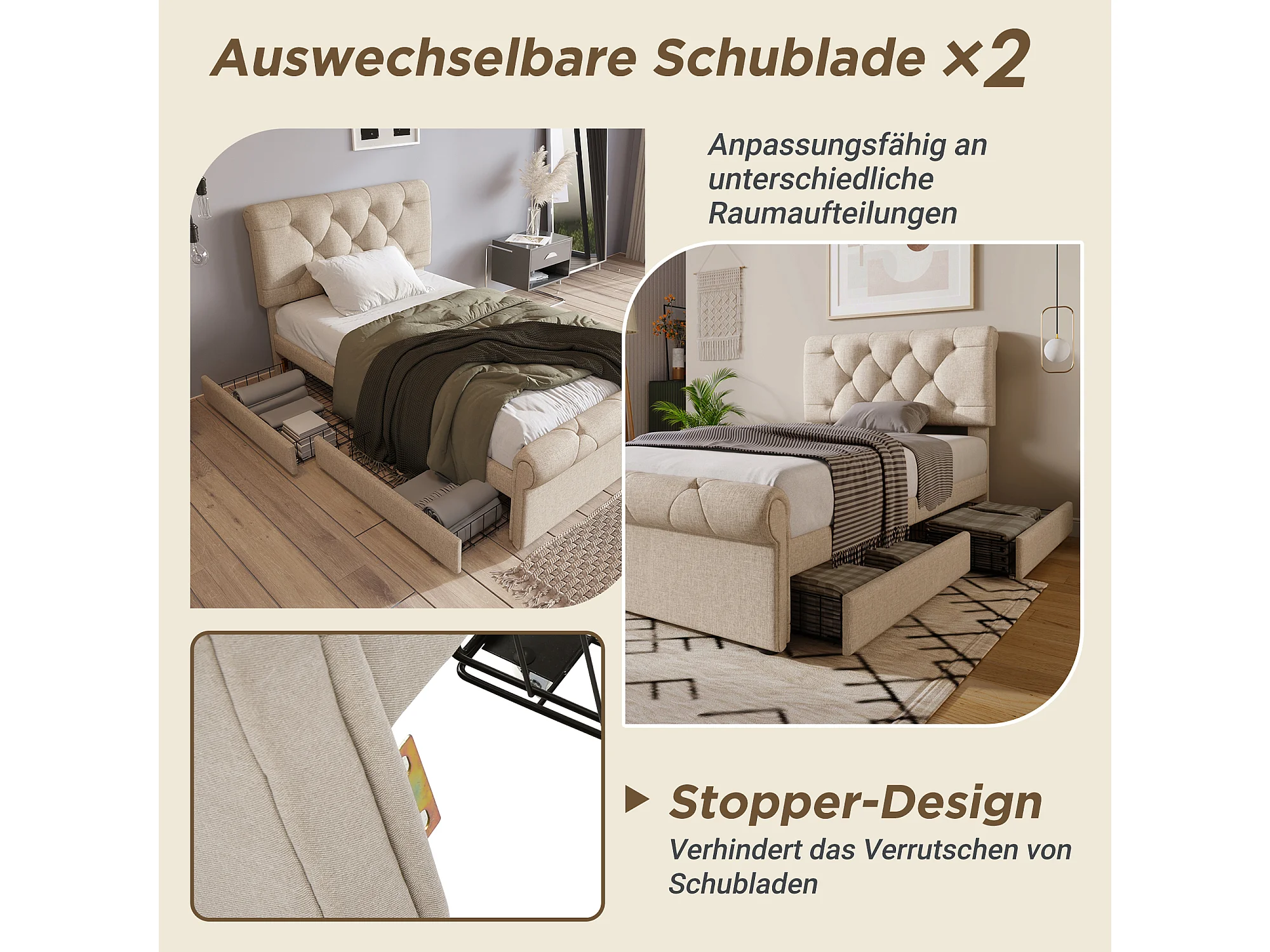 Lit individuel avec tête de lit réglable, 2 tiroirs et matelas, design Chesterfield, bois et métal, naturel (225x98x110 cm)
