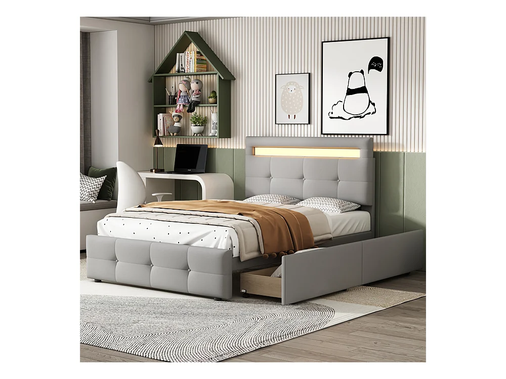 Lit jeune lit 90x200 cm lit rembourré lit 2 tiroirs avec des lampes led lit simple bois gris