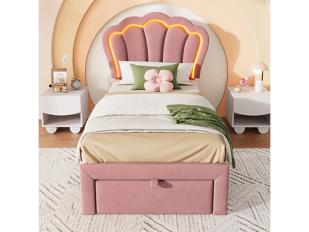 Lit jeune lit 90x200 cm lit simple lit rembourré lit sommier à lattes avec 1 tiroir velours rose