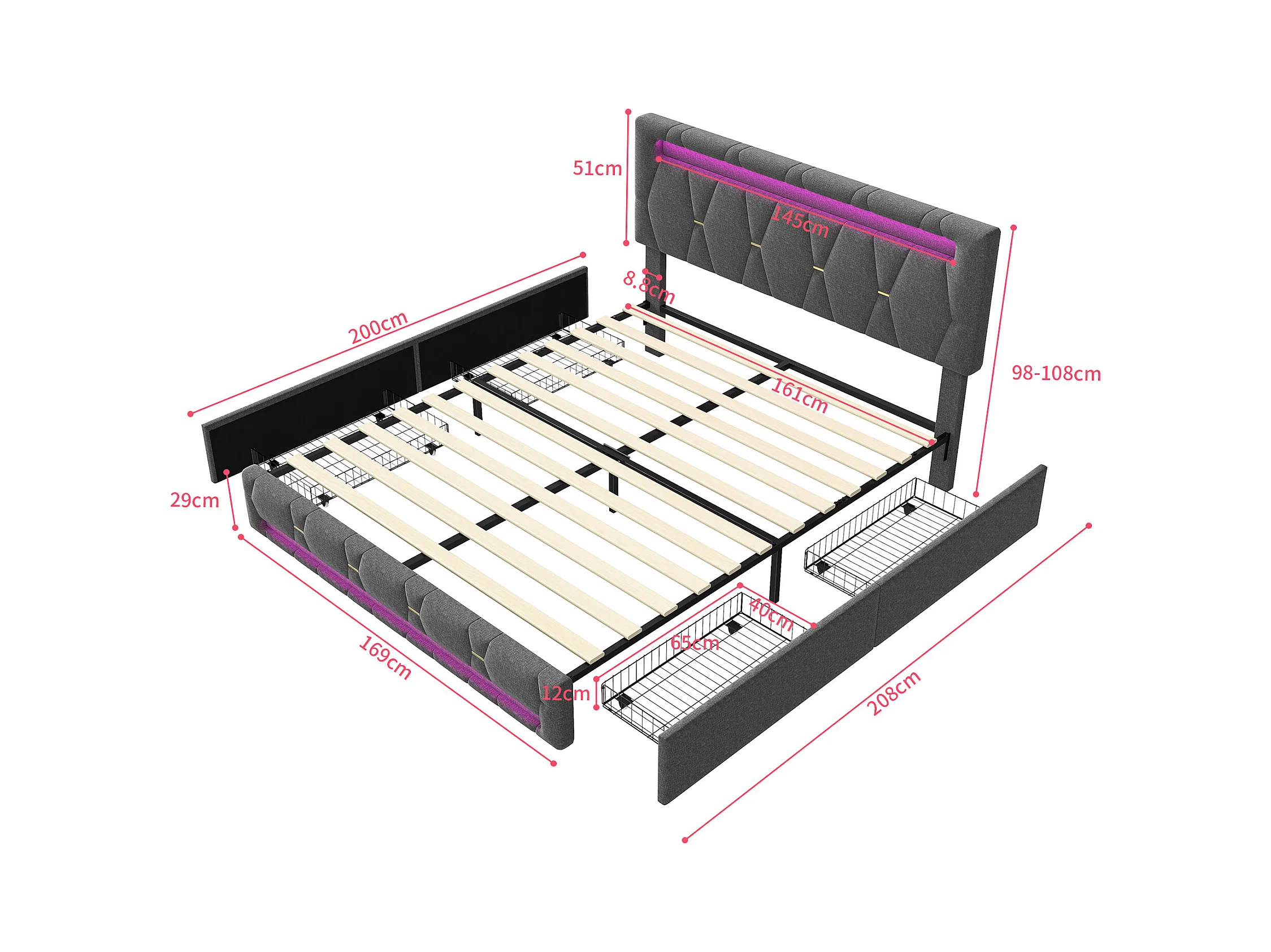 Lit LED 160 x 200 cm, avec 4 tiroirs, lit Double, tête de lit réglable, Lits de Rangement, Lin, Gris
