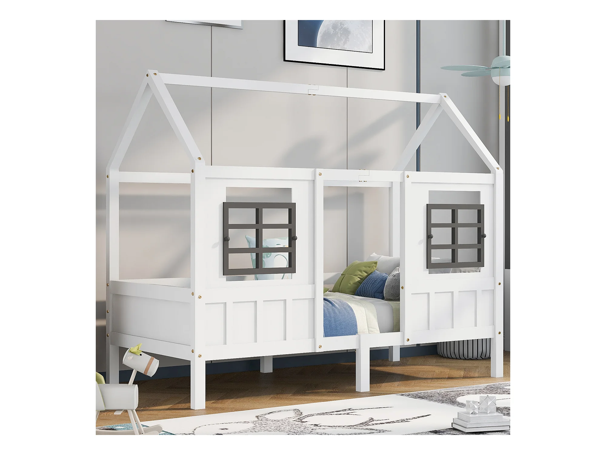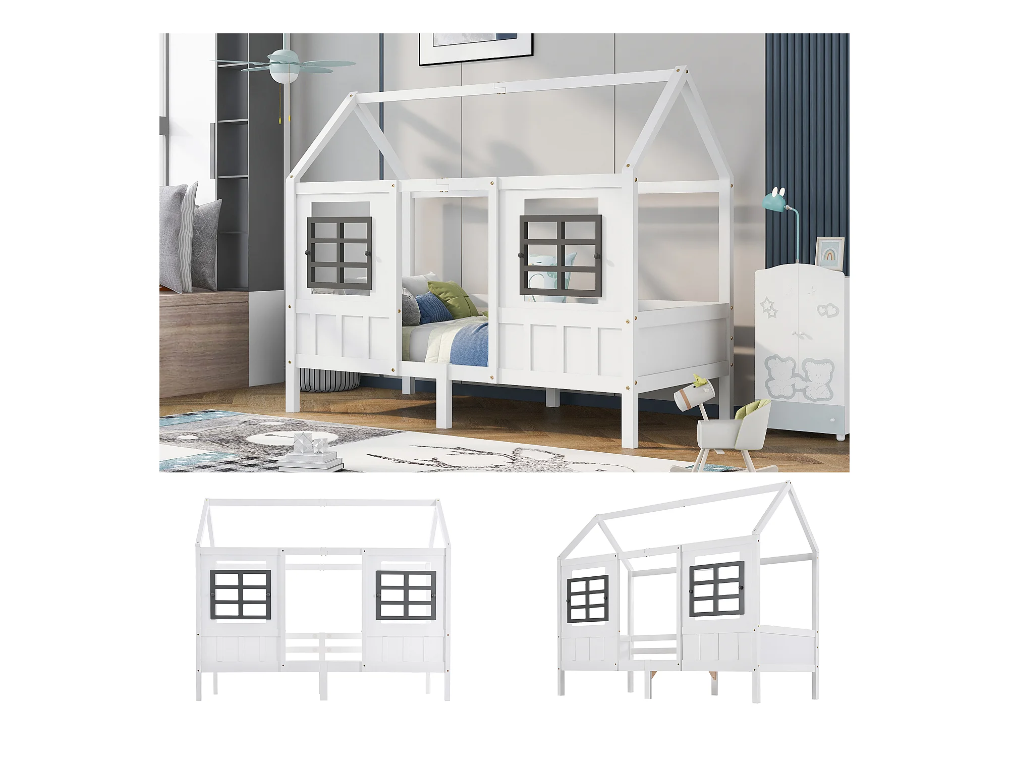 Lit Maison avec Fenêtres, Lit Enfant, Lit Simple et Double, Cadre en Bois Massif, MDF, Blanc (200x90cm)