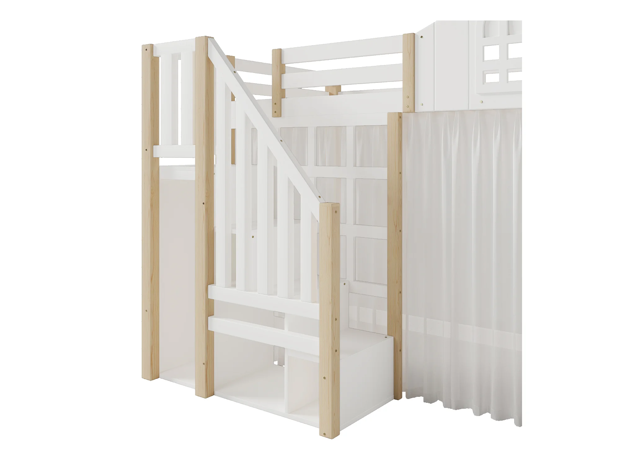 Lit mezzanine 140x200 cm - avec éclairage LED - avec échelle de rangement - avec compartiments de rangement - Blanc + Naturel