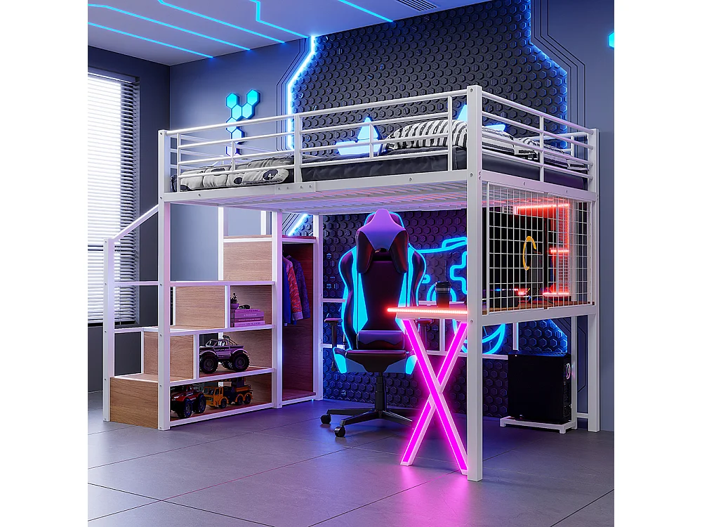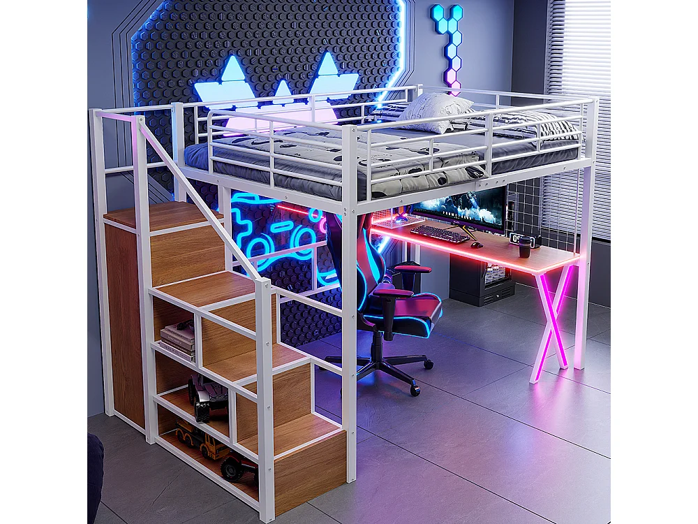Lit mezzanine 140x200 éclairage d'ambiance télécommandé échelle de rangement bureau armoire étagères Blanc
