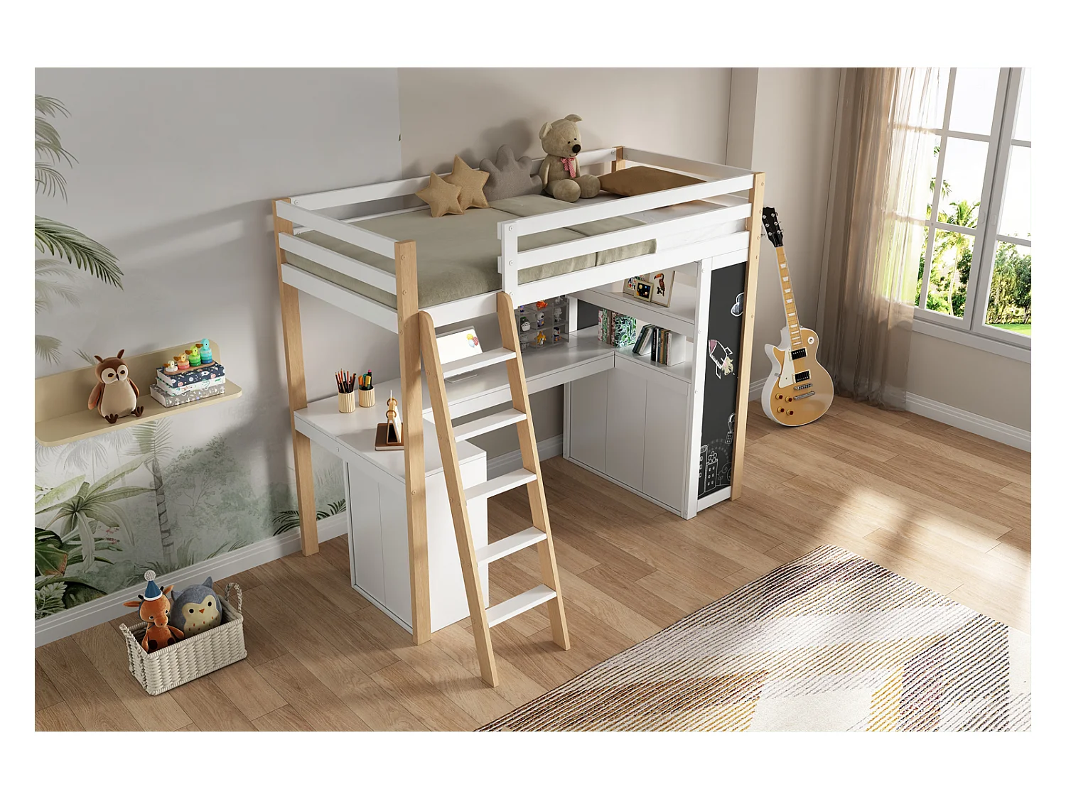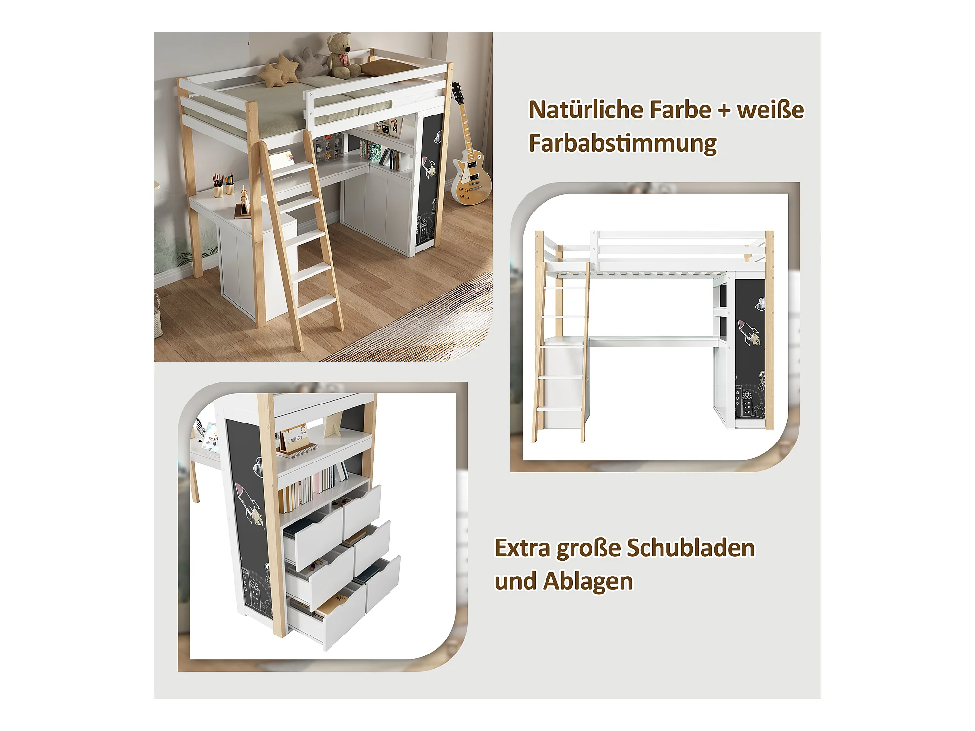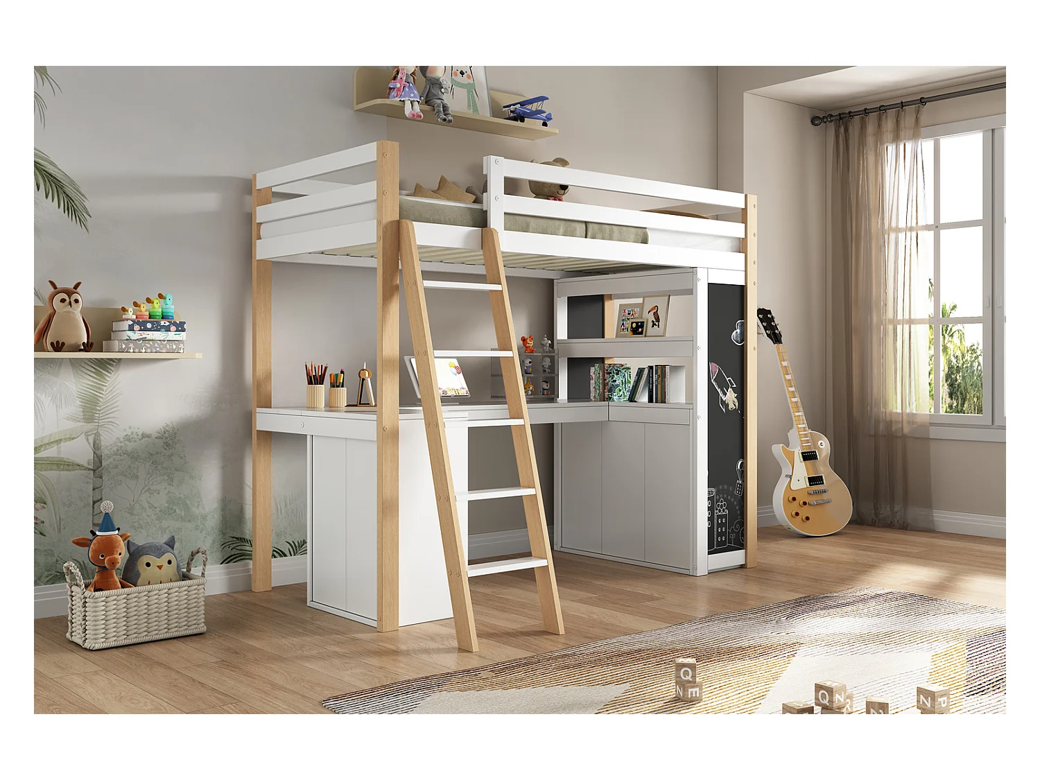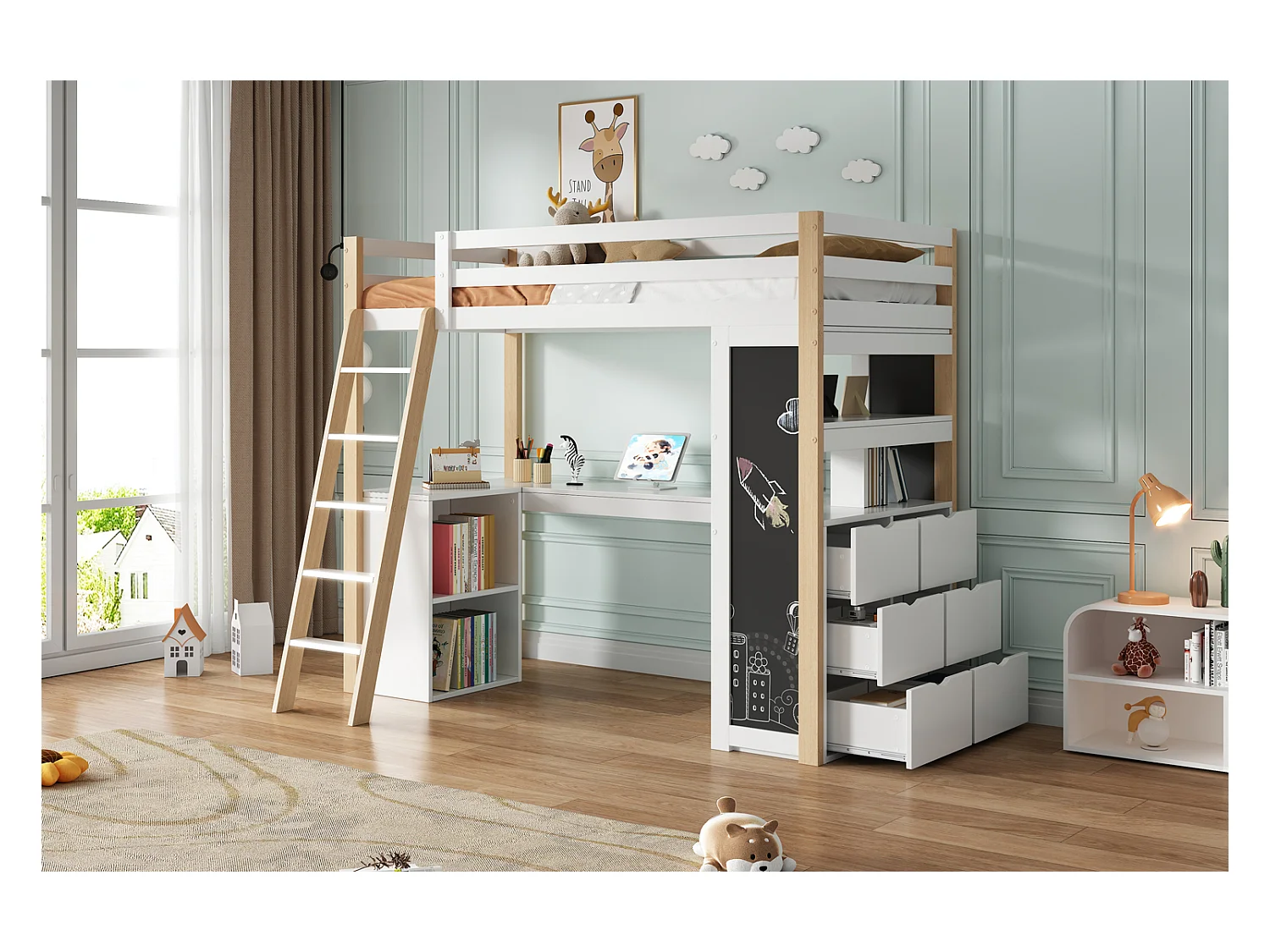 Lit mezzanine 90 x 200 cm avec bureau d'angle, 6 tiroirs et étagère - Bois massif + MDF - Blanc + naturel (sans matelas)