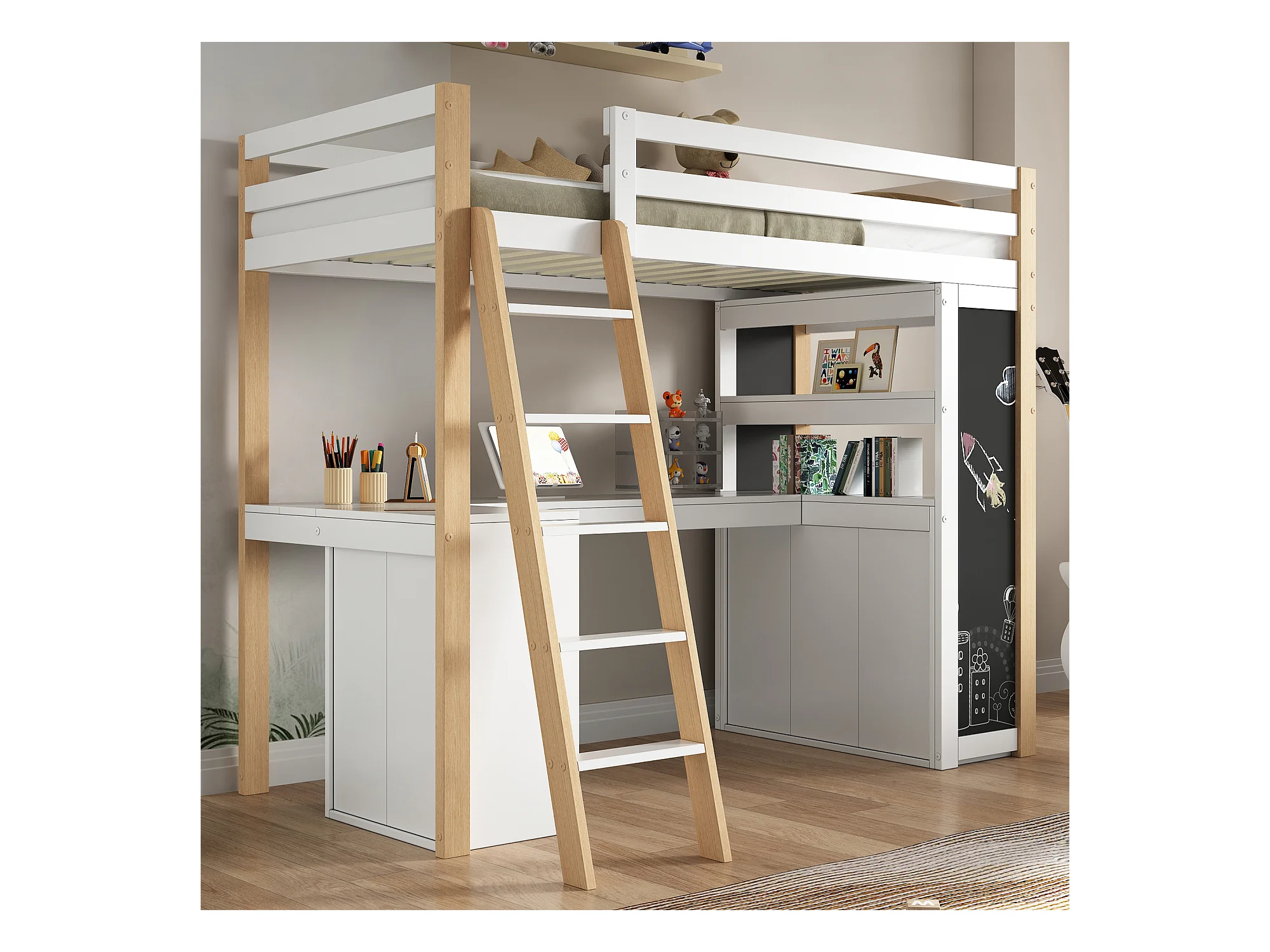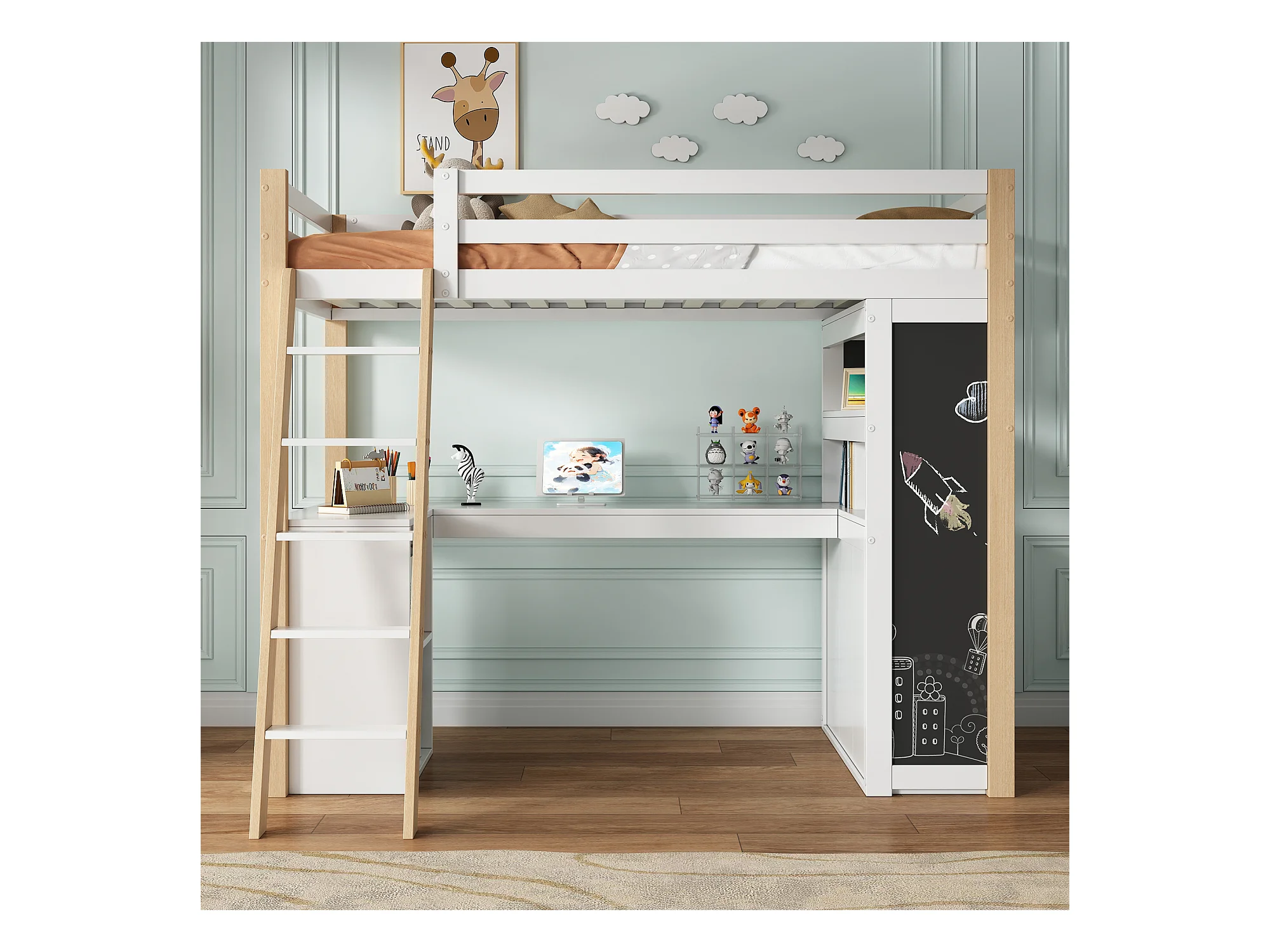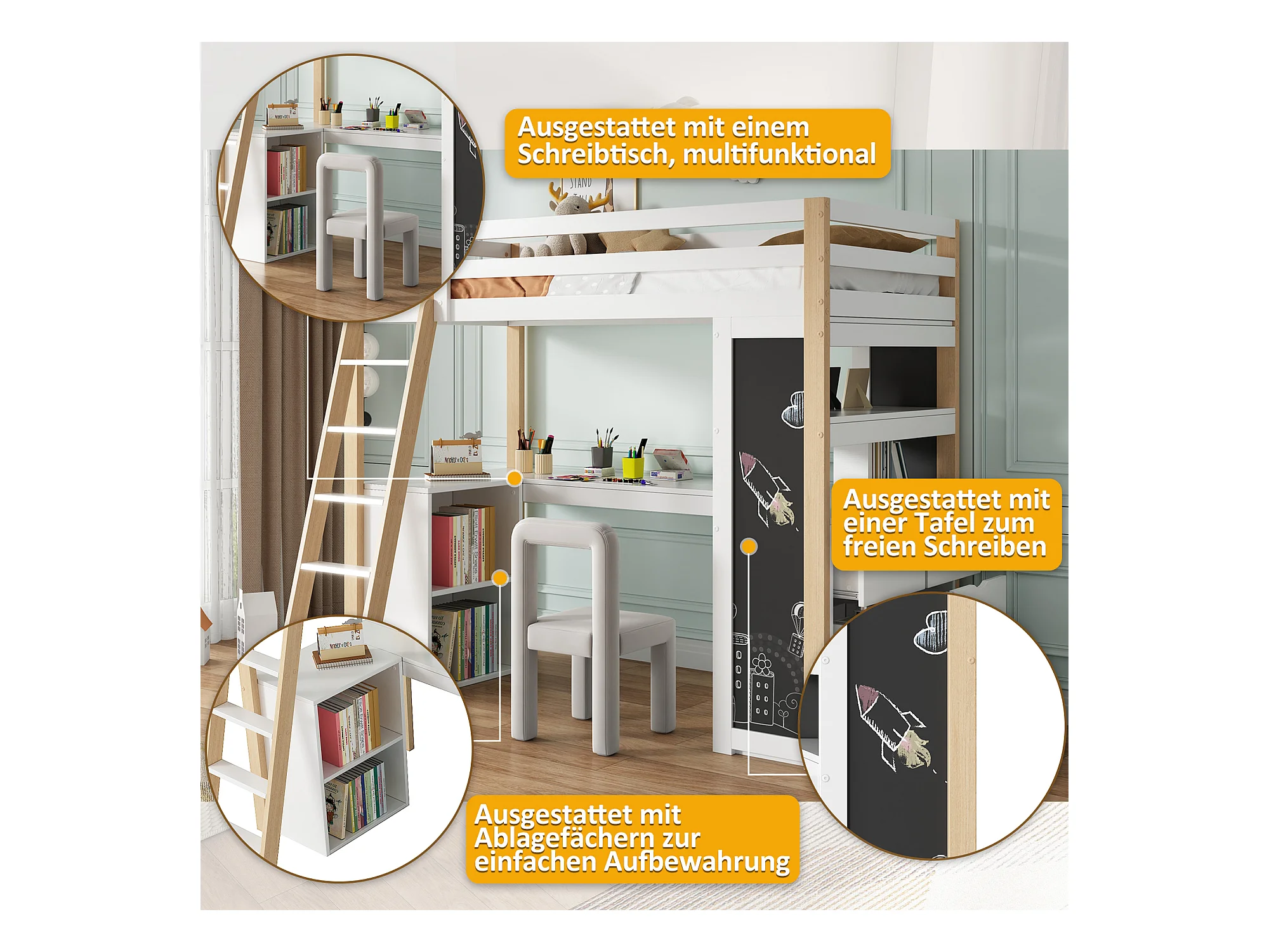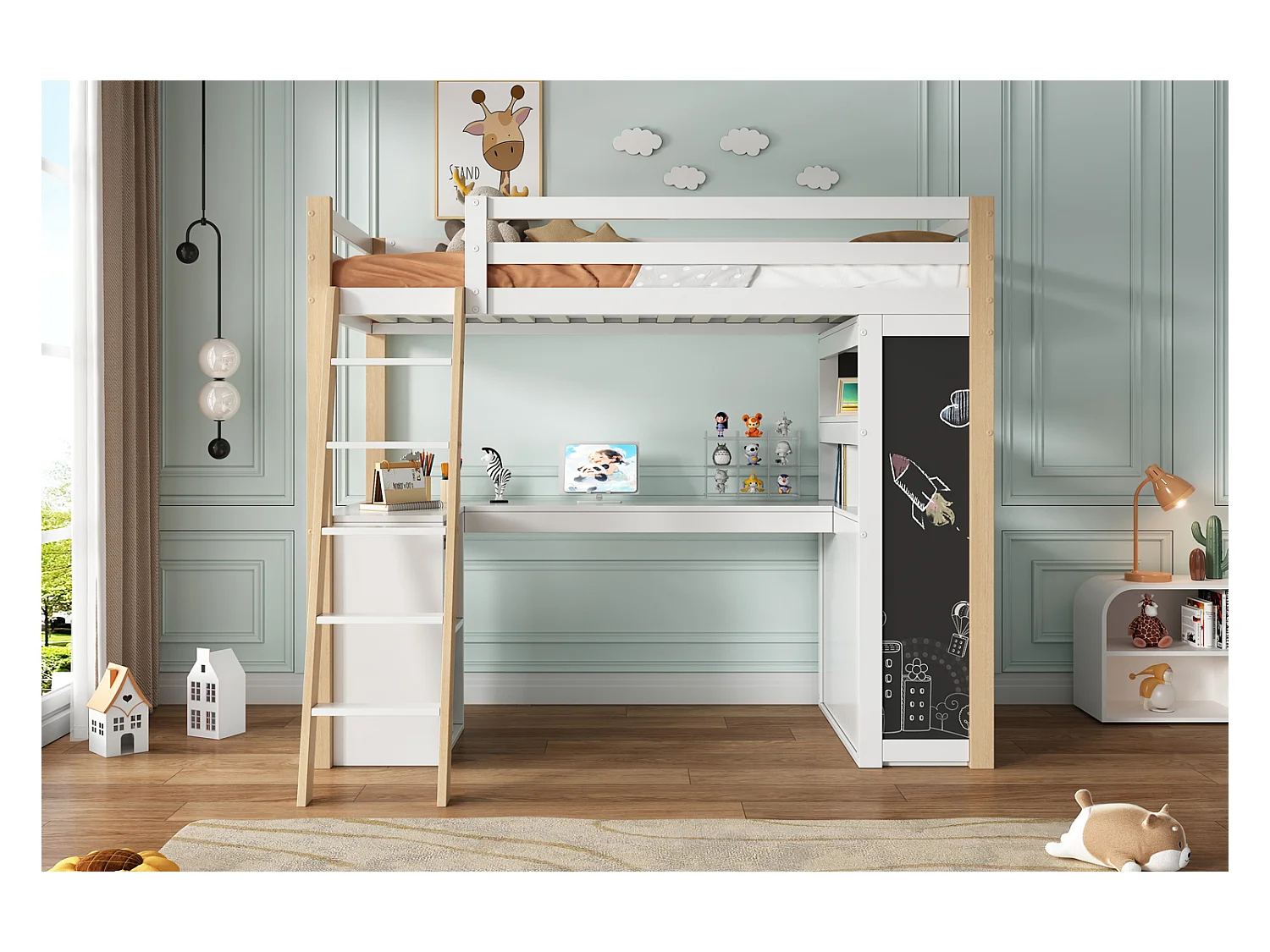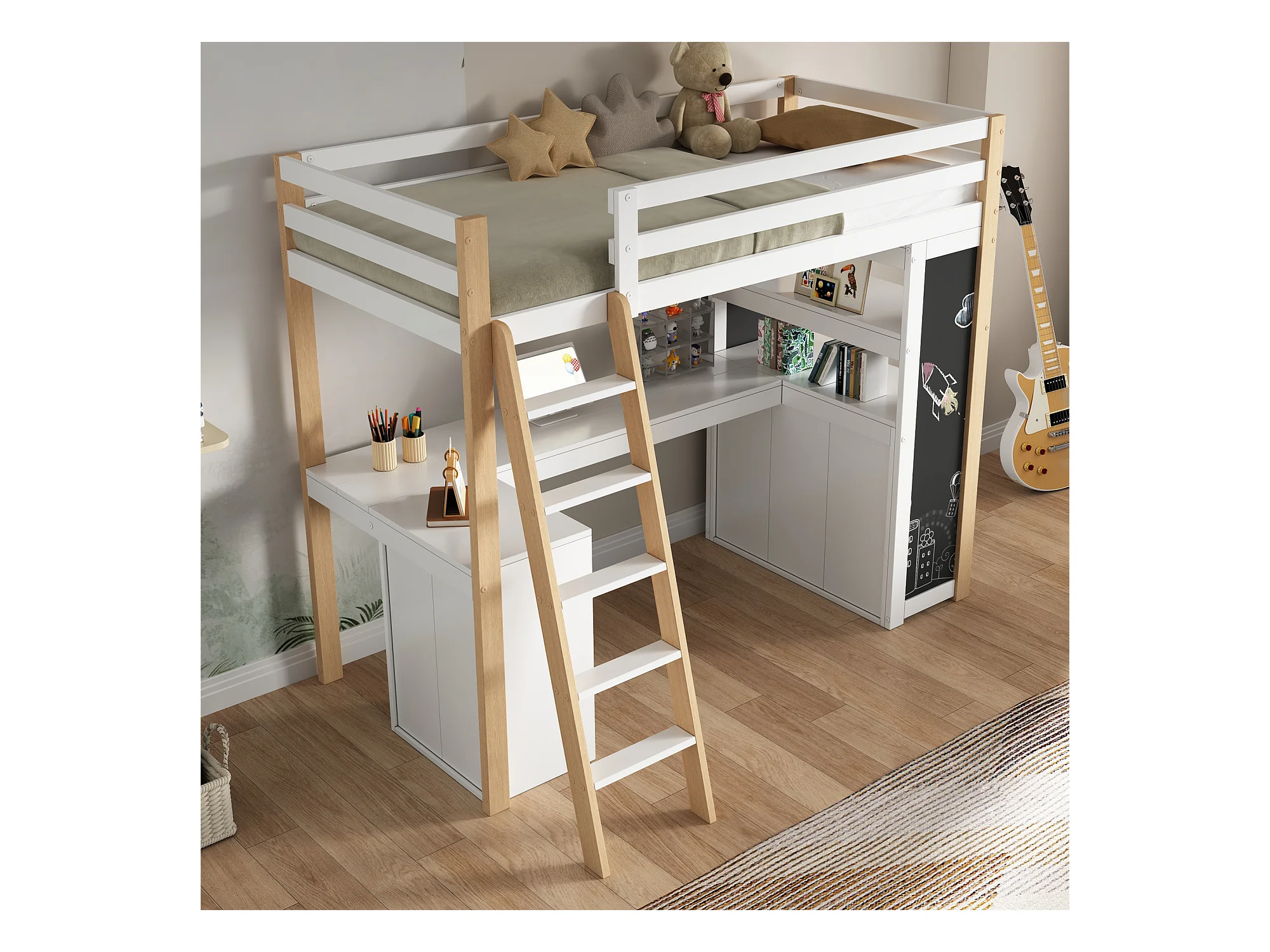Lit mezzanine 90 x 200 cm avec bureau d'angle, 6 tiroirs et étagère - Bois massif + MDF - Blanc + naturel (sans matelas)