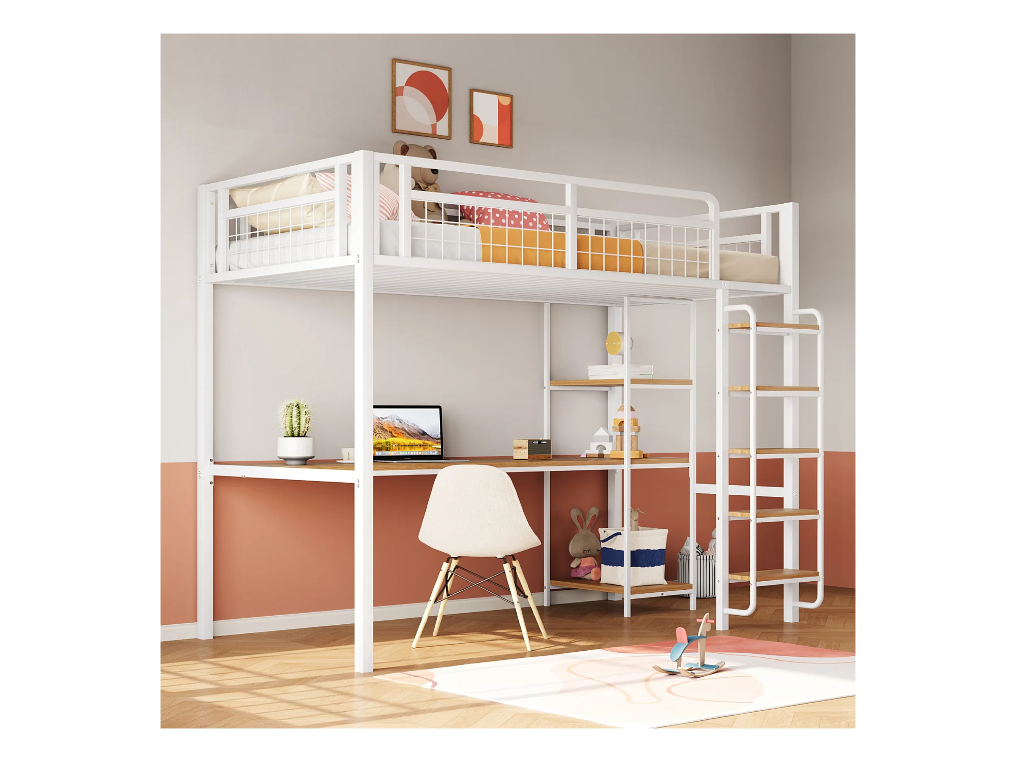 Lit mezzanine 90 x 200 cm avec bureau étagères de rangement - Métal et MDF - pour enfant - Blanc