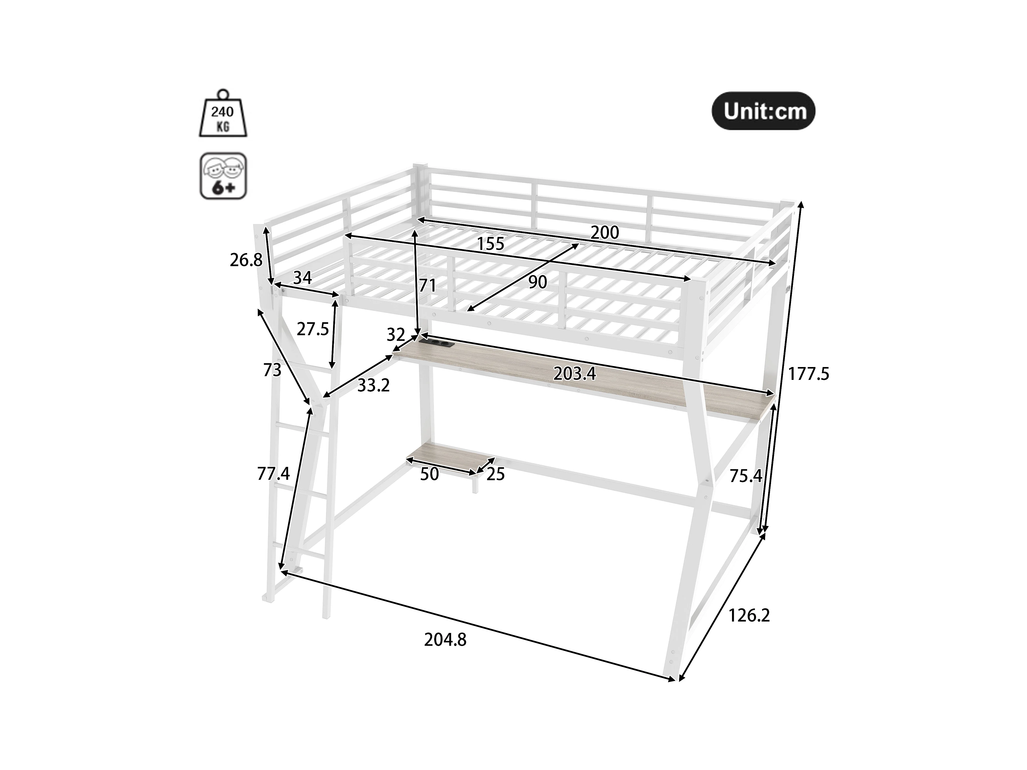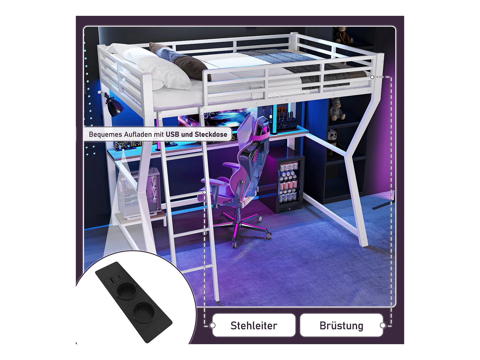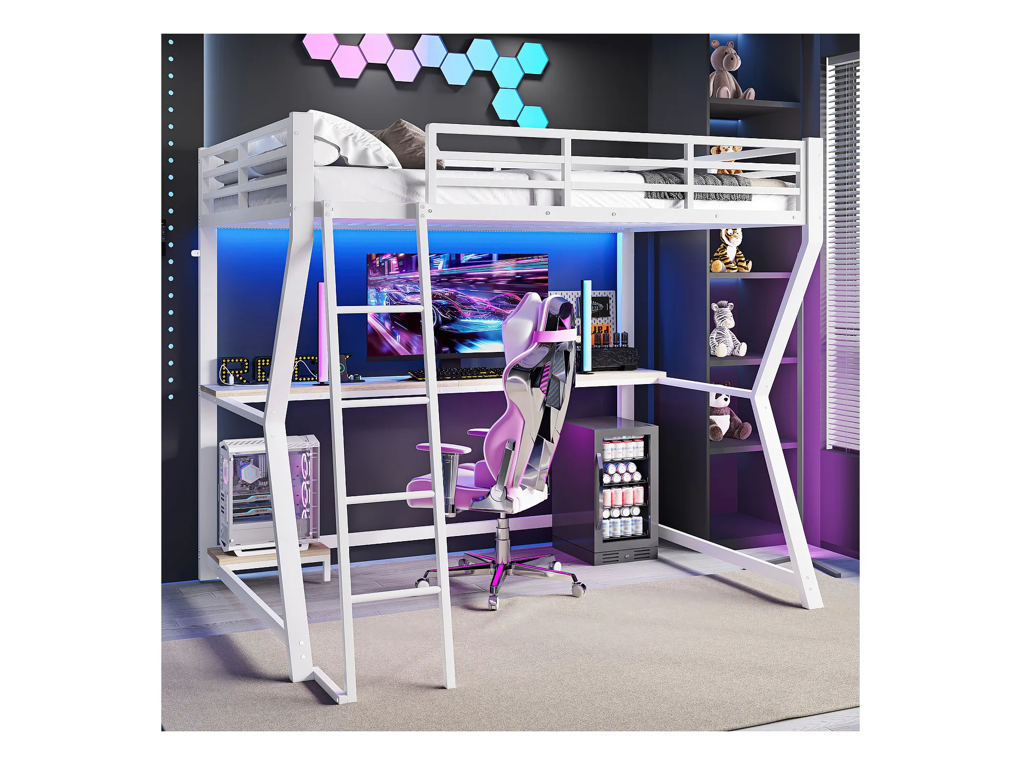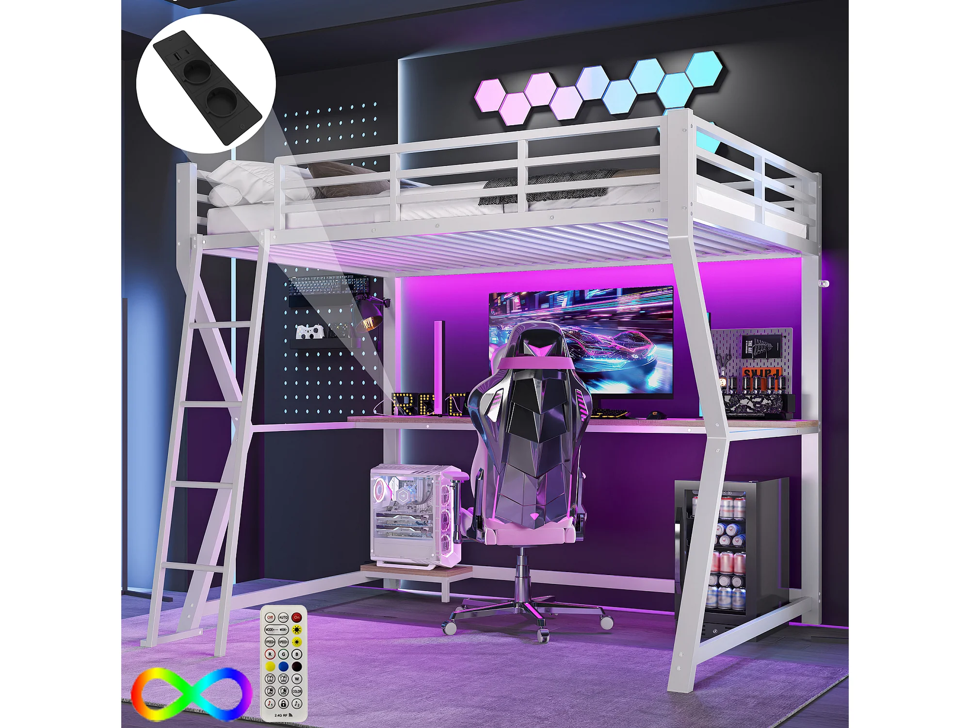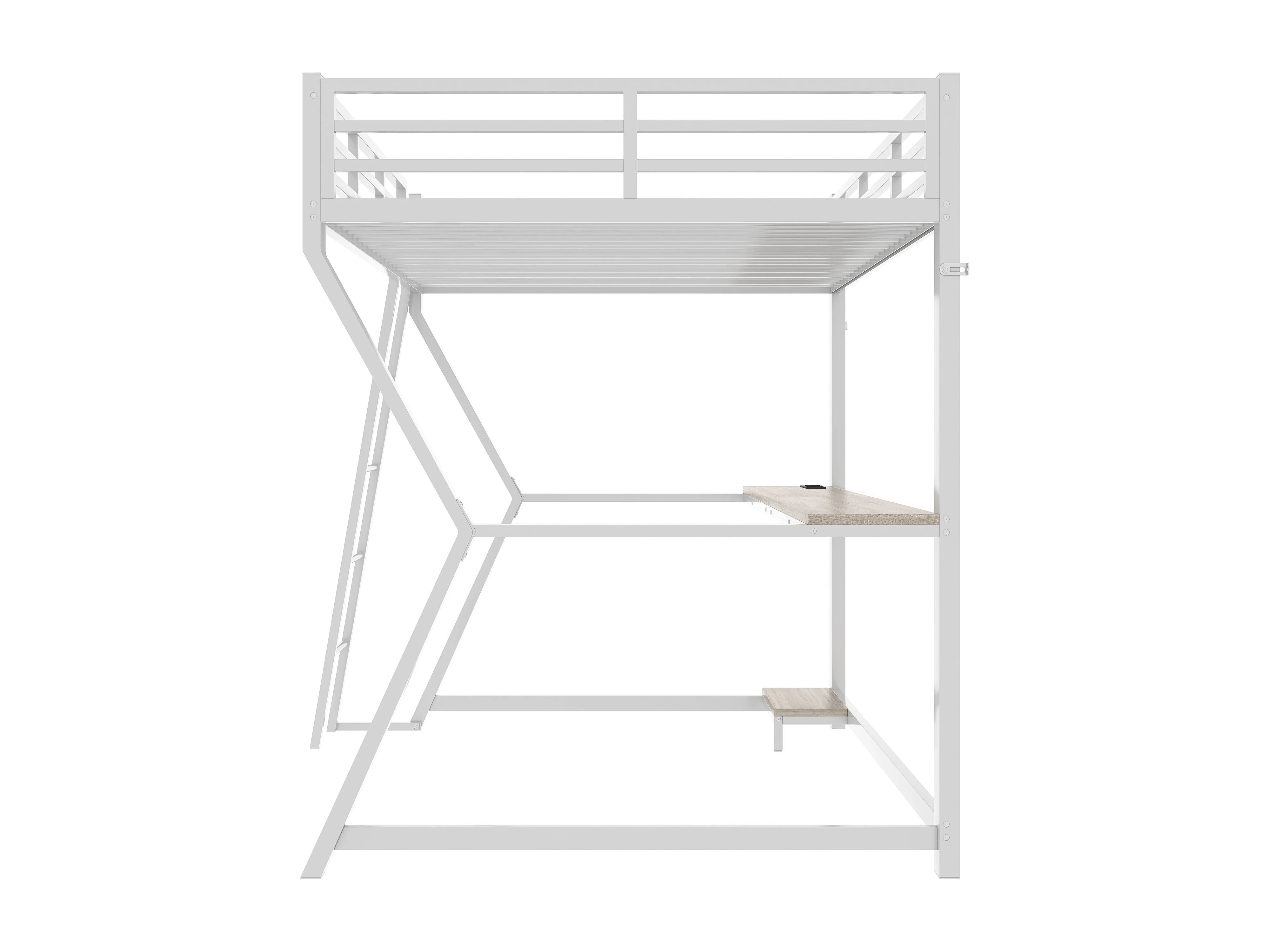 Lit mezzanine 90 x 200 cm avec bureau, prise+USB et étagères - Lumière d'ambiance - Métal - Blanc (sans matelas)