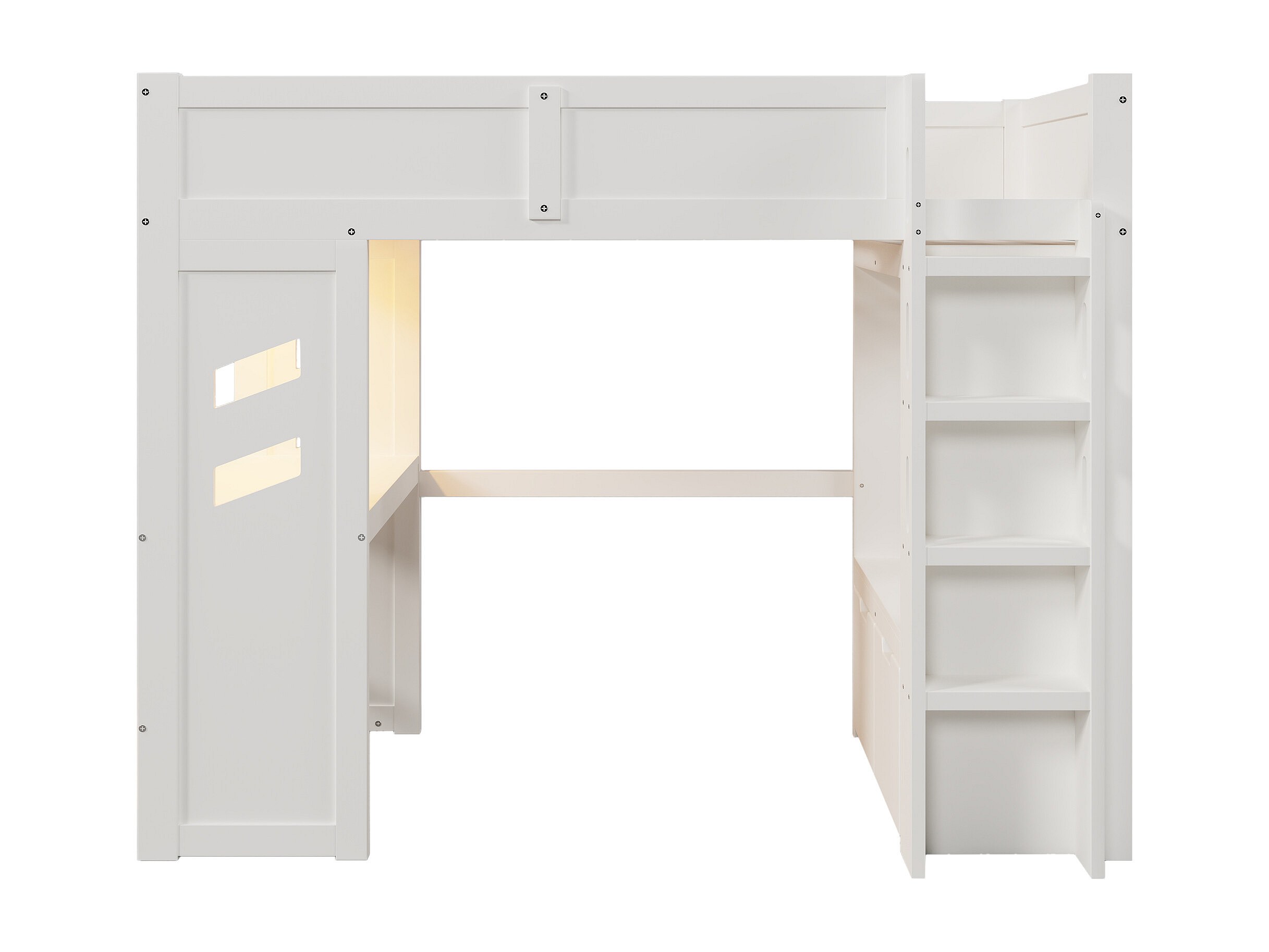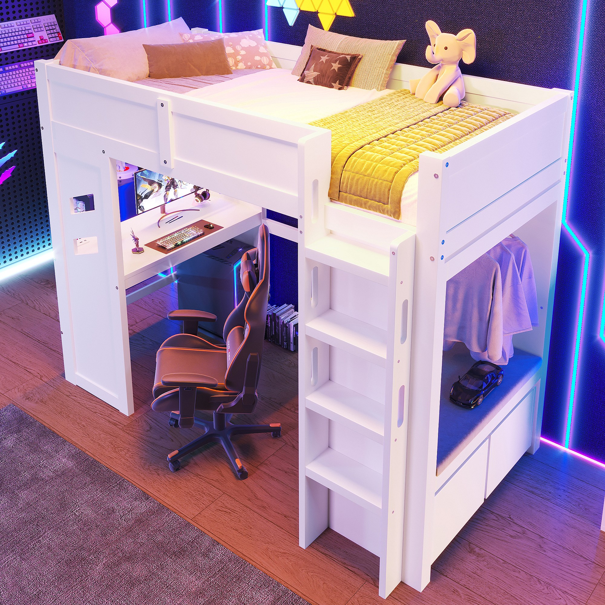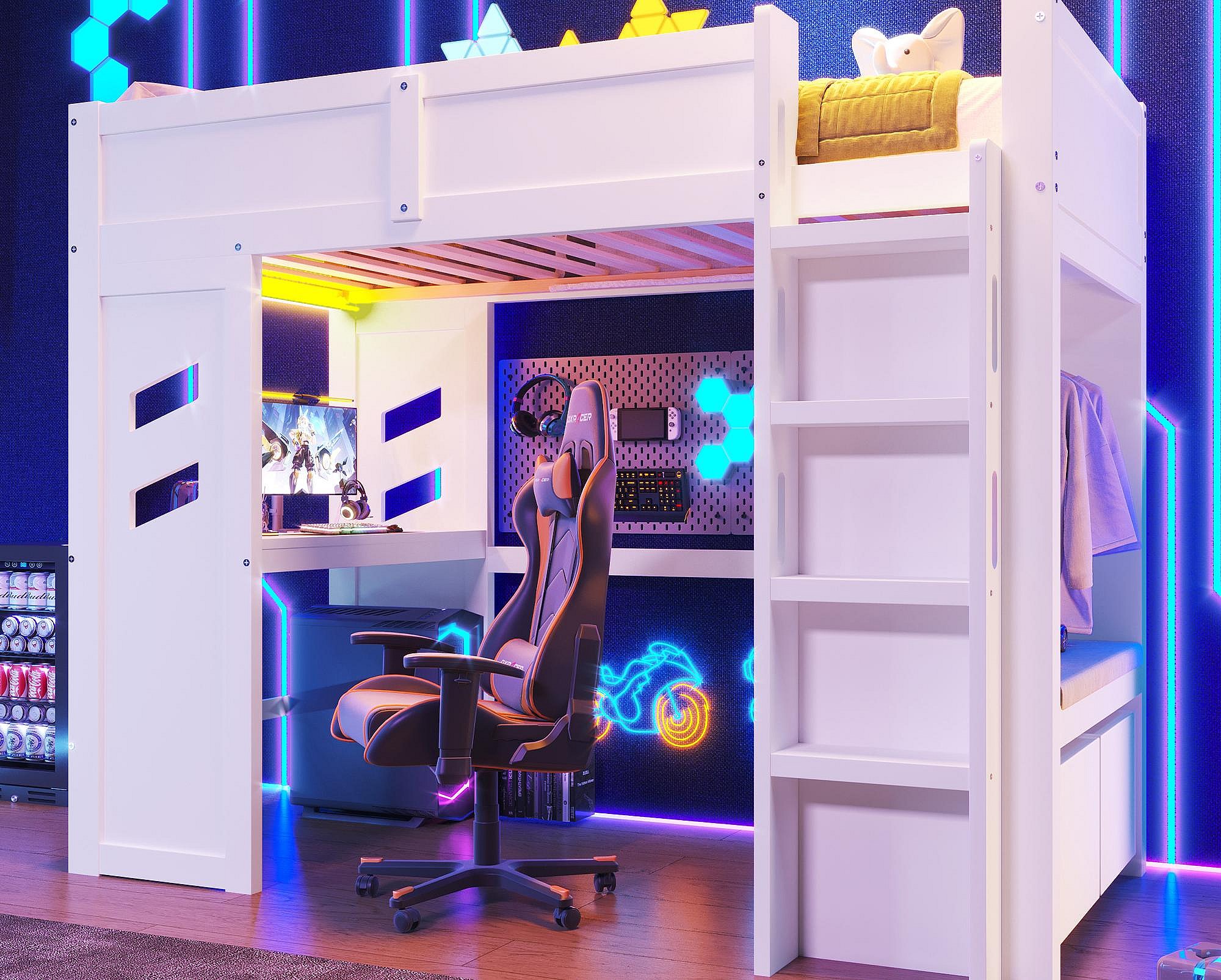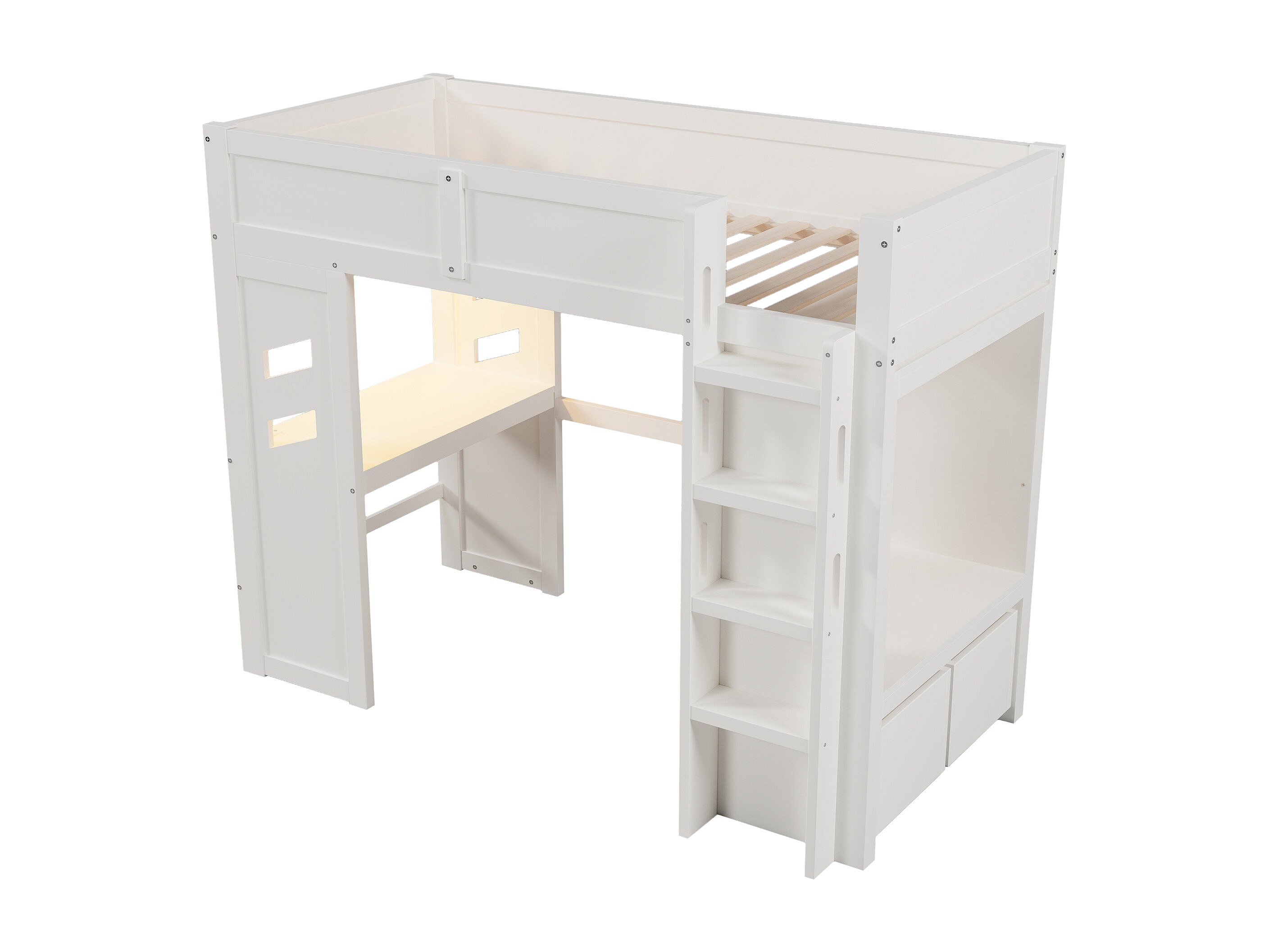 Lit mezzanine 90x200 cm - avec bureau - avec éclairage LED - avec 1 port USB - avec échelle + tiroir + étendoir - Blanc