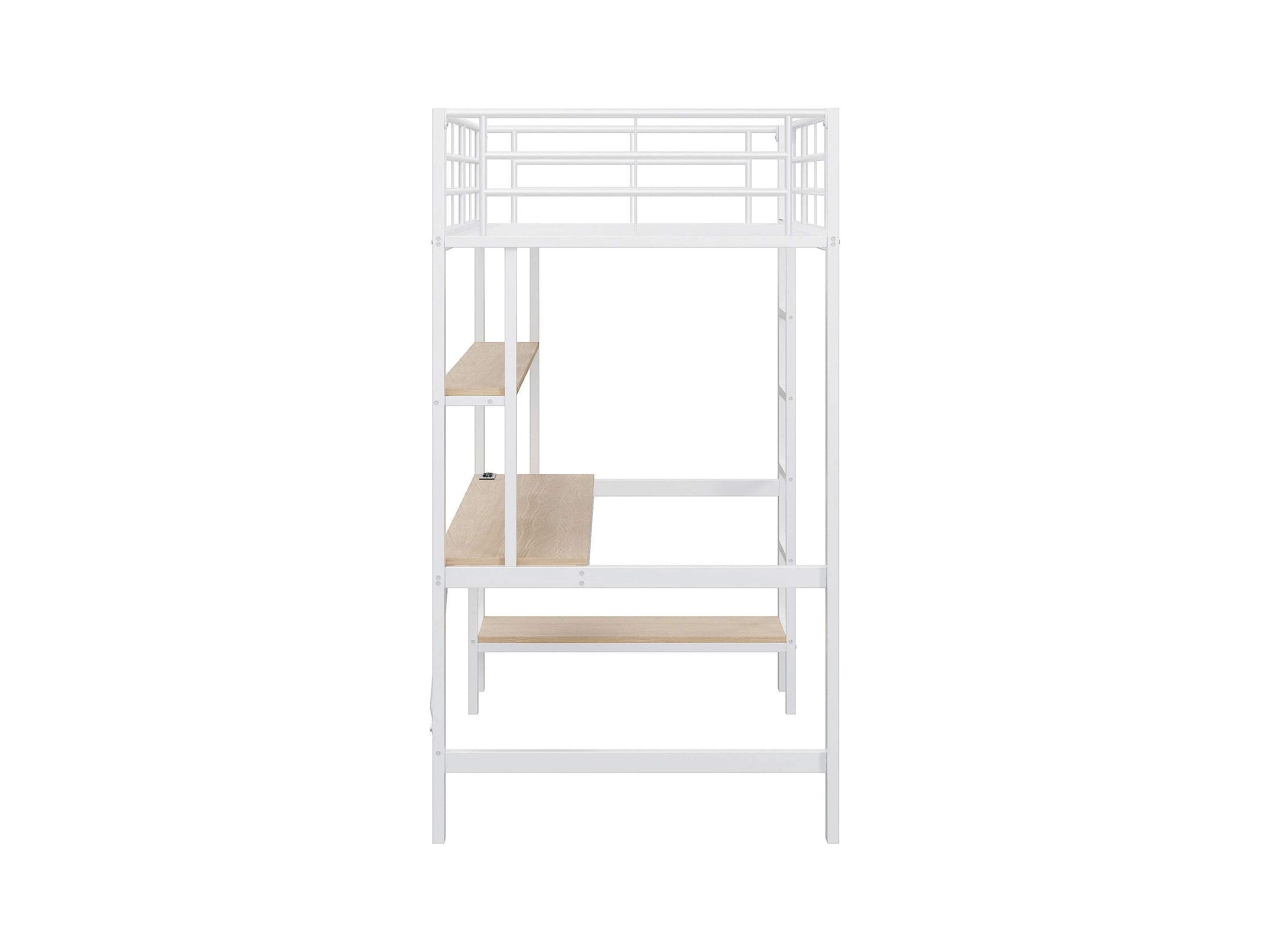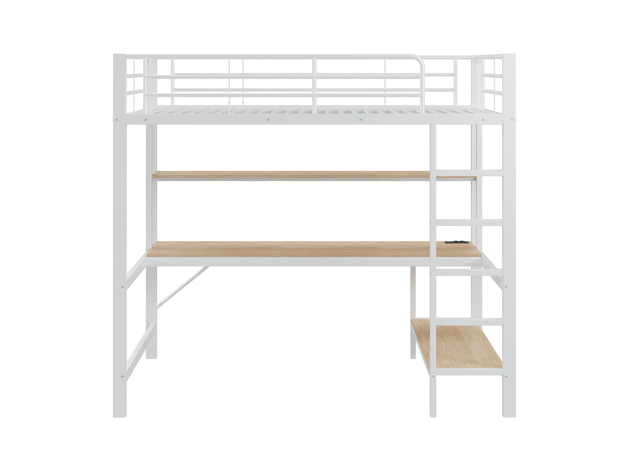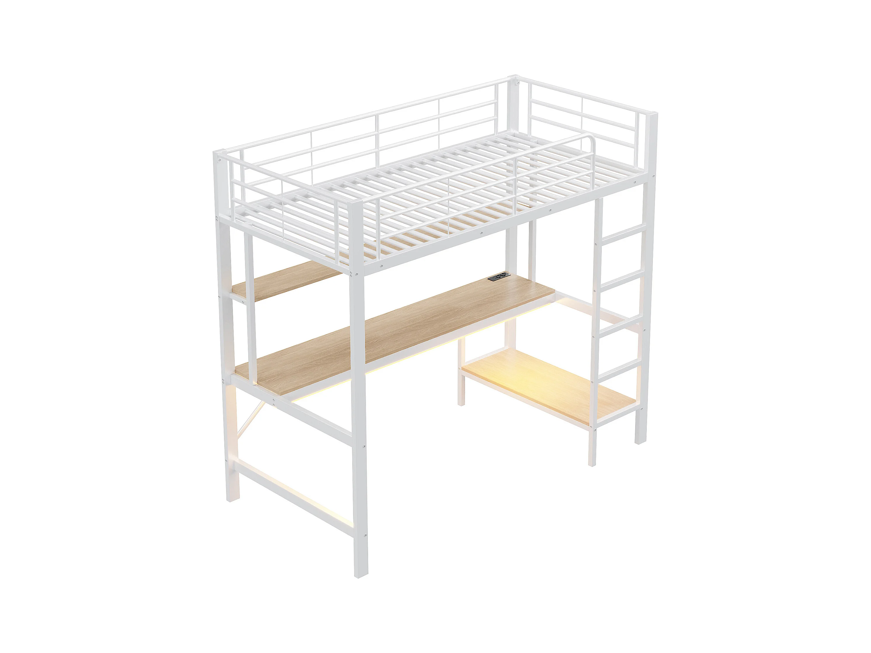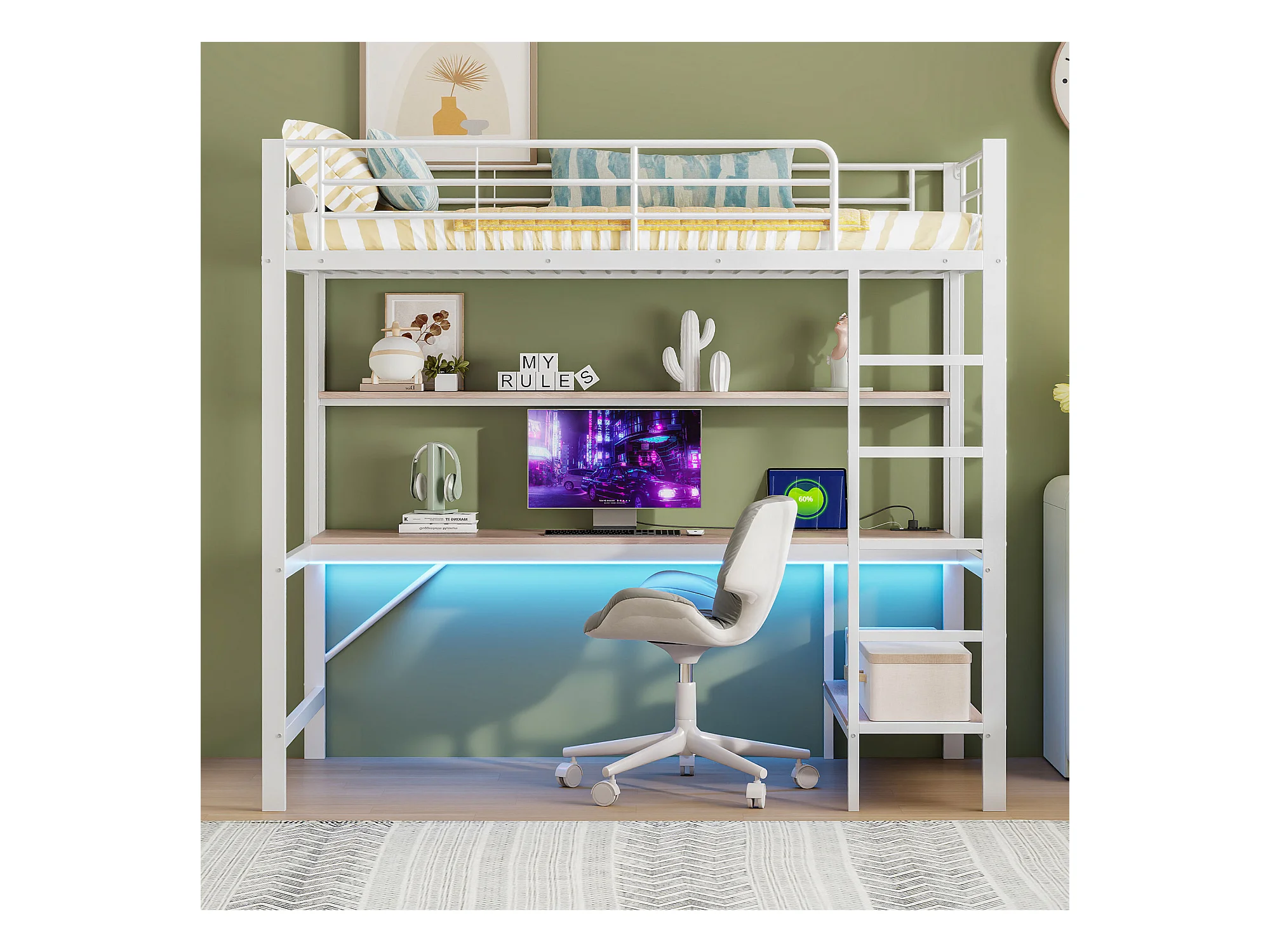 Lit mezzanine 90x200 cm avec éclairage USB et LED, étagères et bureau, blanc - sans matelas