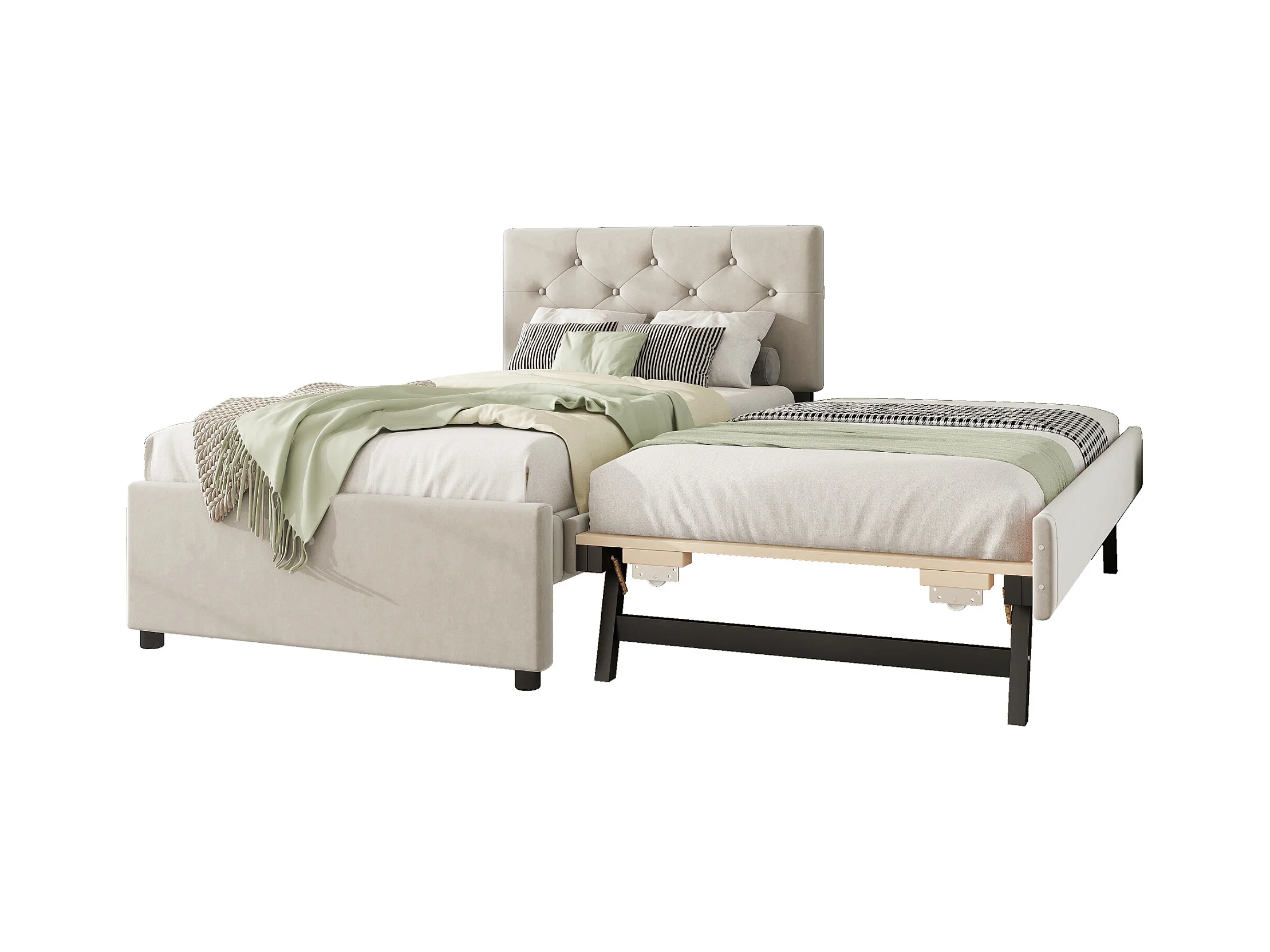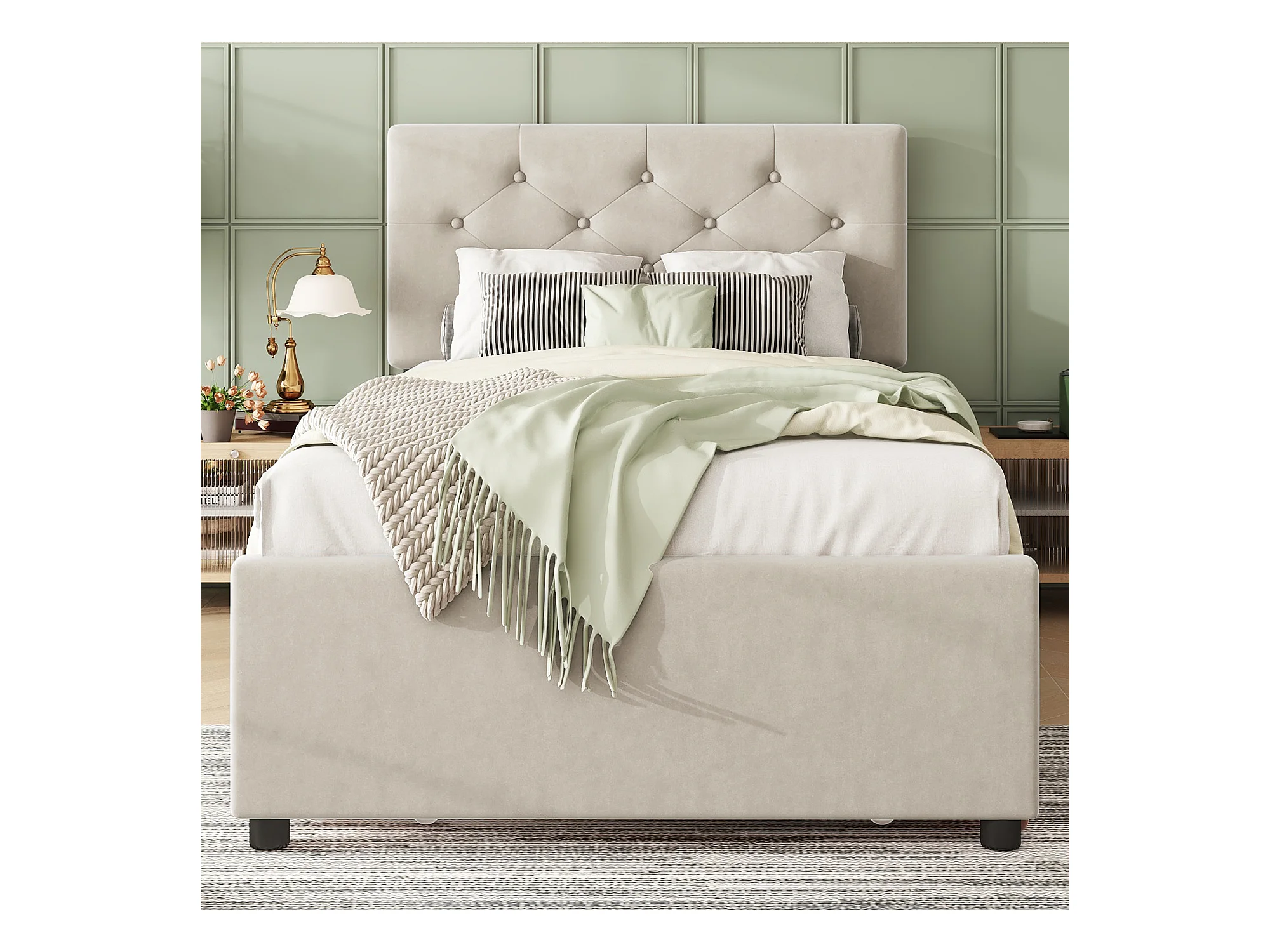 Lit mezzanine, 90x200 cm, avec sommier à lattes, lit avec container roulant, velours, minimaliste, Beige (209x105x104 cm)