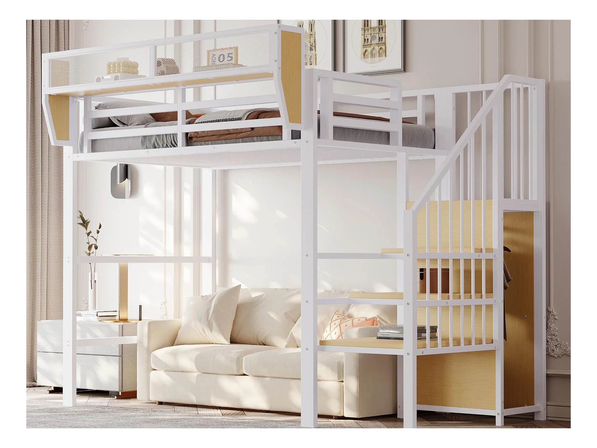 Lit mezzanine 90x200cm - avec échelle - rangements modulables - métal - blanc (sans matelas)