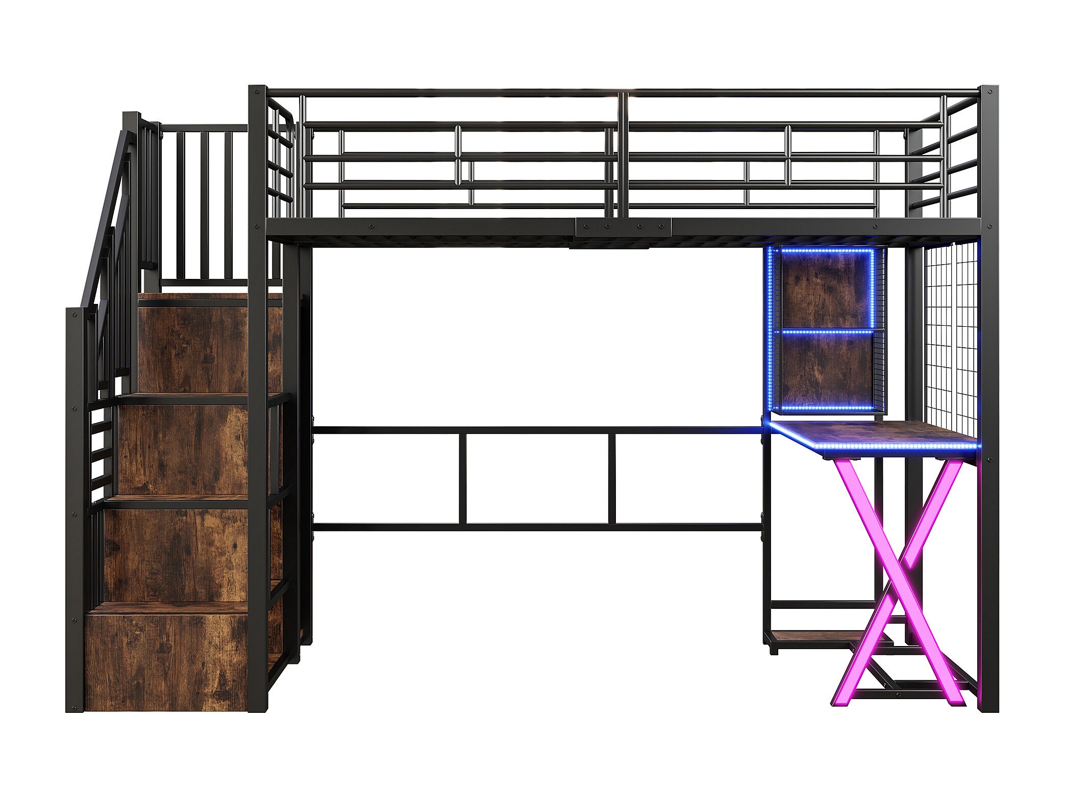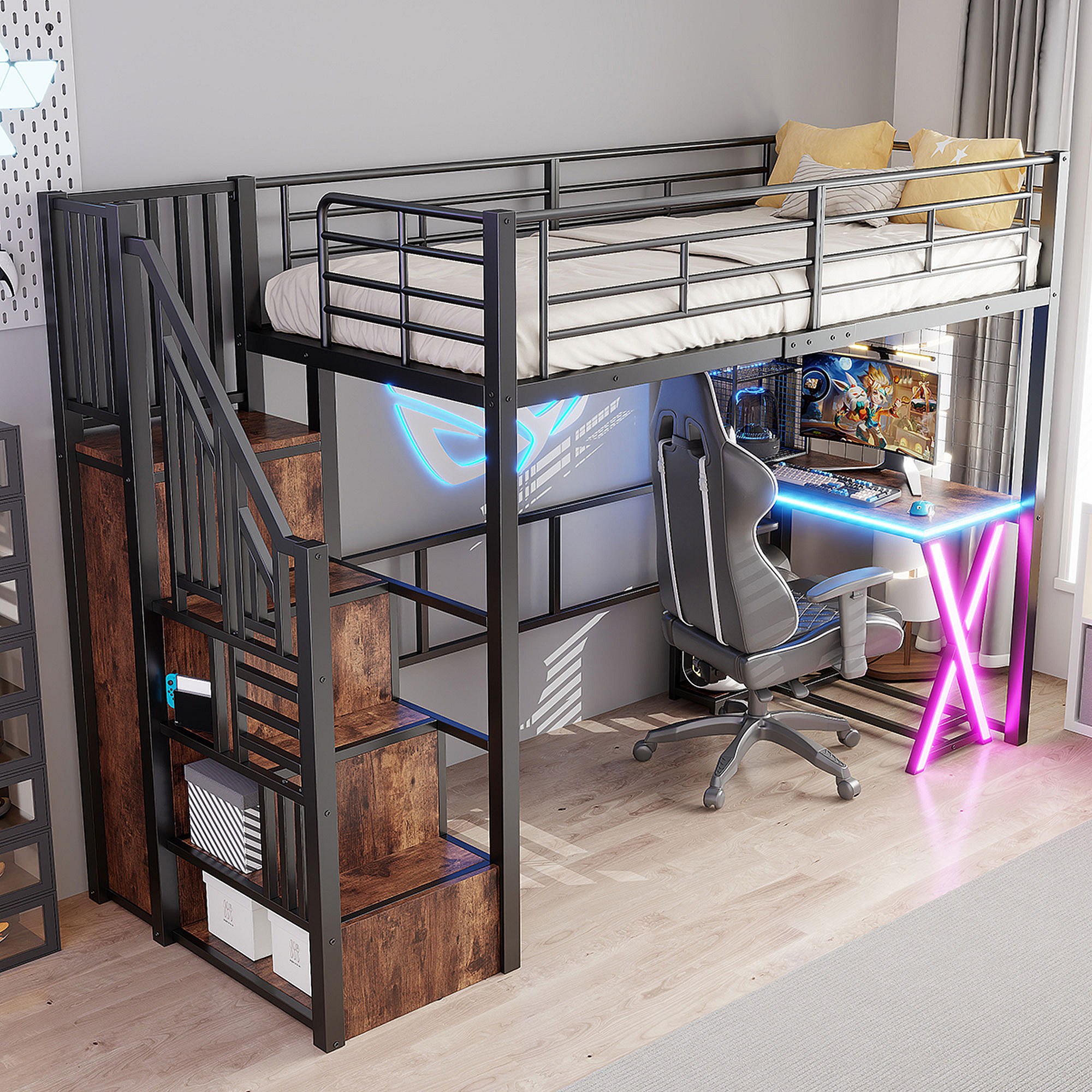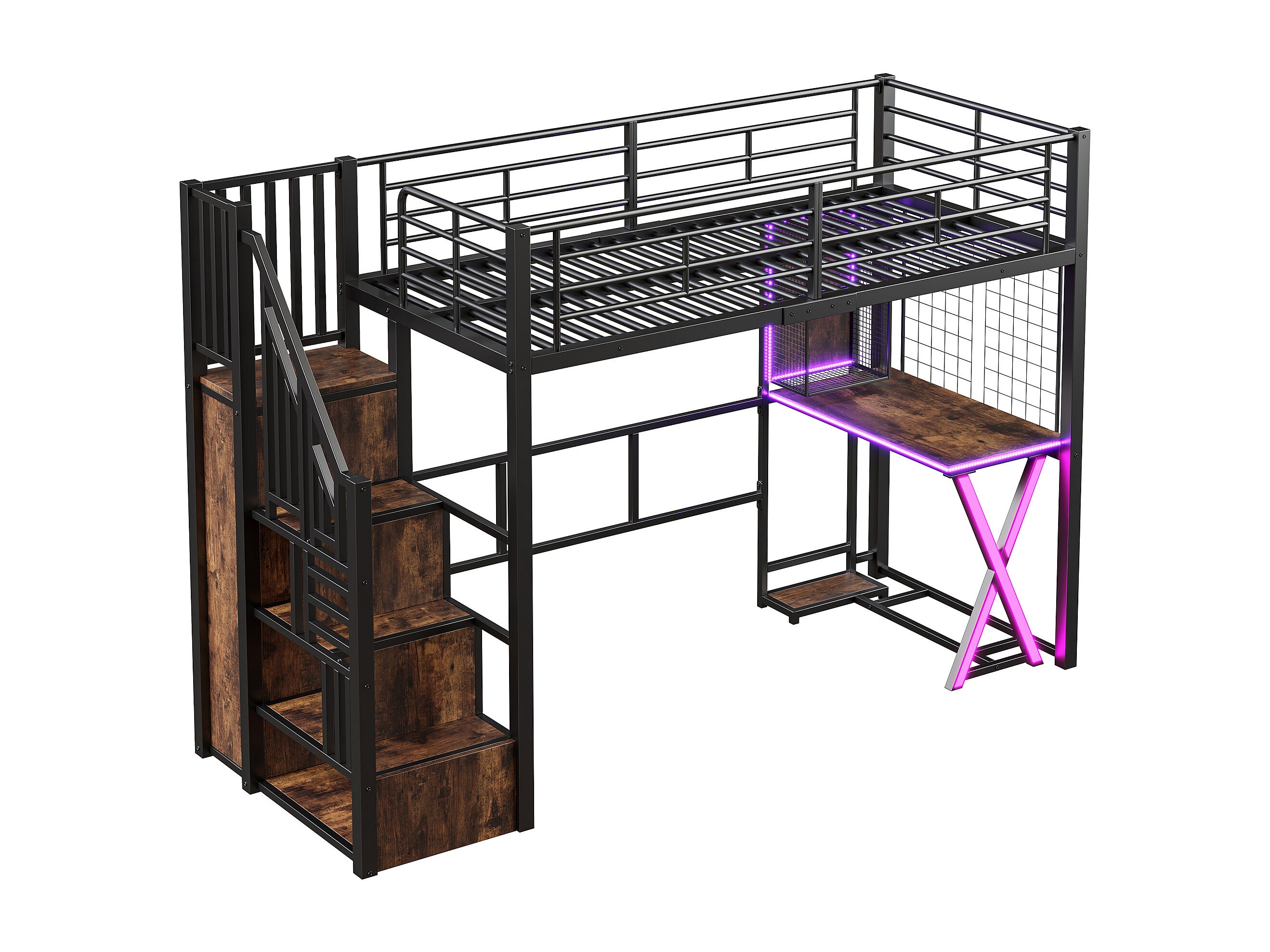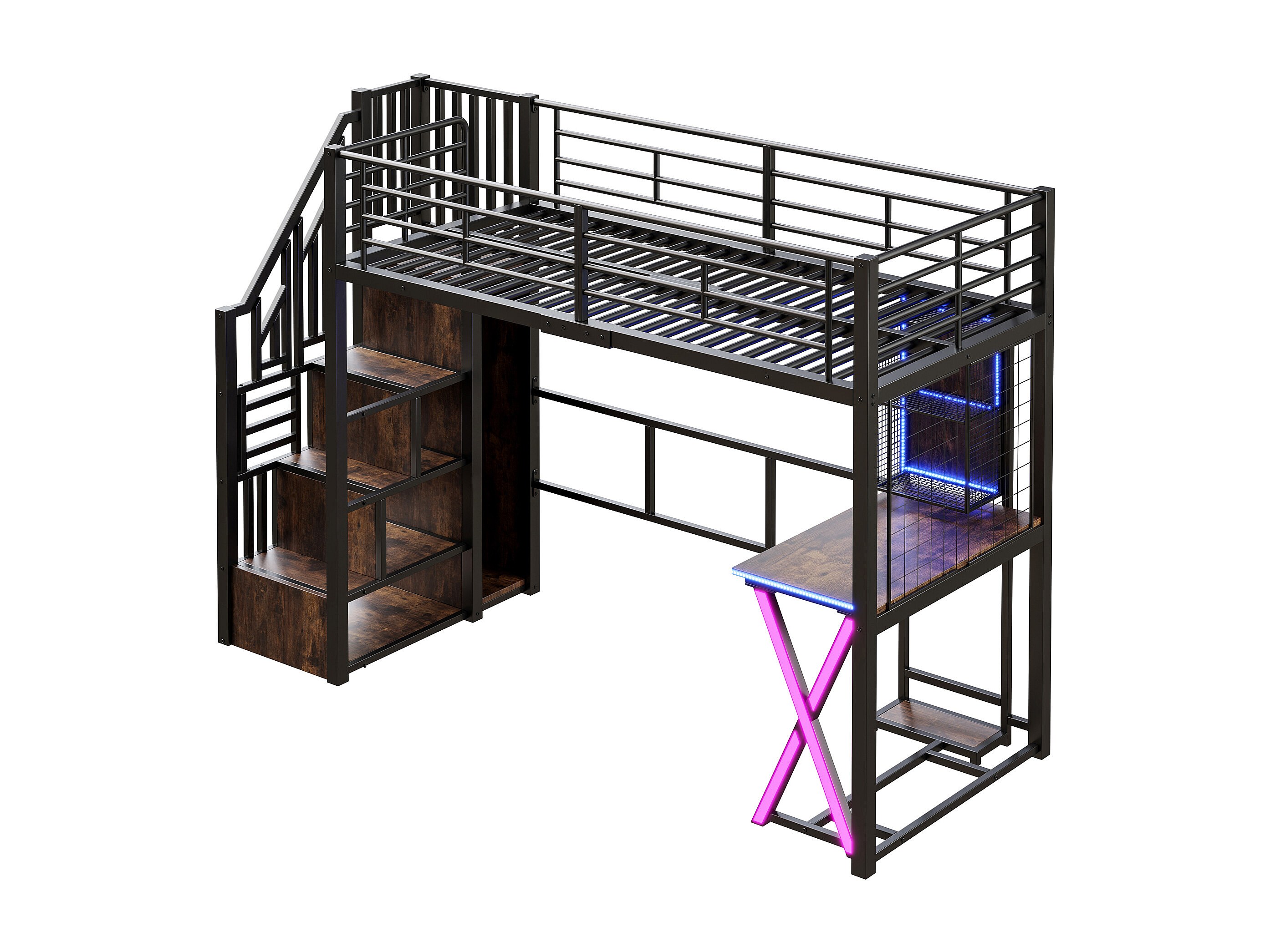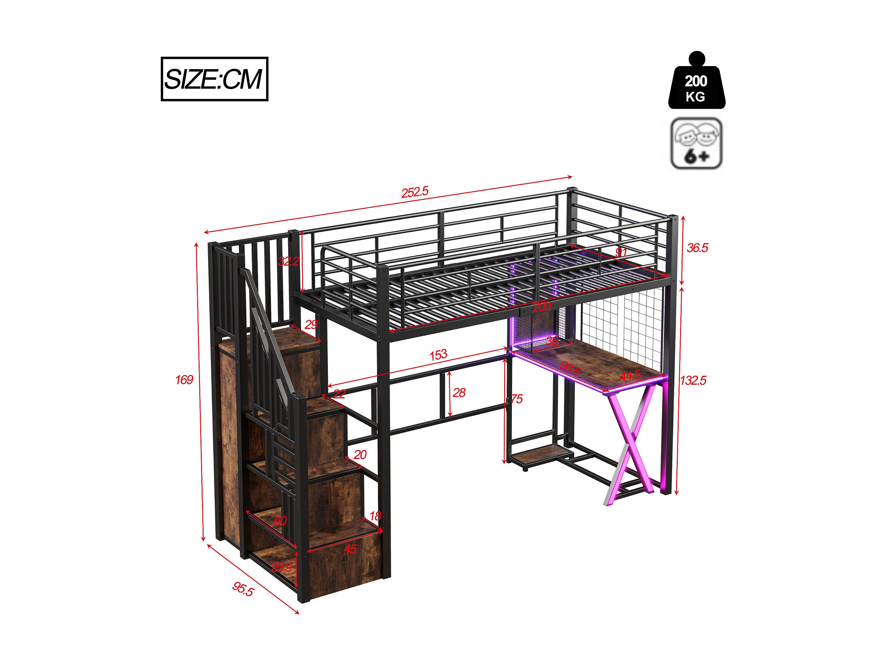 Lit mezzanine 90x200cm avec LED - bureau + penderie + échelle de rangement - Noir