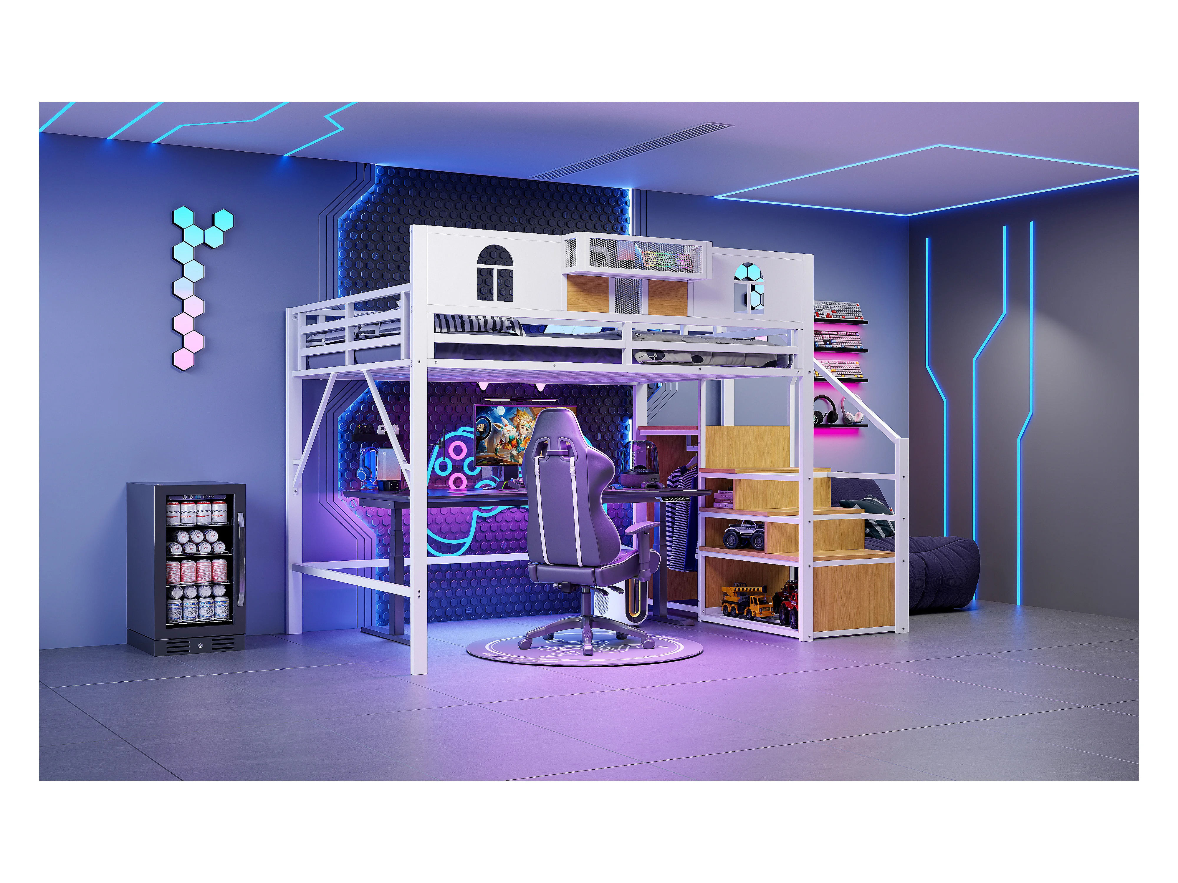 Lit mezzanine en métal - 140 x 200 cm - avec échelle de rangement + fenêtre + barrières - blanc