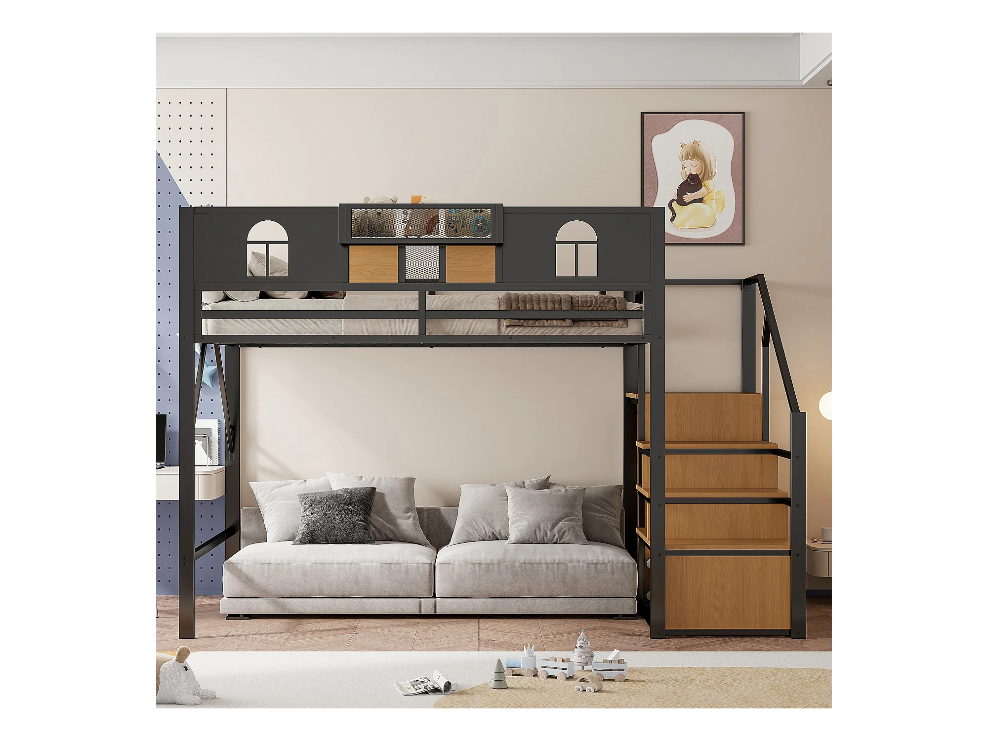 Lit mezzanine en métal - 140 x 200 cm - avec échelle de rangement + fenêtre + barrières - noir