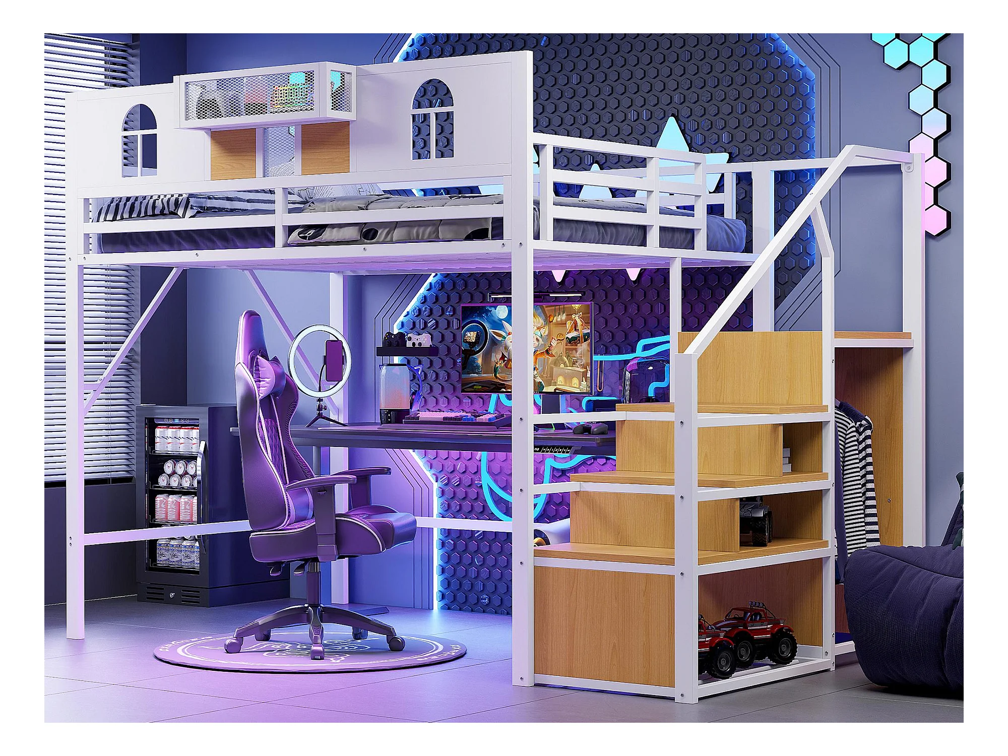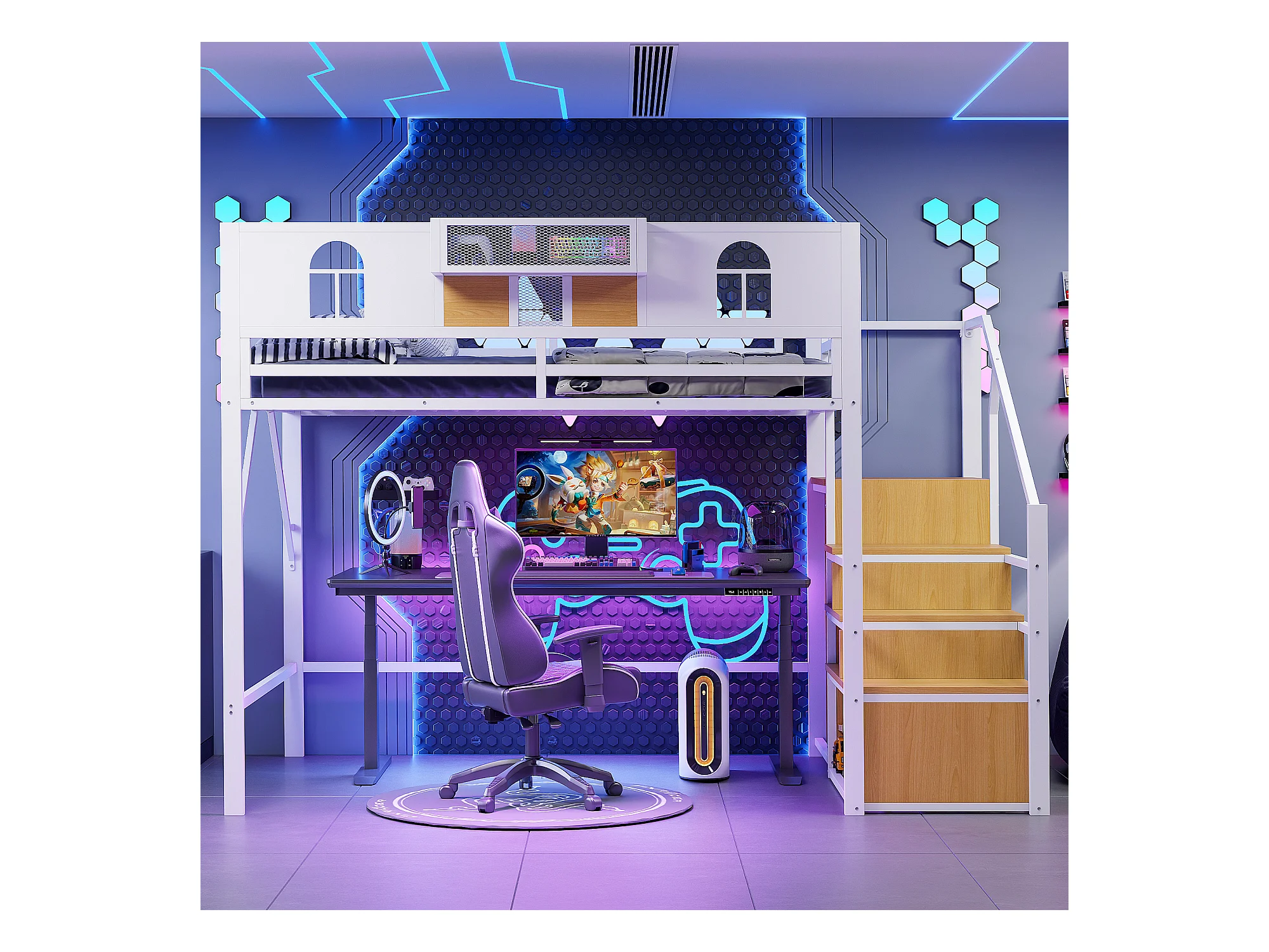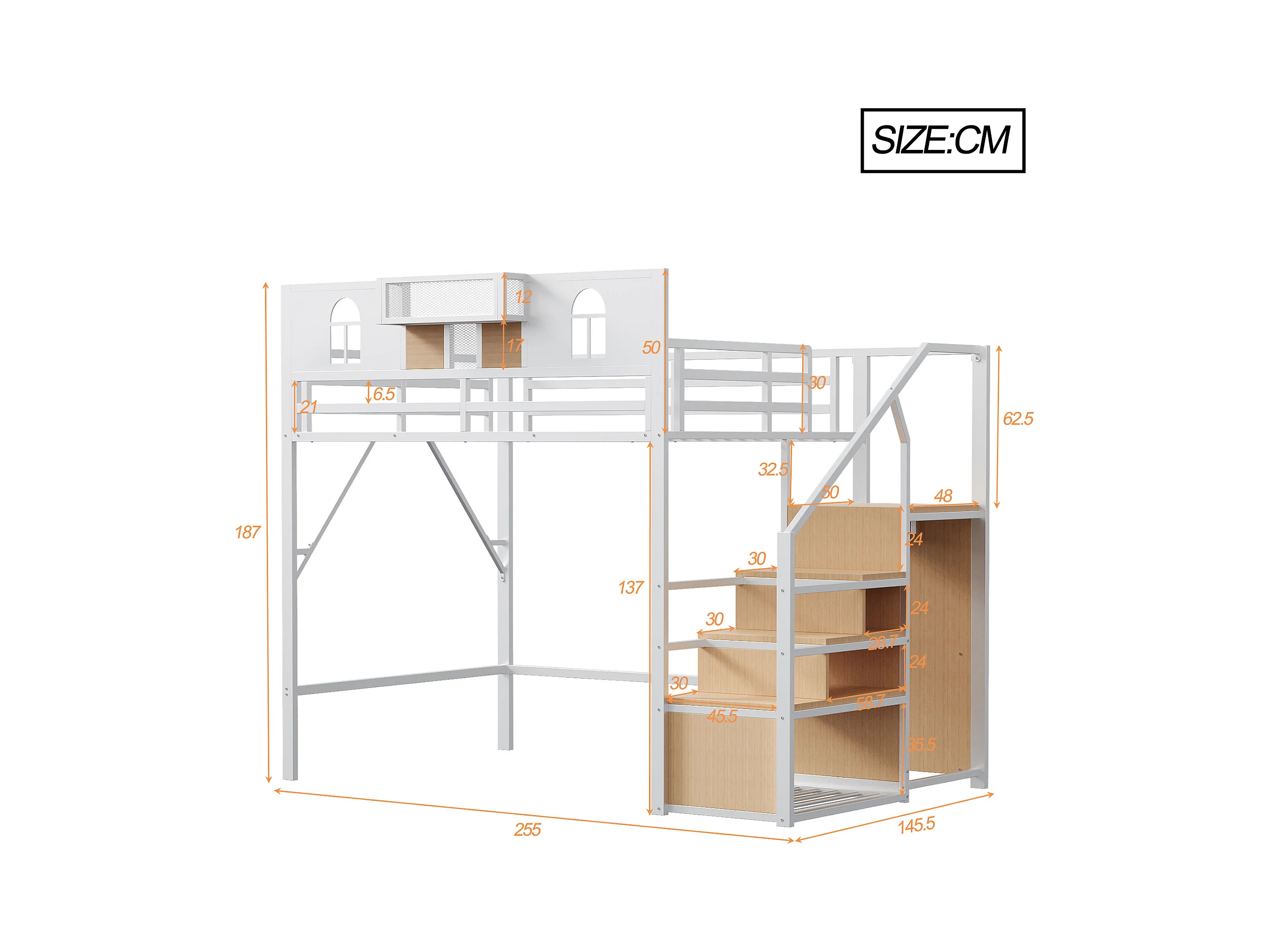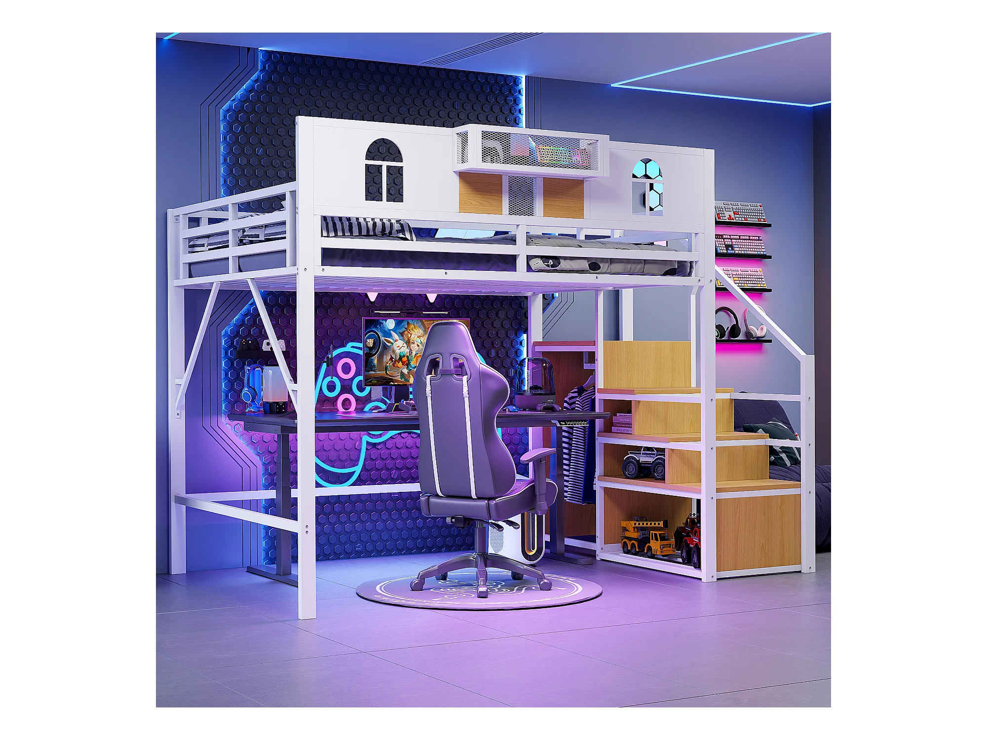 Lit mezzanine en métal 140x200 cm - avec échelle de rangement - avec barrières de sécurité - avec armoire ouverte - blanc