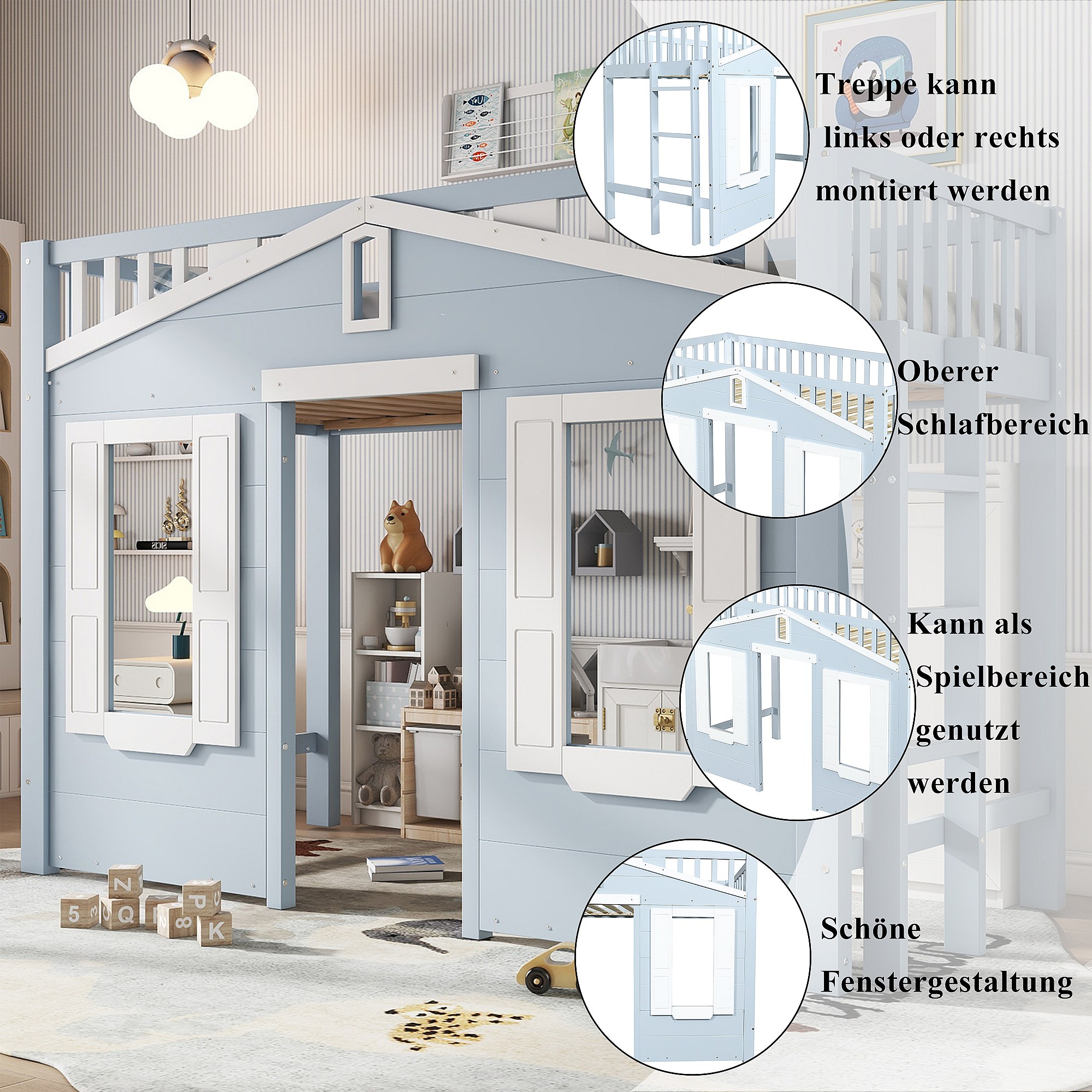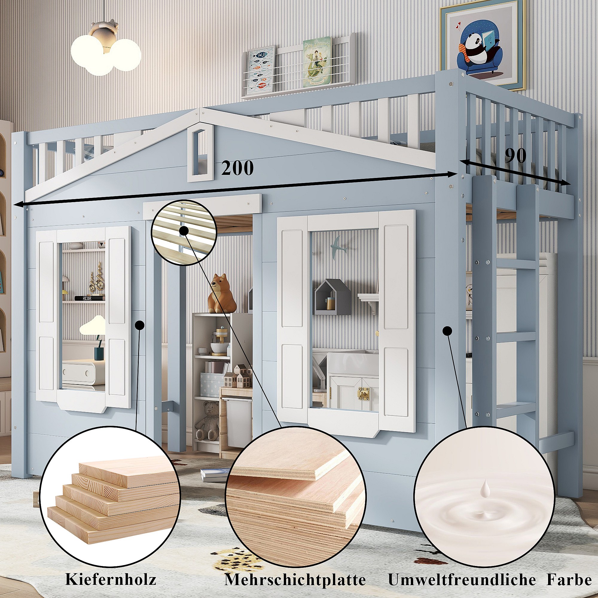 Lit mezzanine enfant - 90 x 200 cm - belle conception de fenêtre + échelle stable - pin + MDF + contreplaqué - bleu