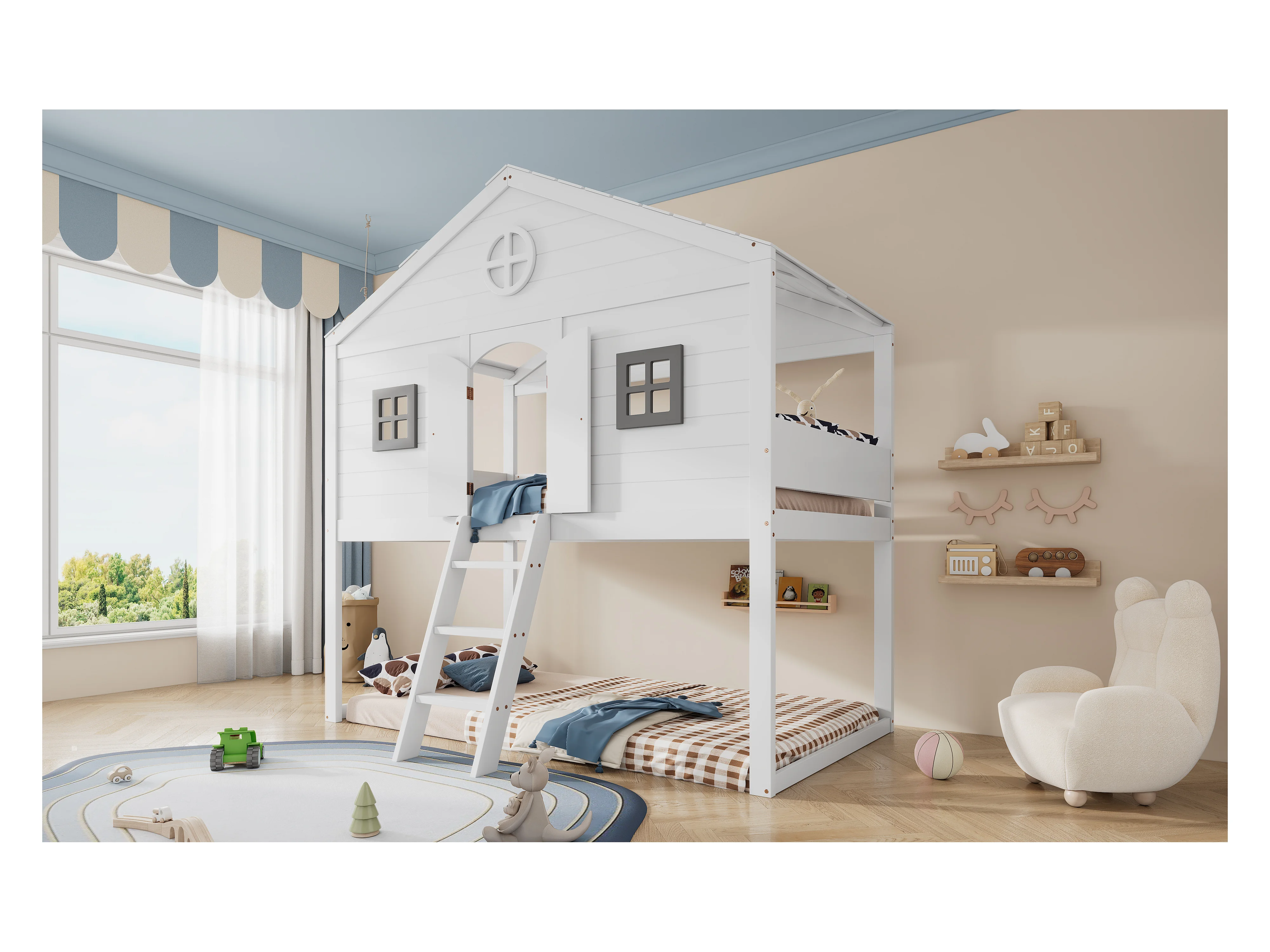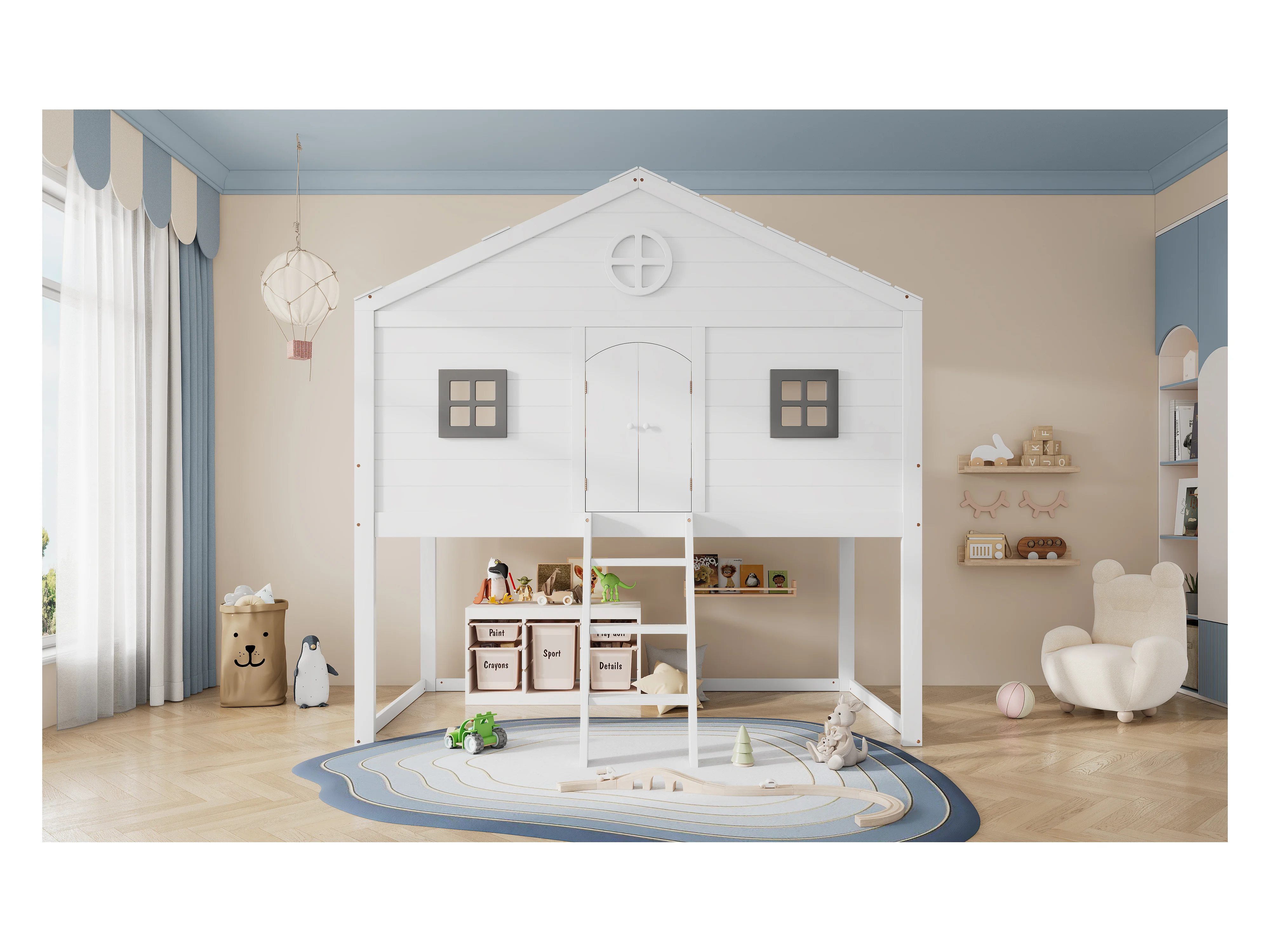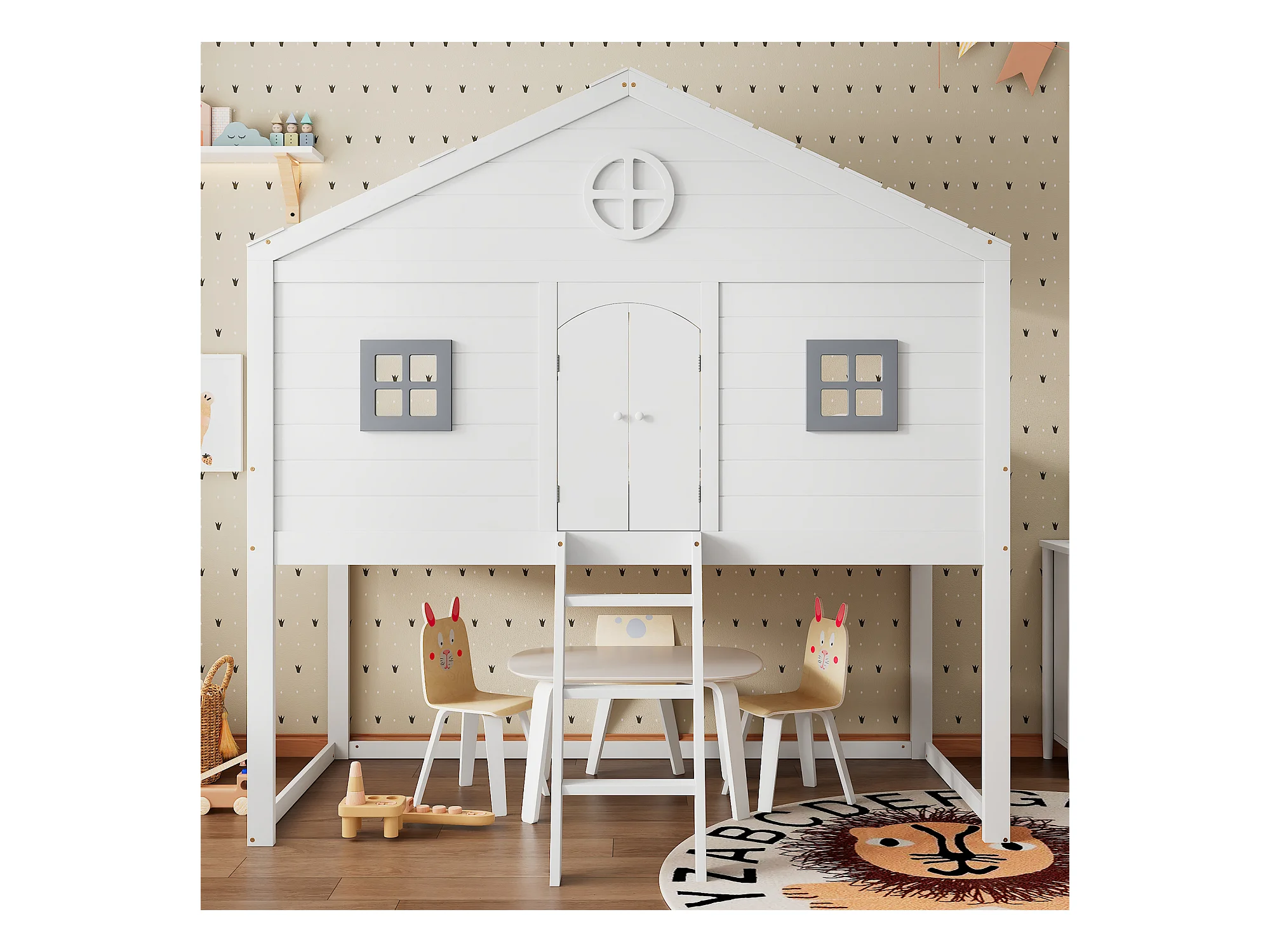 Lit Mezzanine Multifonctionnel 90x200 cm avec échelles et 2 Fenêtres, avec Sommier à Lattes, Blanc