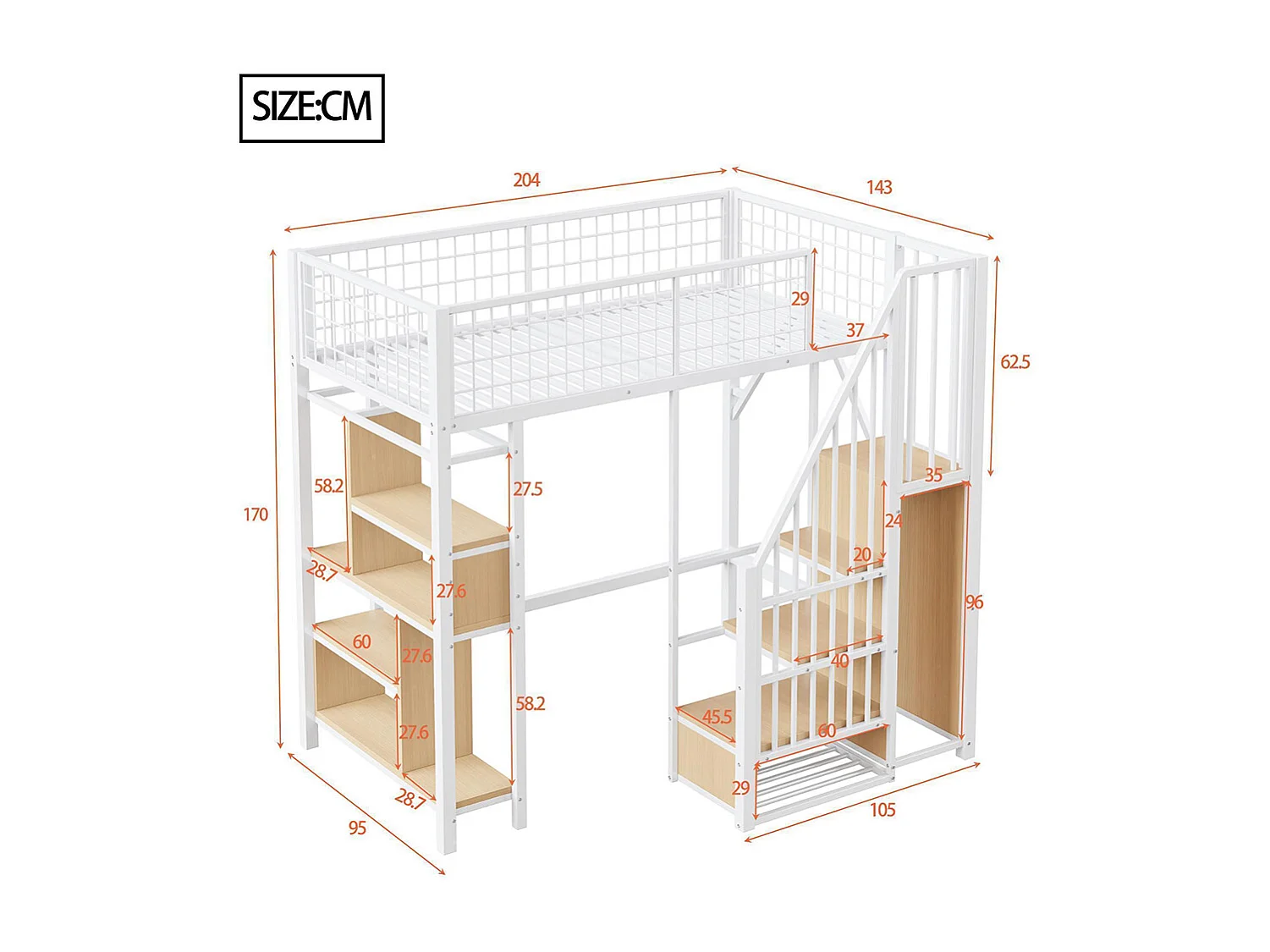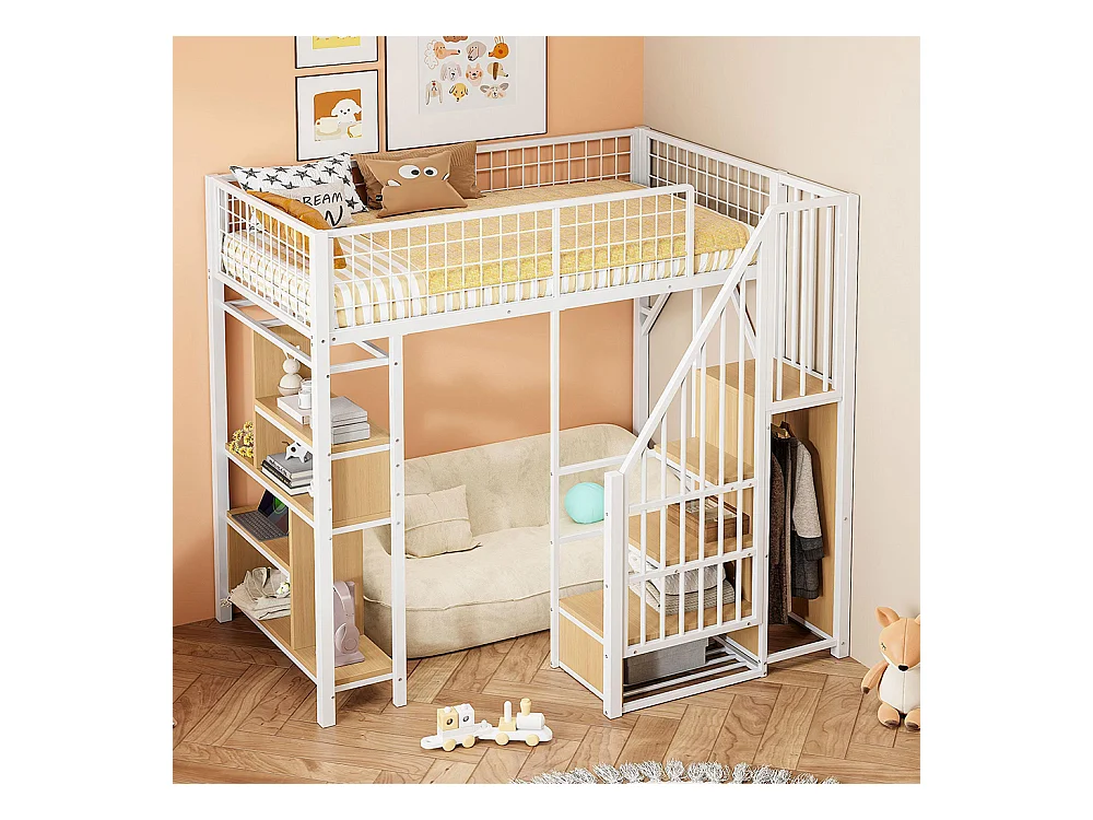 Lit mezzanine multifonctionnel 90x200 cm en métal avec rangement étagères escalier pour adulte et enfant blanc