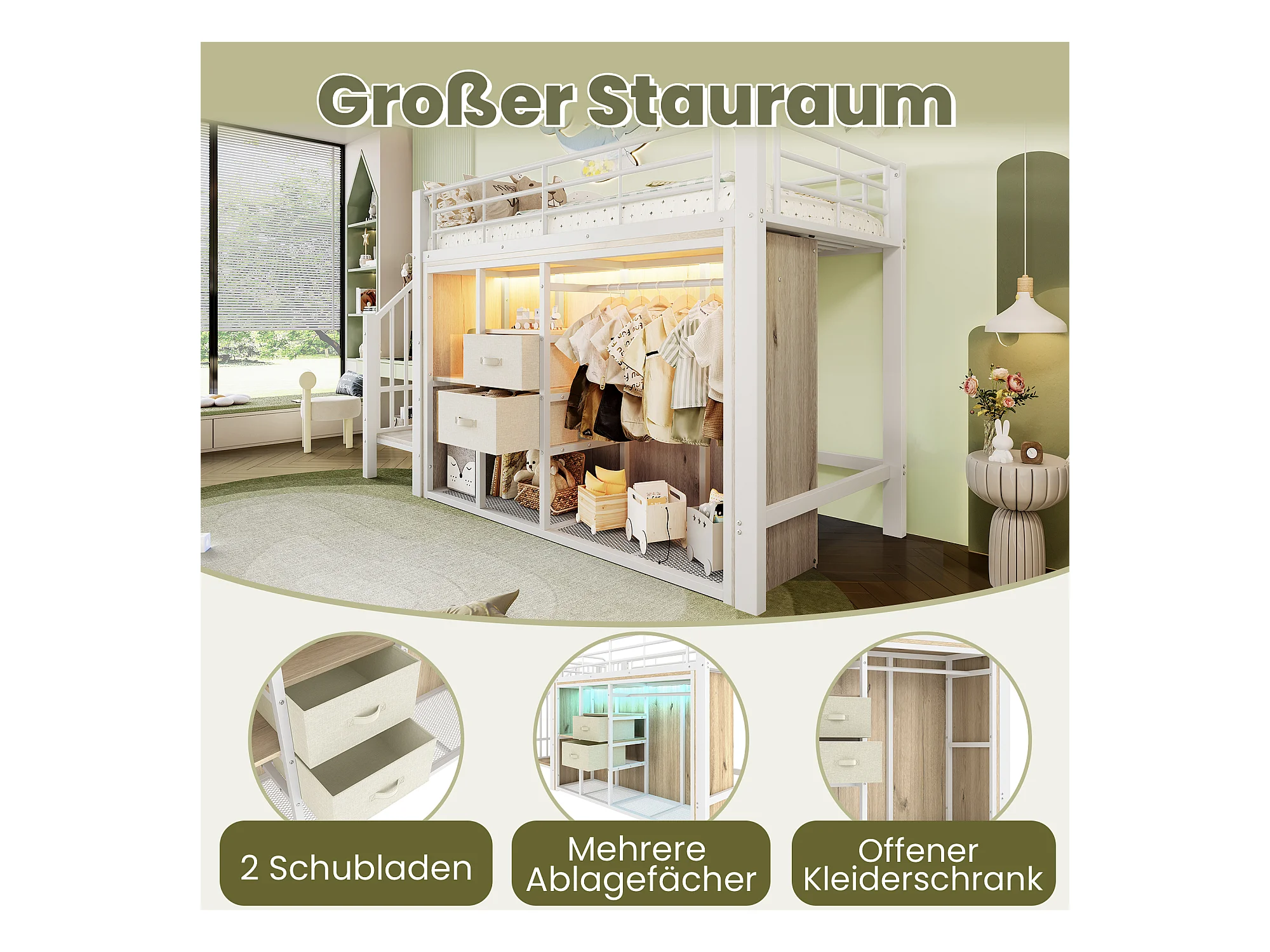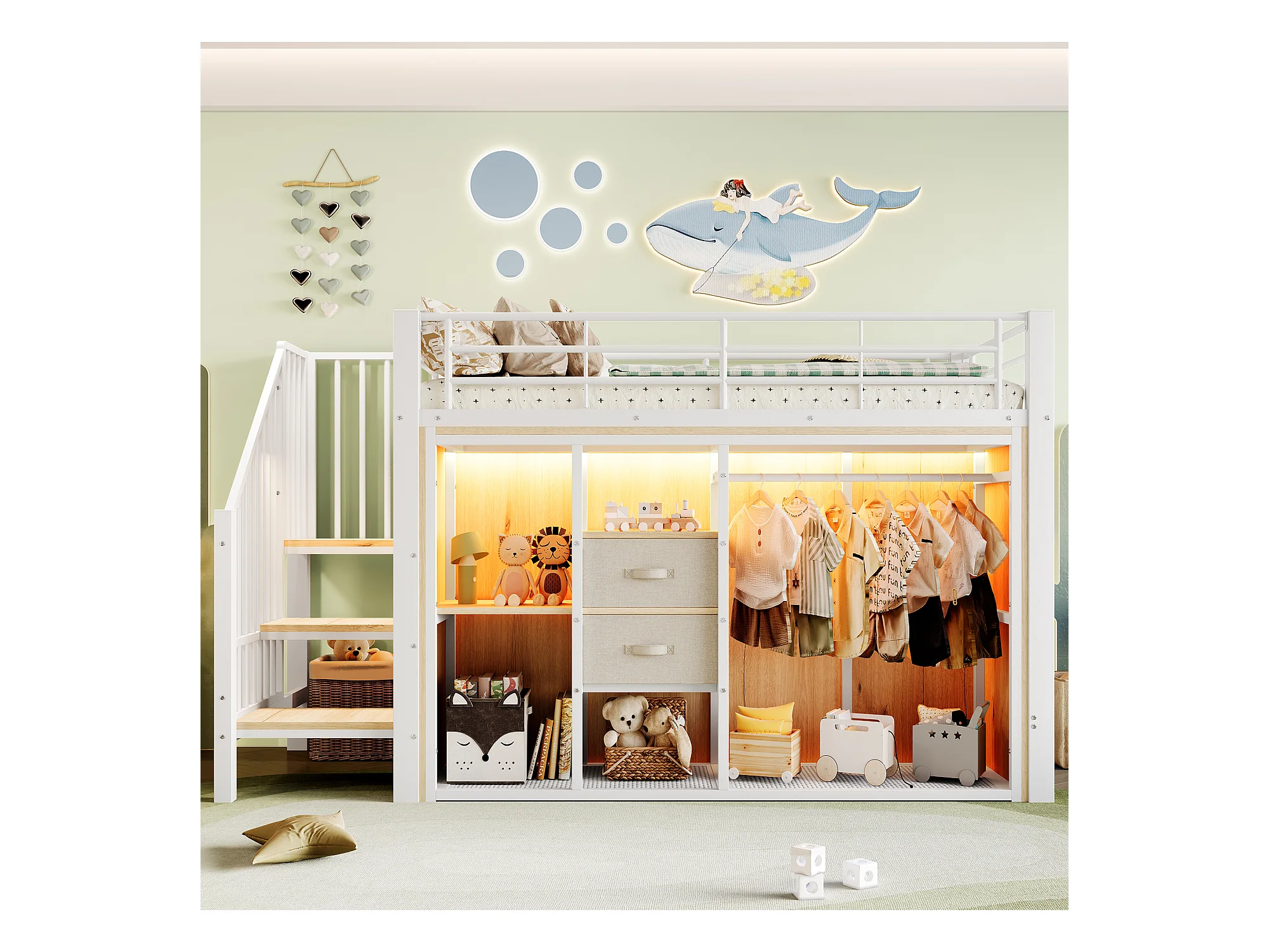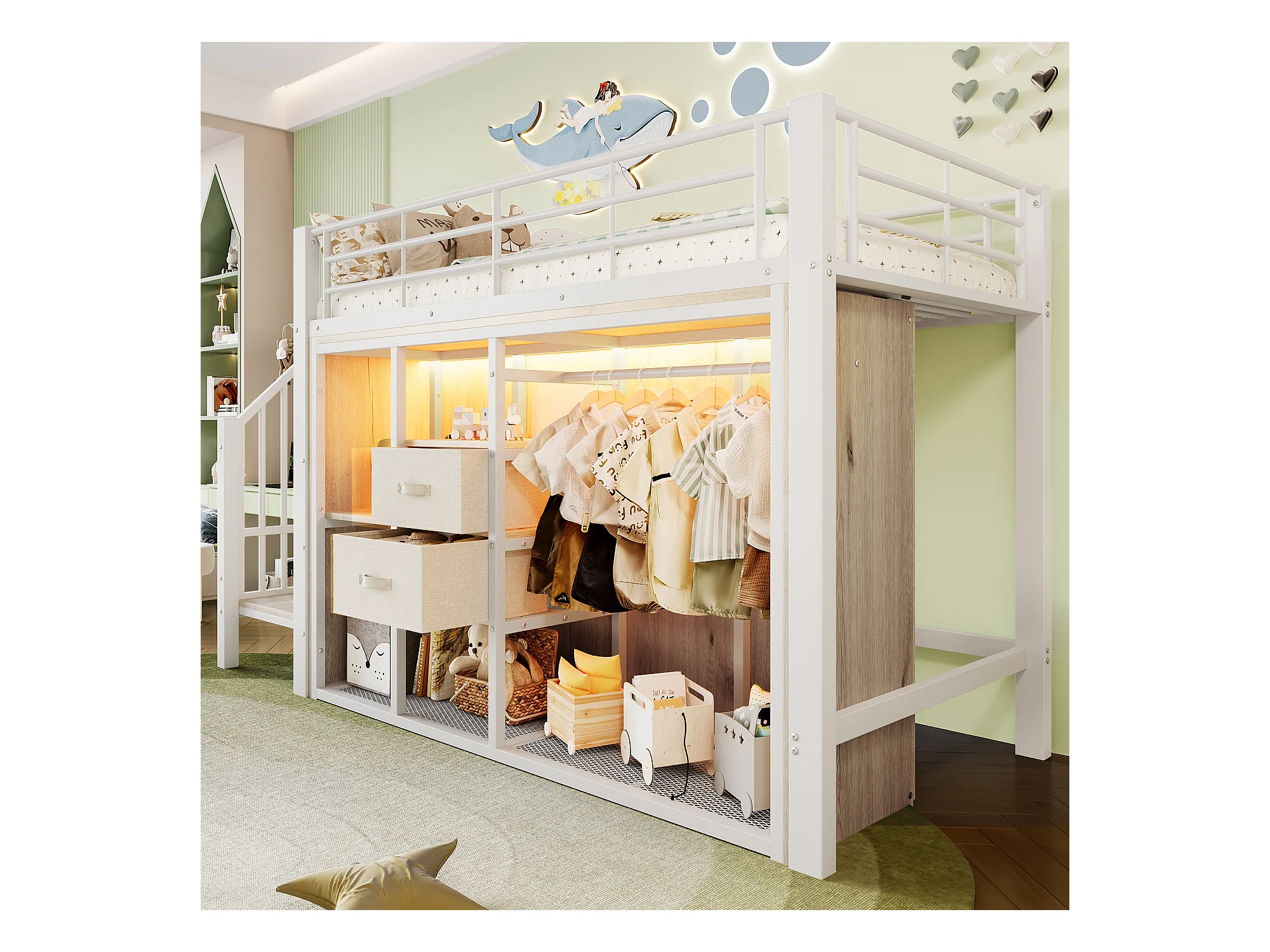 lit mezzanine pour enfant - 90 x 200 cm - avec 2 tiroirs + armoire ouverte + Leds - métal - blanc