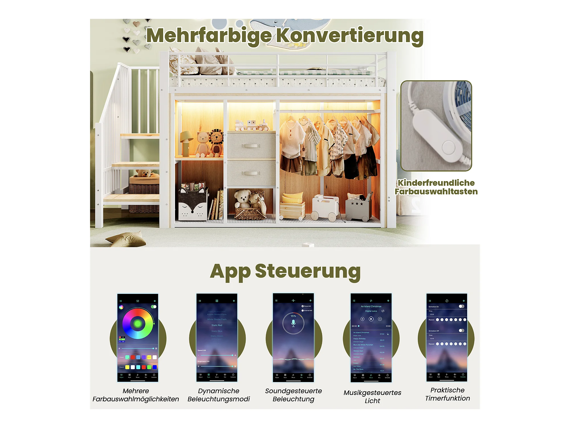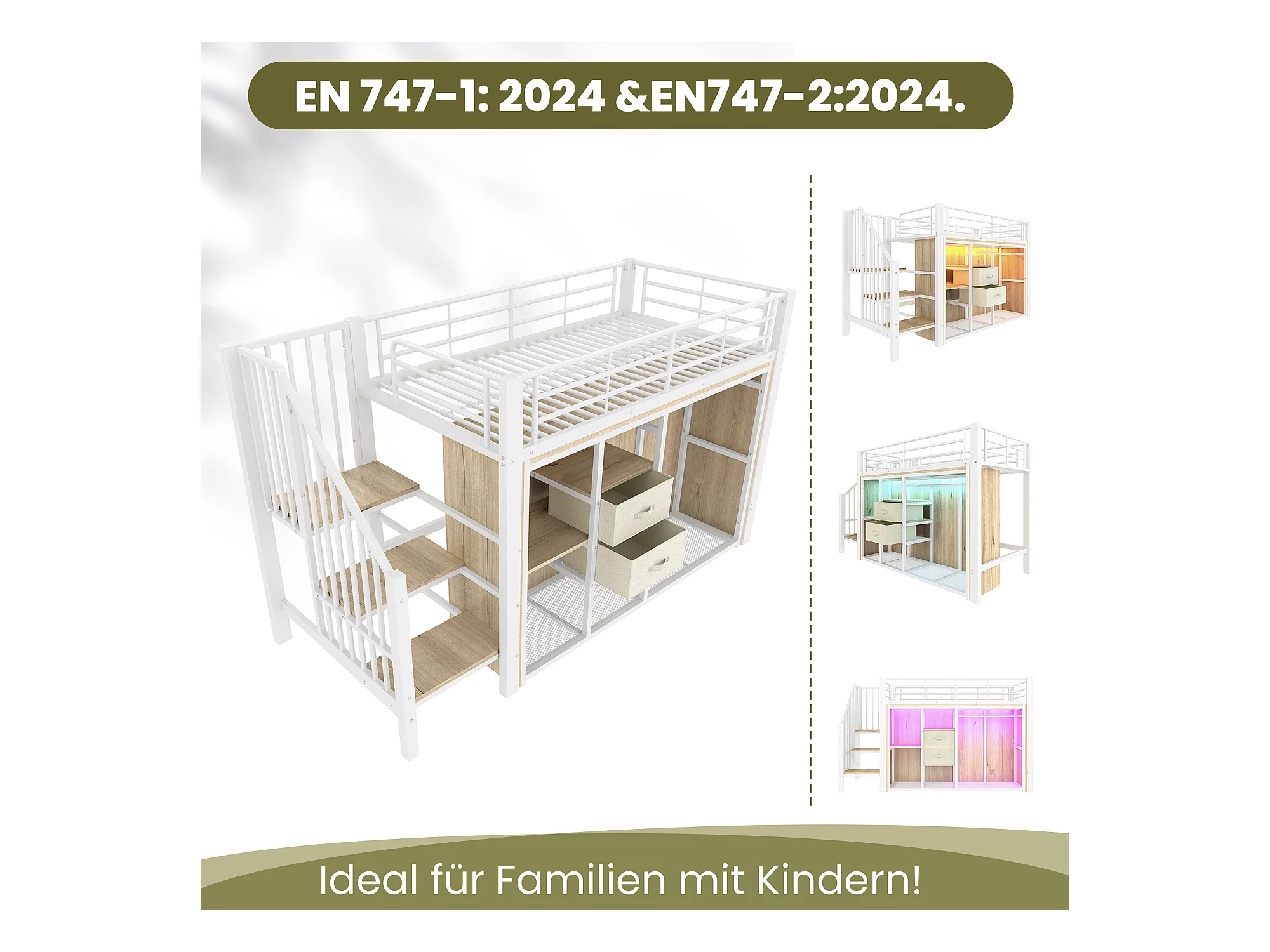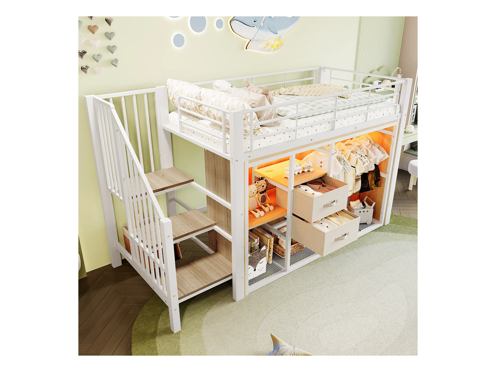 lit mezzanine pour enfant - 90 x 200 cm - avec 2 tiroirs + armoire ouverte + Leds - métal - blanc
