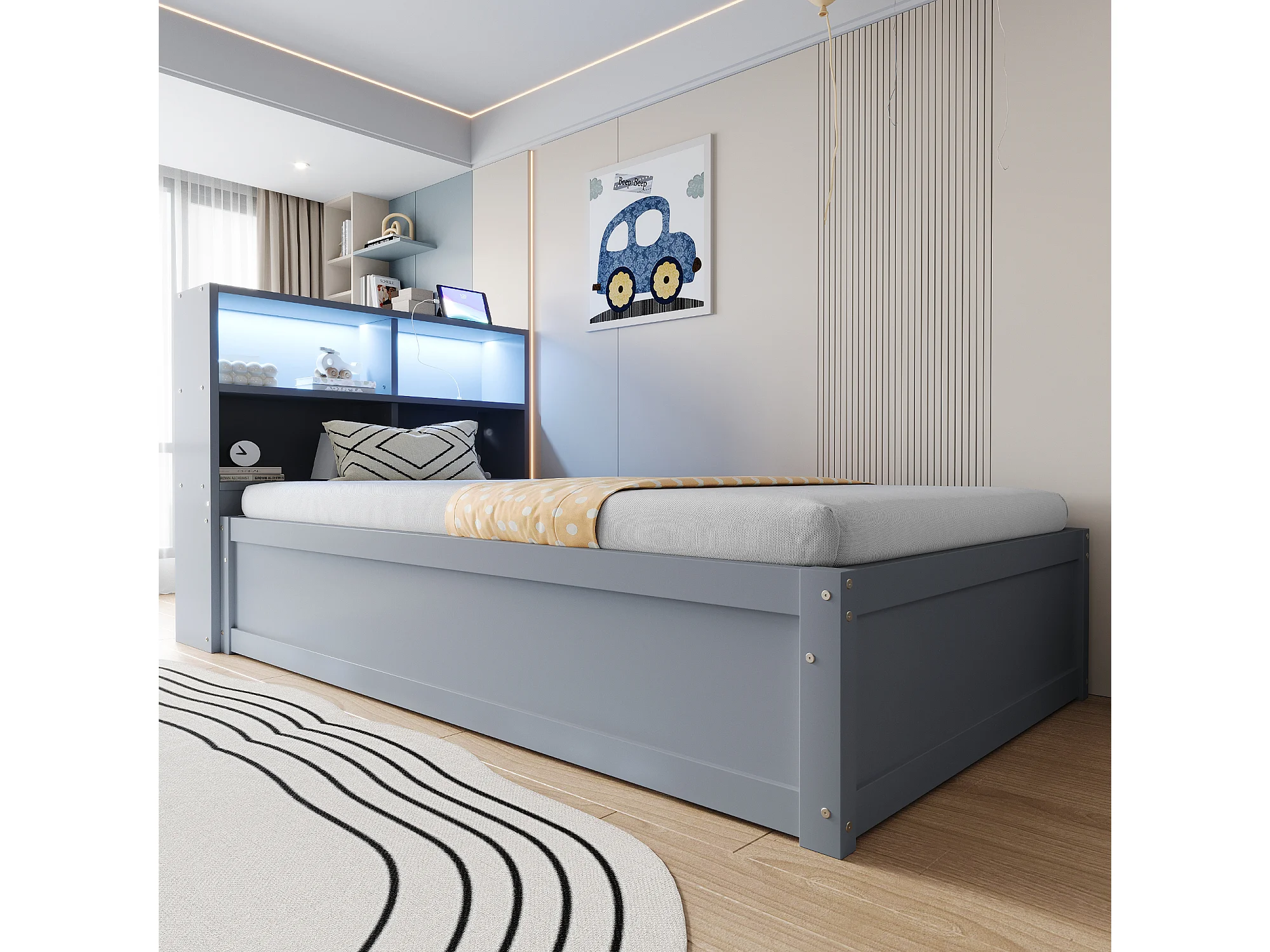 Lit multifonction 90x200 cm, avec prise multiple, rangement, sommier et bande LED, bois massif, gris (220.5x113.5x82 cm)