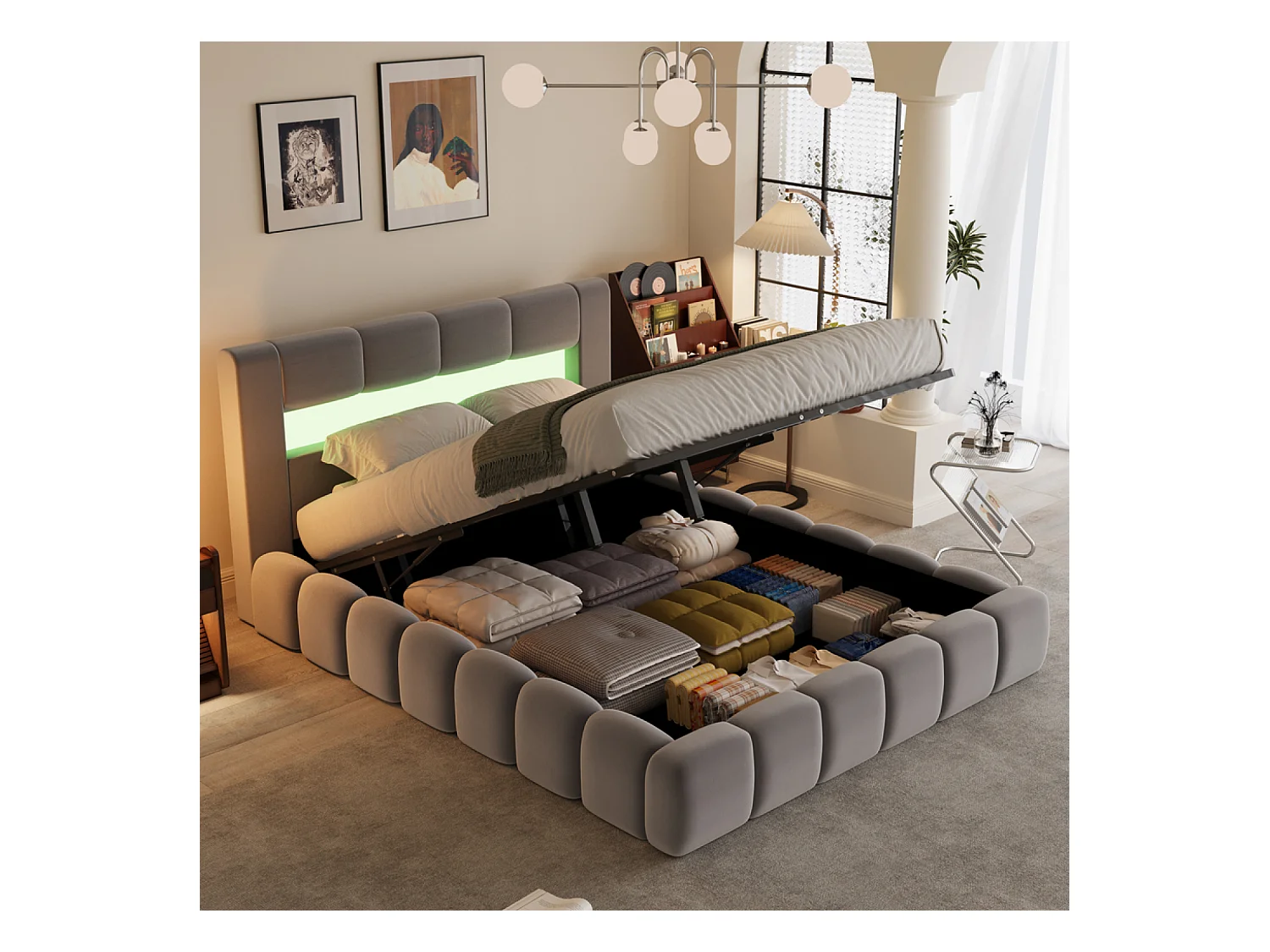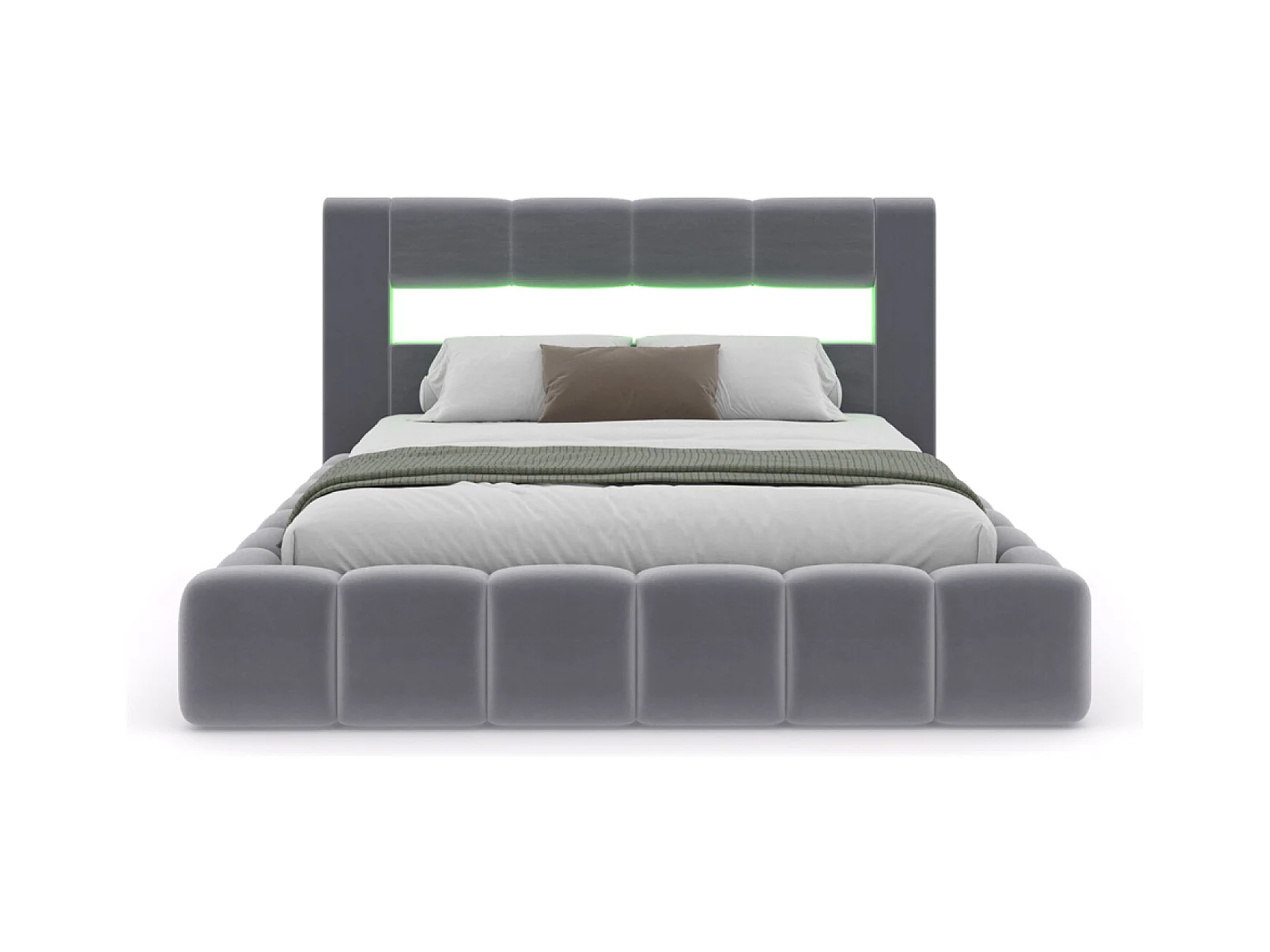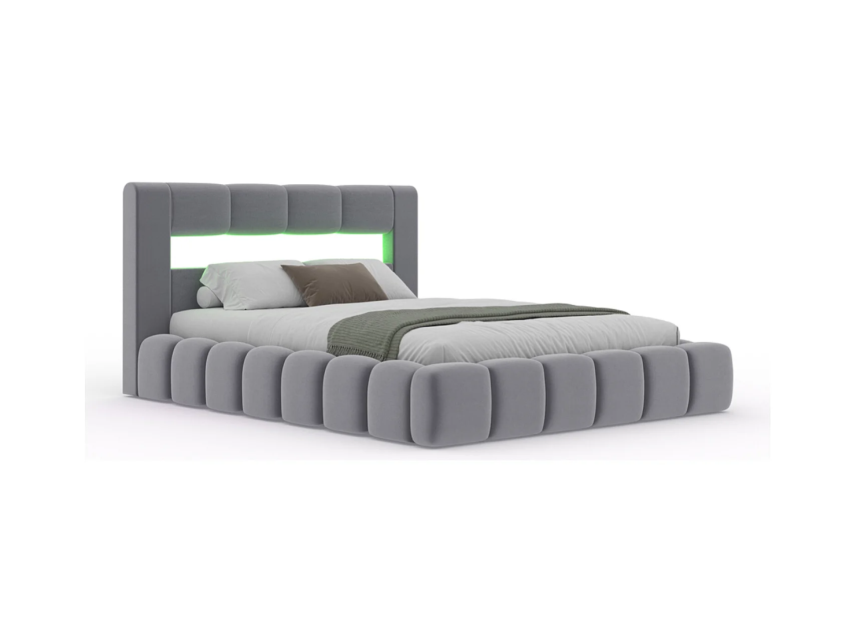 Lit nuage coffre LED 140x190cm velours gris OMAHA