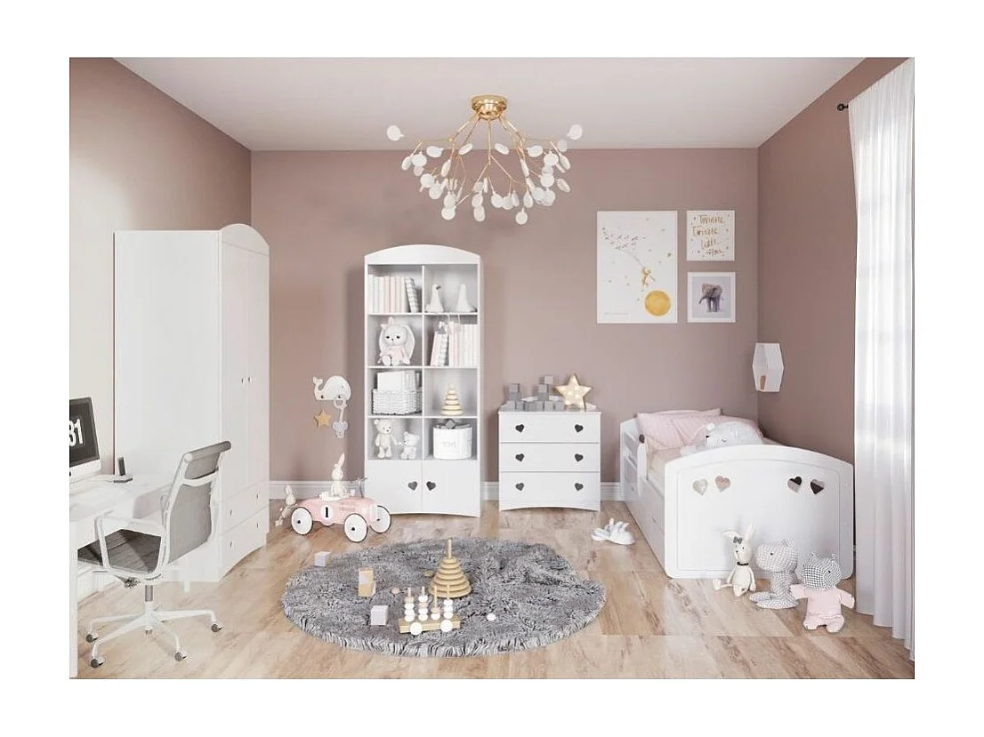Lit orné de cœurs avec barrière de sécurité amovible blanc Myra-Matelas mousse-80x160-Tiroirs Avec tiroir