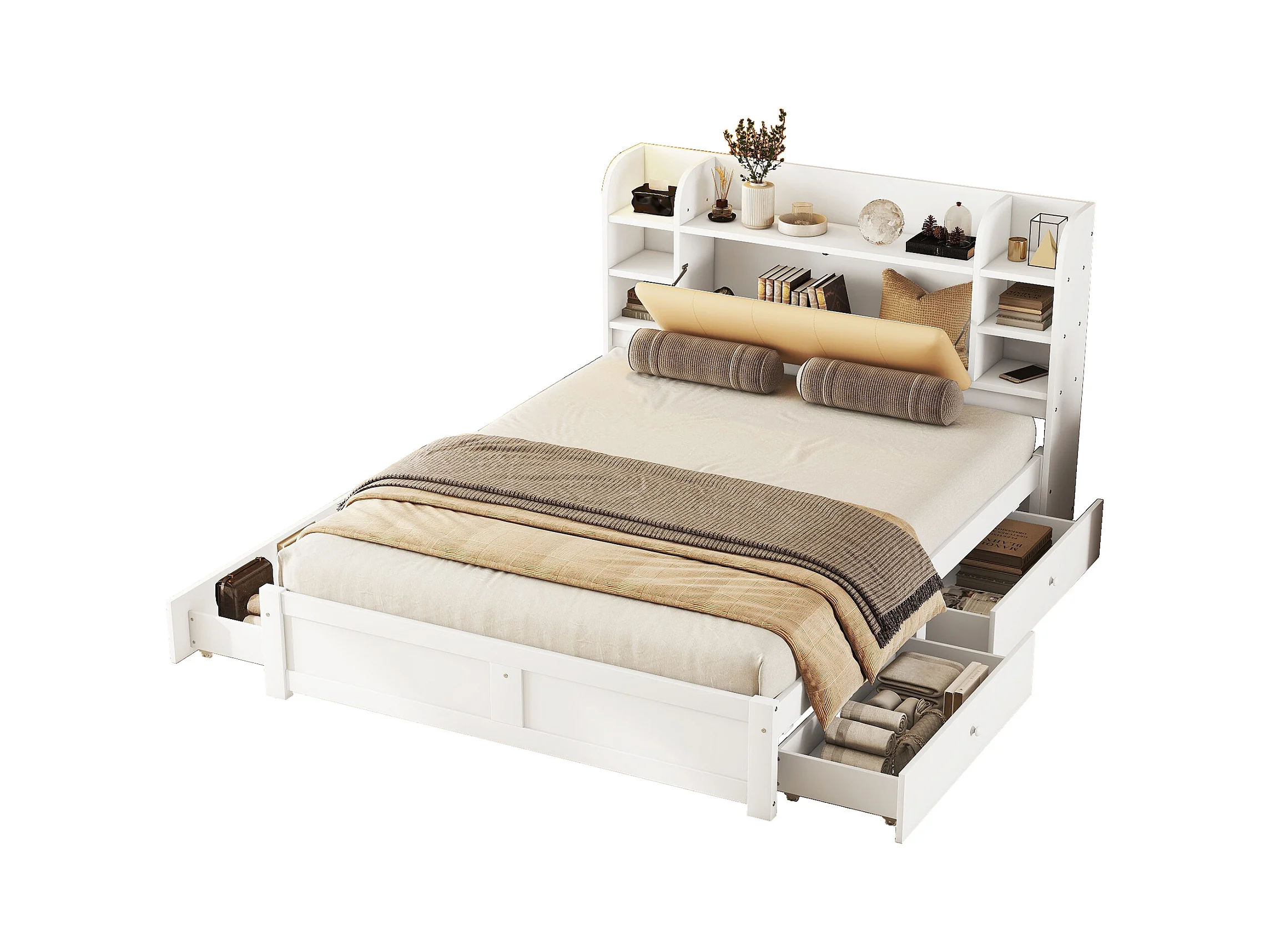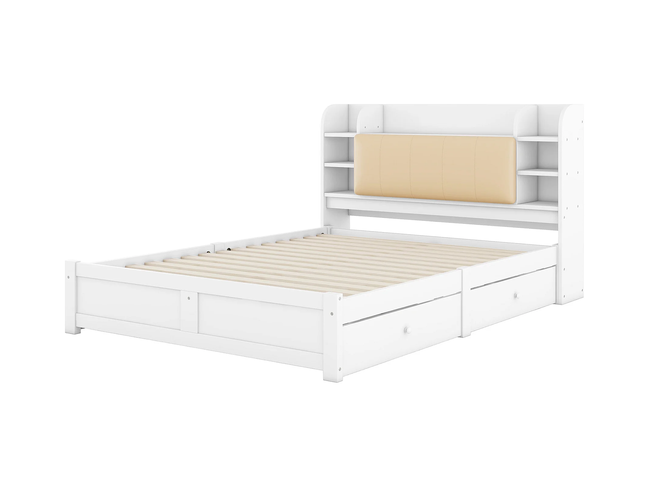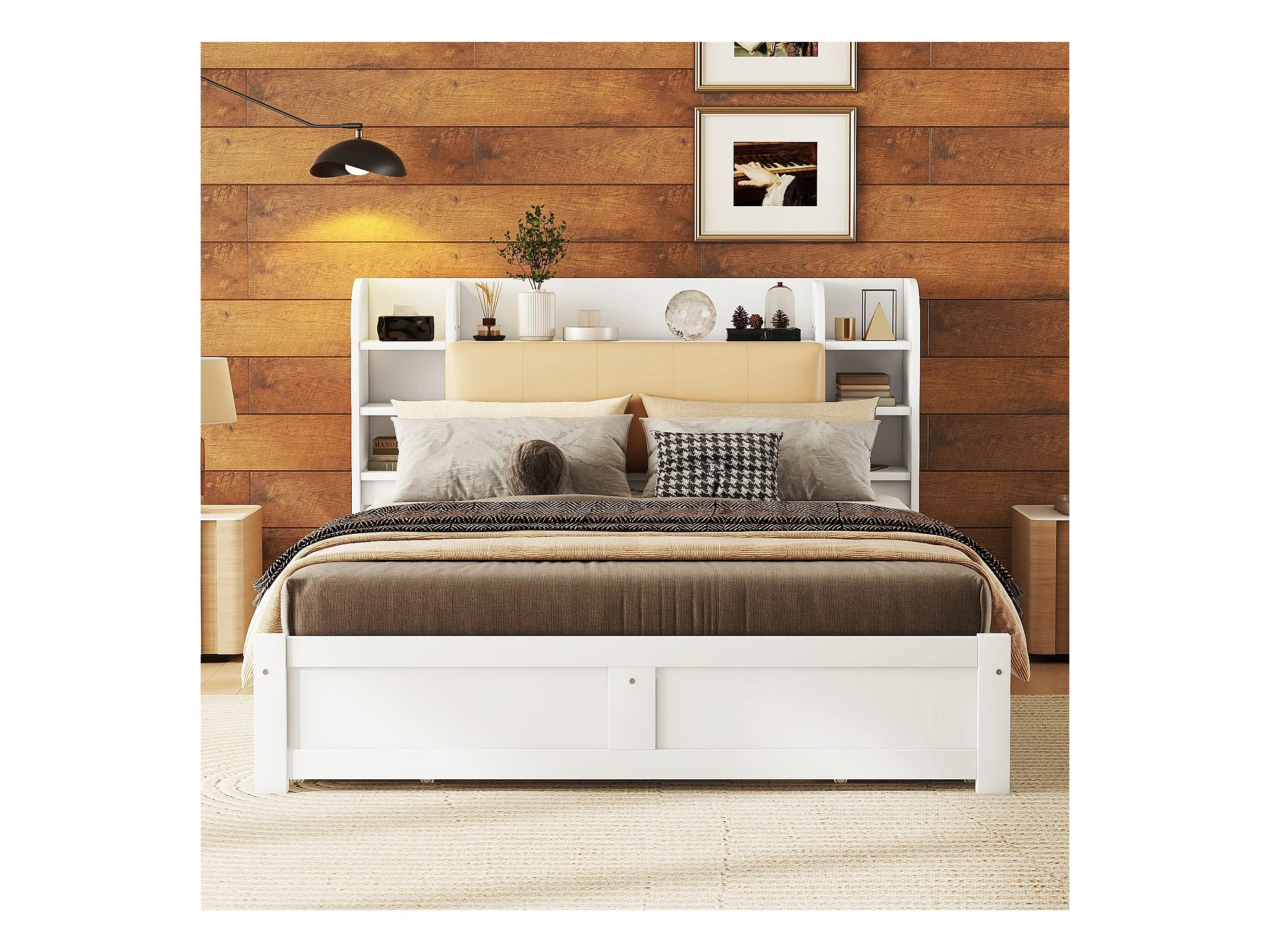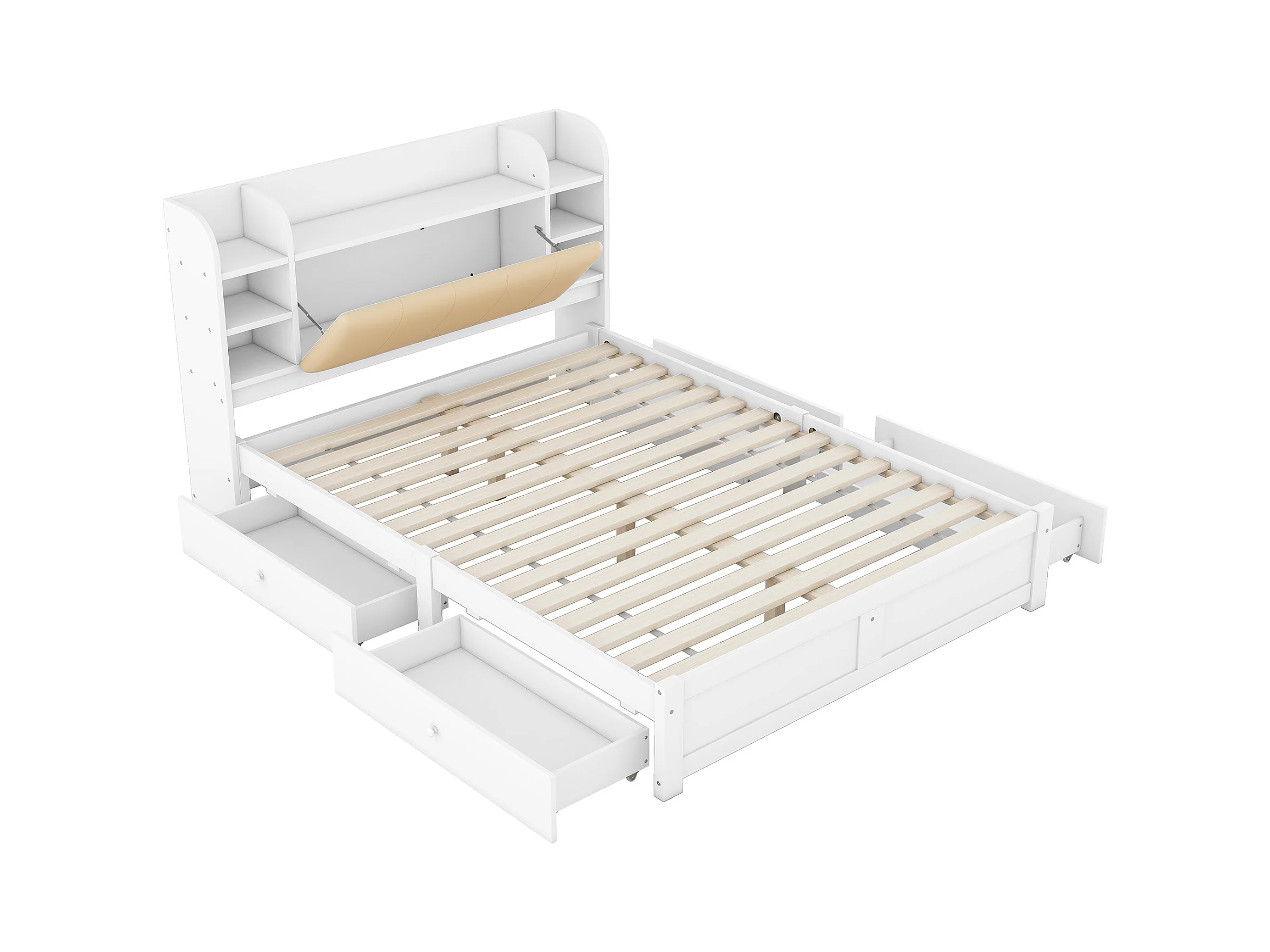 Lit plat 160x200 cm, tête de lit partiellement rabattable, 4 tiroirs, plusieurs compartiments, pin, blanc (226x167.5x110 cm)