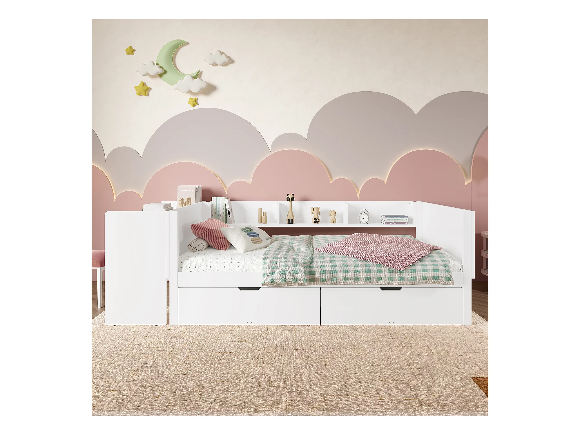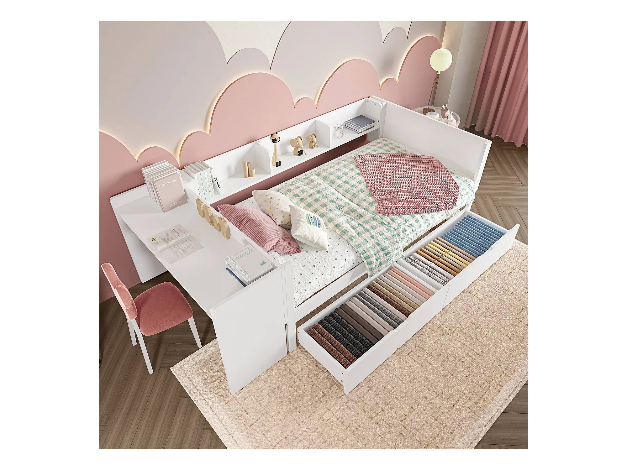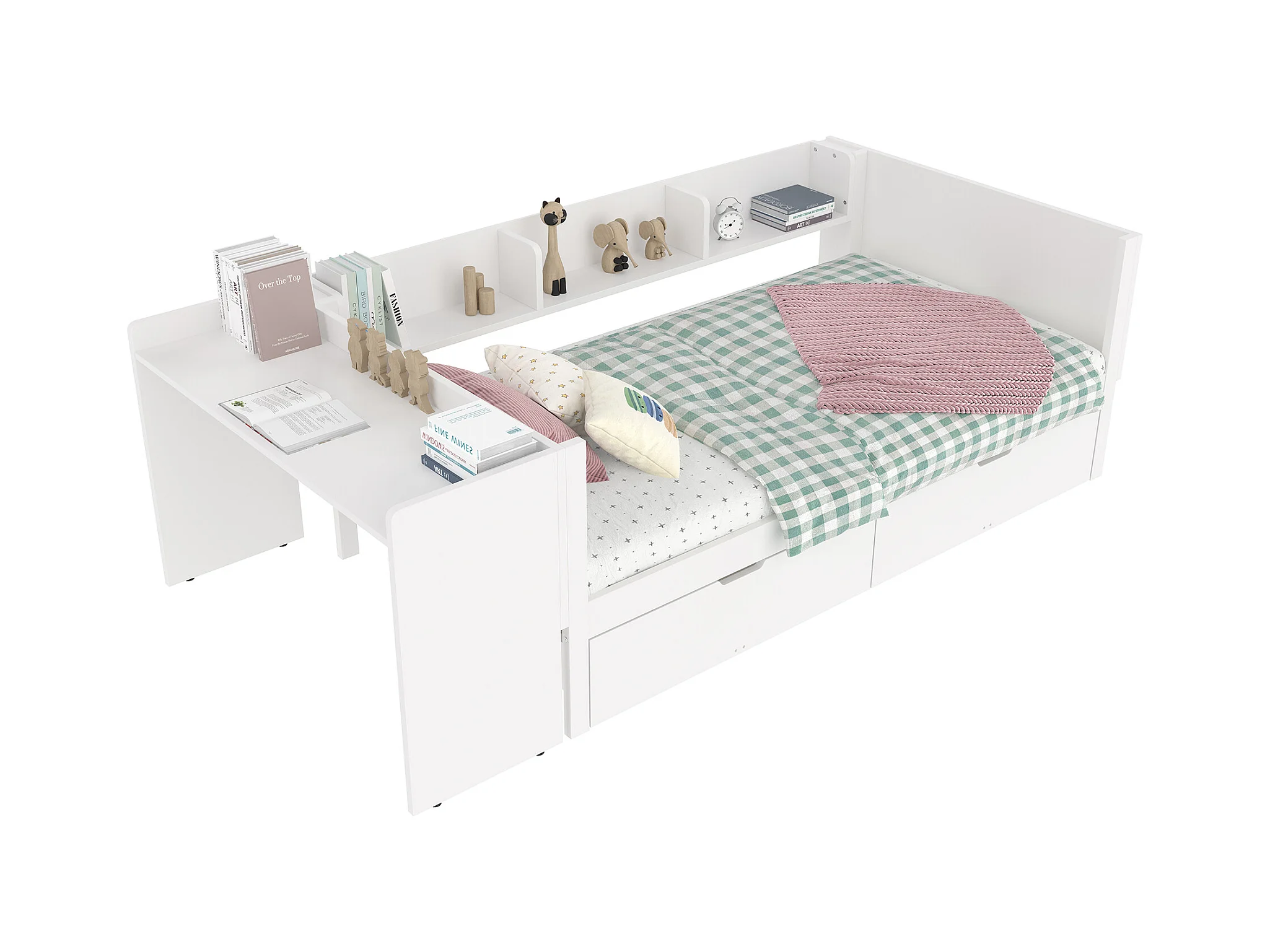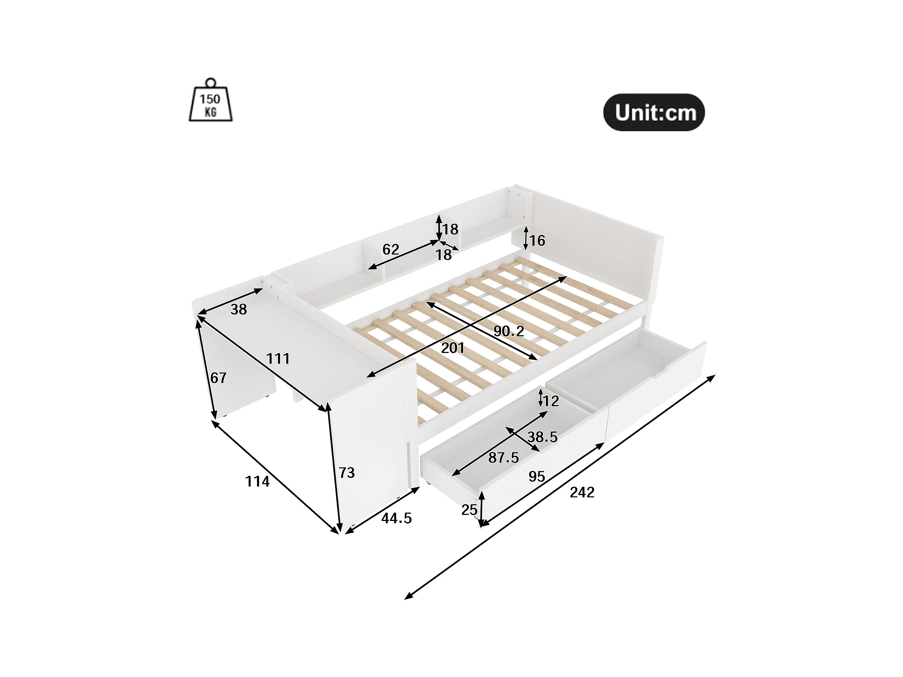 lit plat coffre - 90 x 200 cm - 2 tiroirs + bureau - sans matelas - pin + aggloméré - blanc