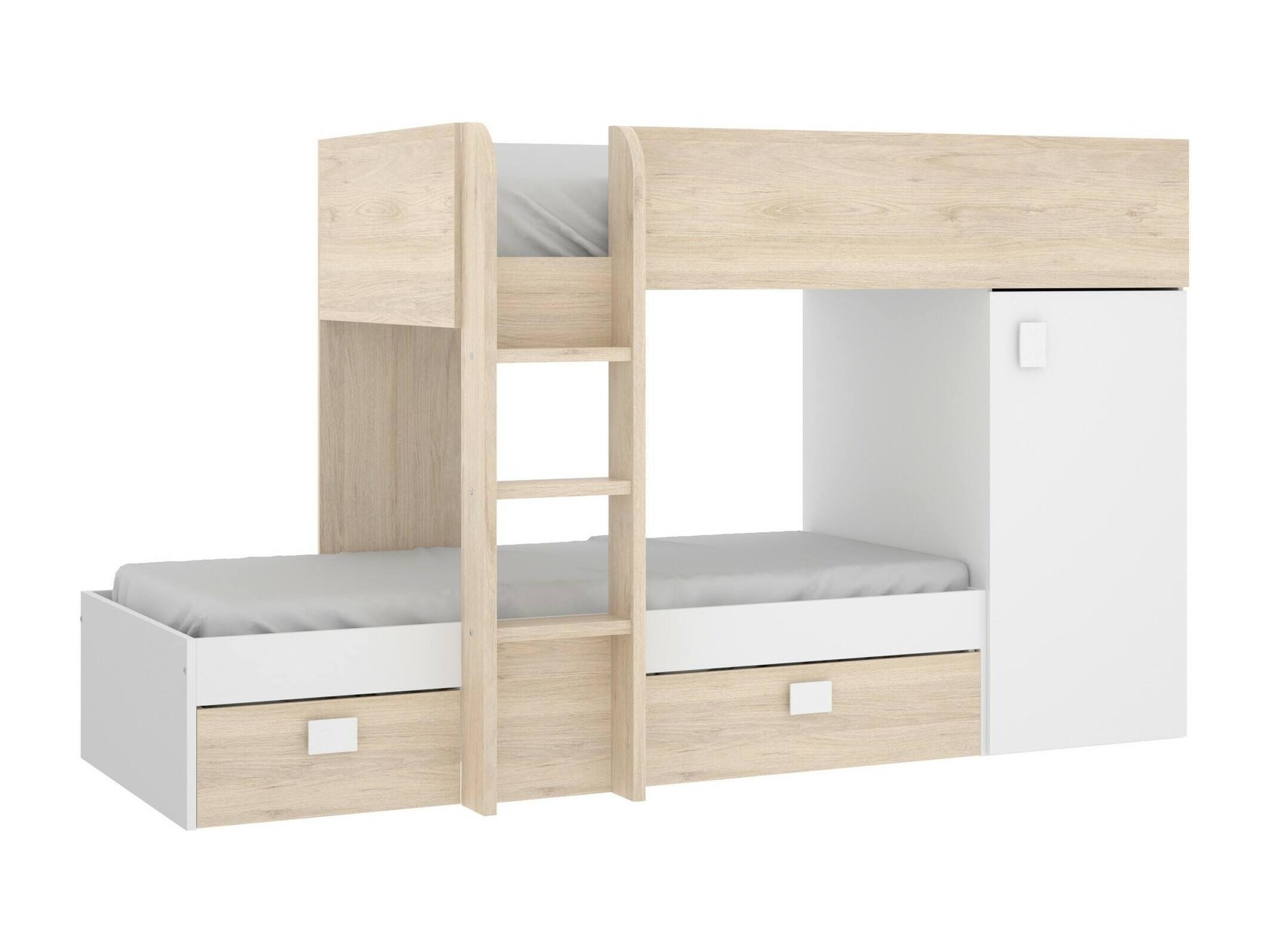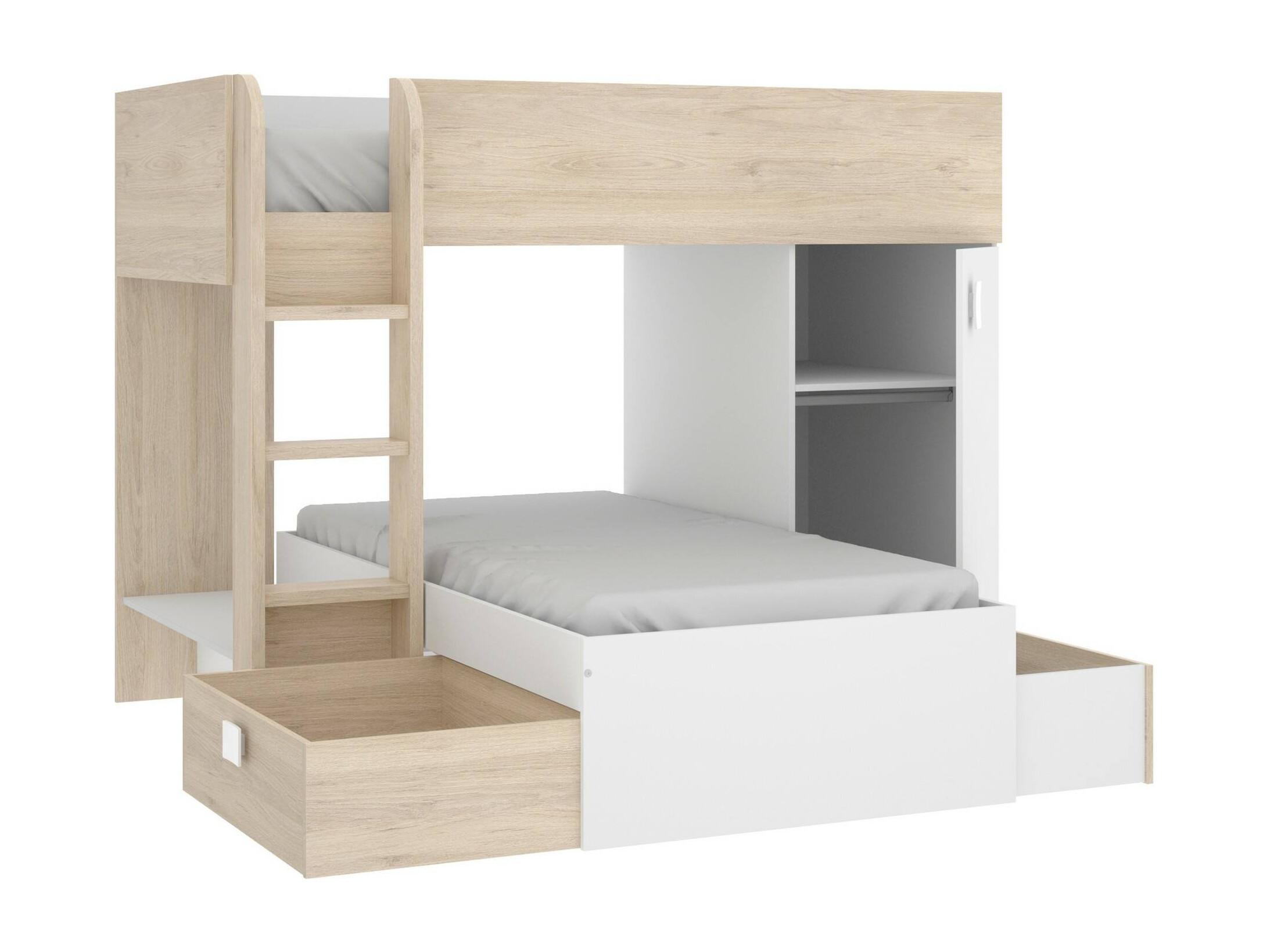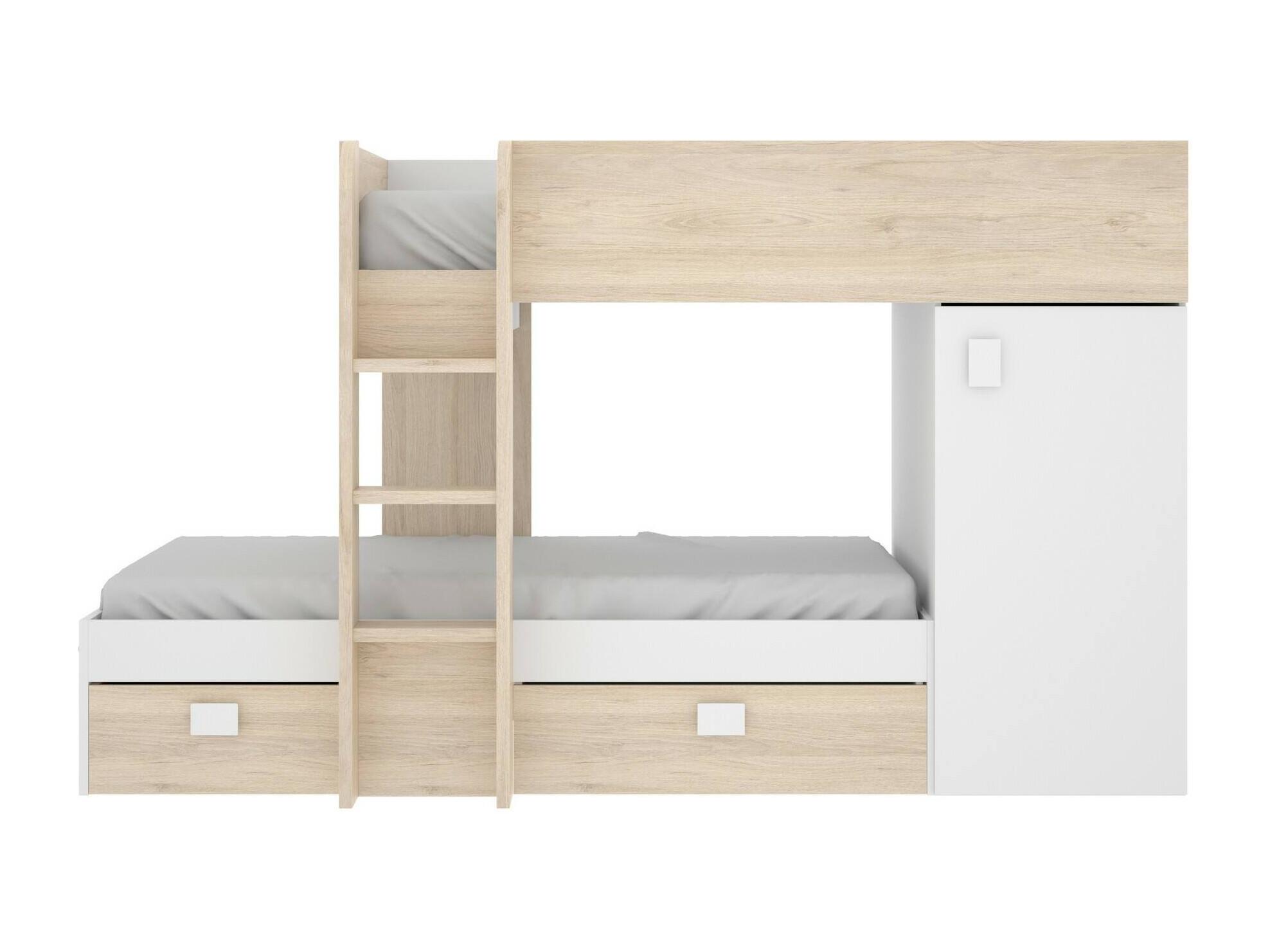 Lit enfant Marmolada, Chambre complète avec armoire et tiroirs, Composition de lits superposés avec deux lits simples, 255x112h150 cm, Blanc et Chêne