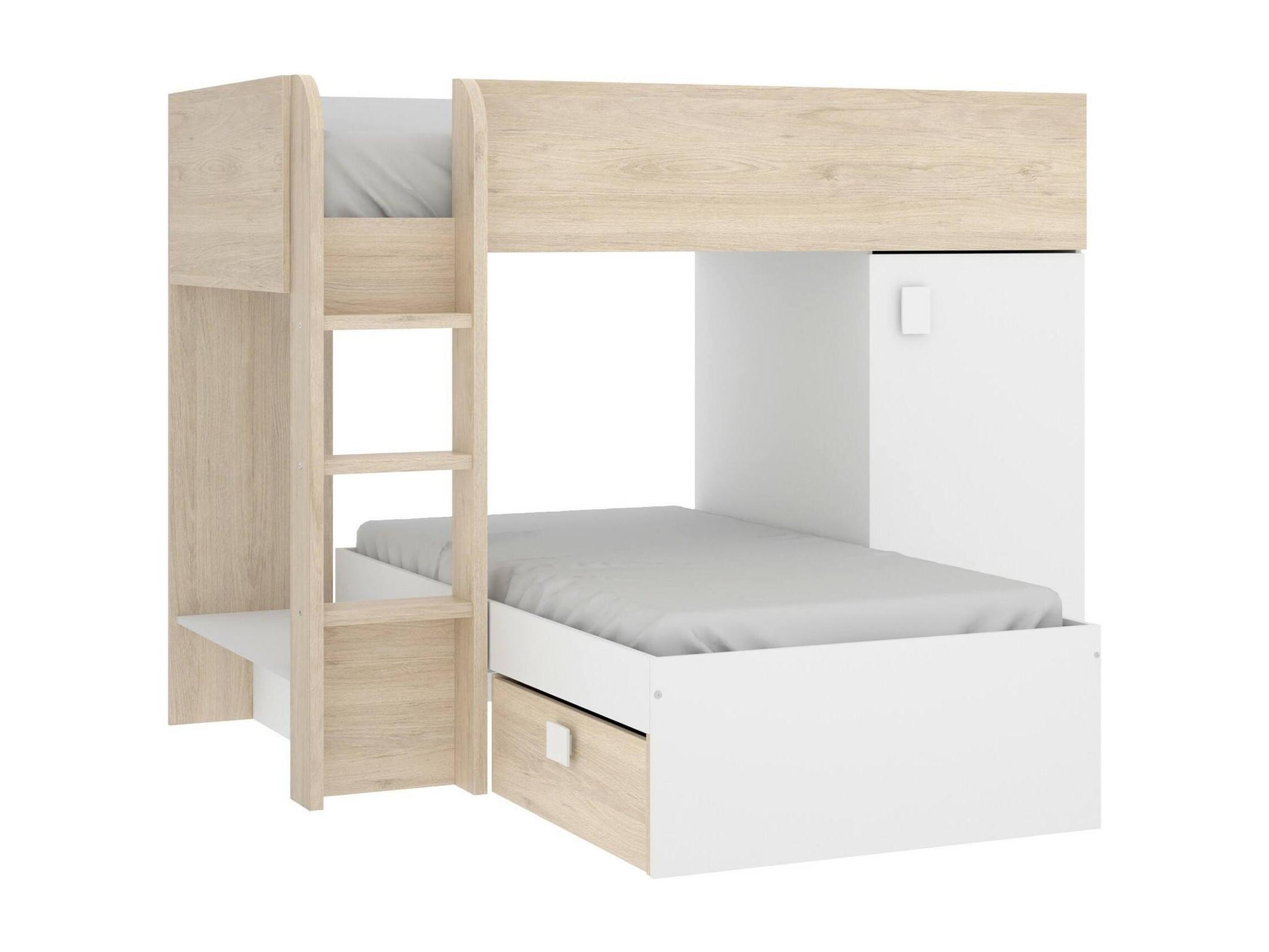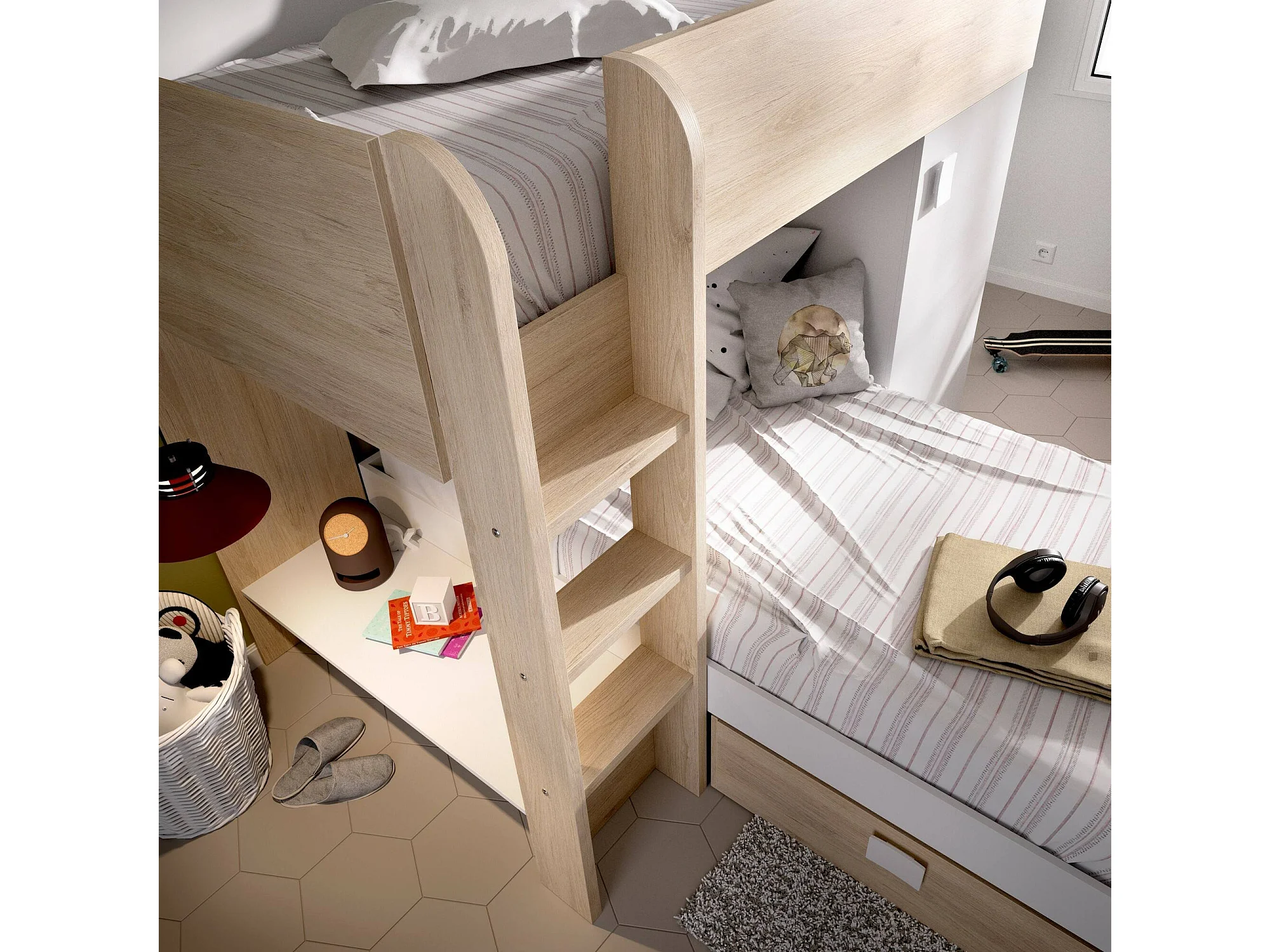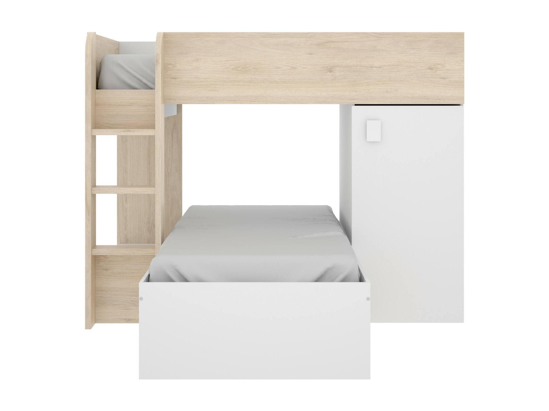 Lit enfant Marmolada, Chambre complète avec armoire et tiroirs, Composition de lits superposés avec deux lits simples, 255x112h150 cm, Blanc et Chêne