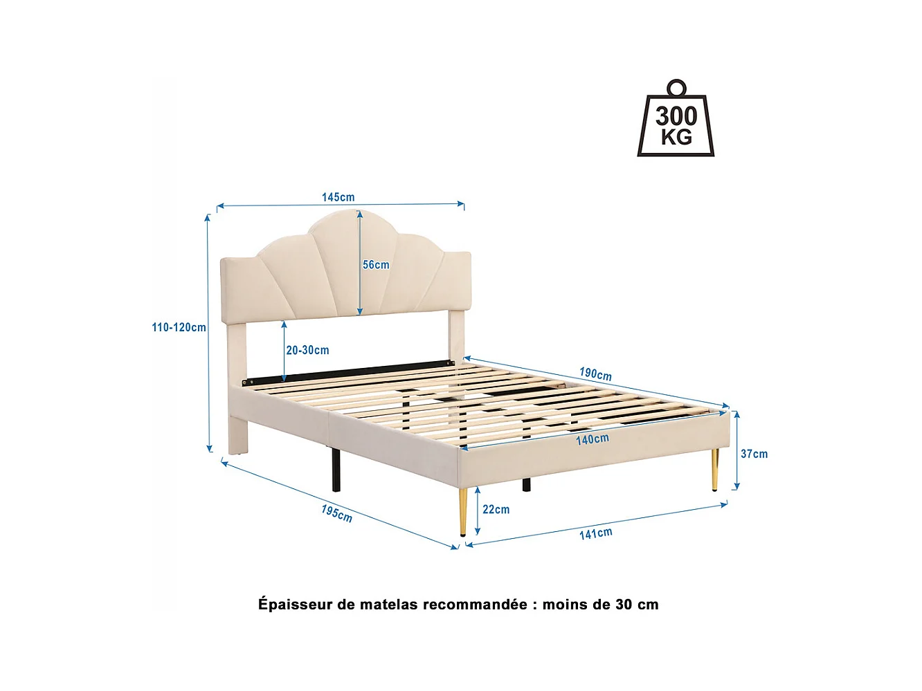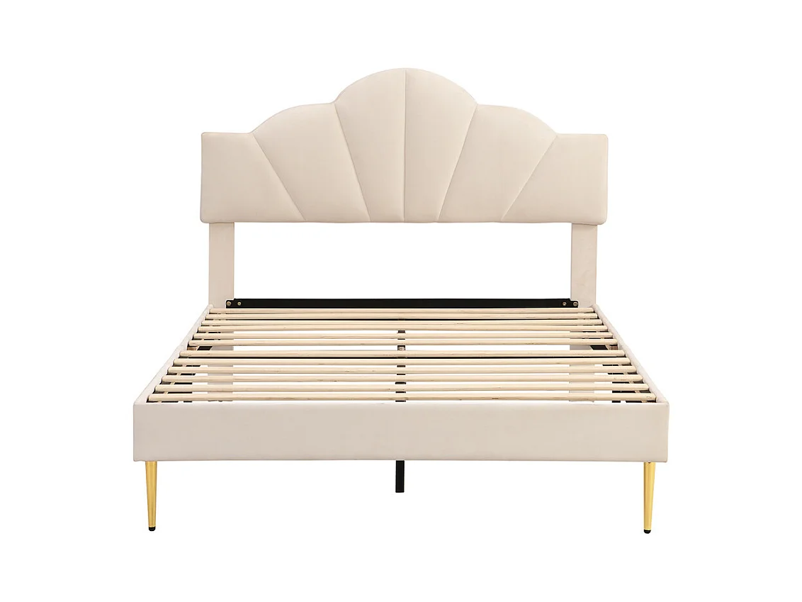 Lit rembourré 140x190 cm lit double avec sommier à lattes - tête de lit réglable - tissu en velours - beige