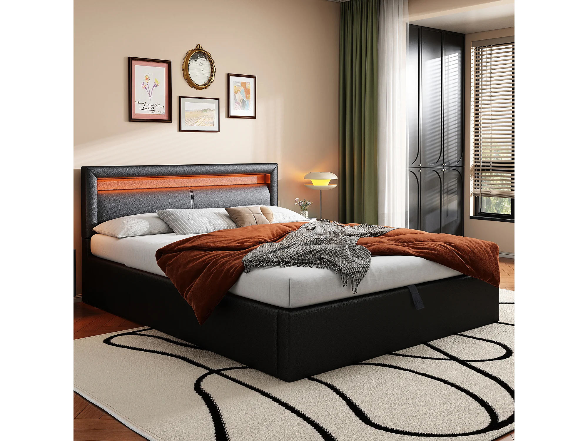 Lit rembourré 140×190 cm noir avec éclairage LED, sommier à lattes et rangement intégré