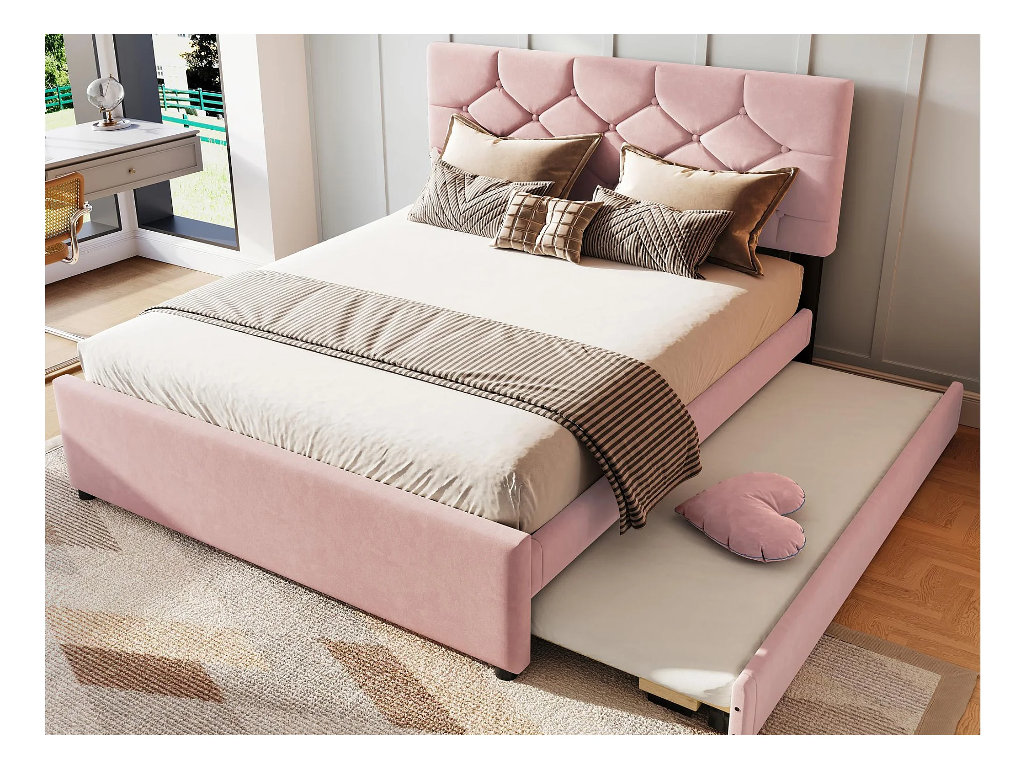 Lit rembourré 140x200 cm - avec lit gigogne 90x190cm - avec sommier à lattes - velours - rose (matelas non inclus)