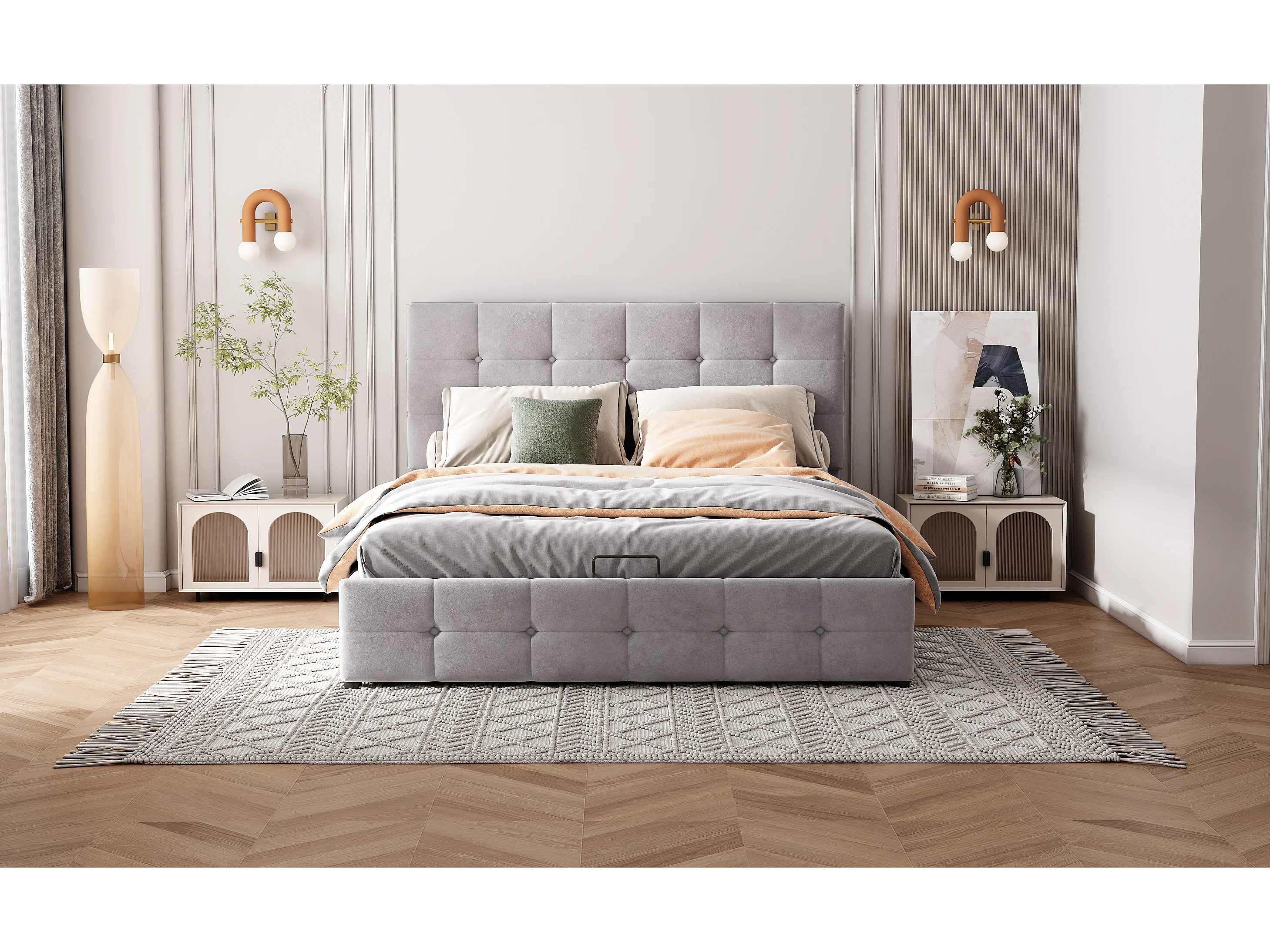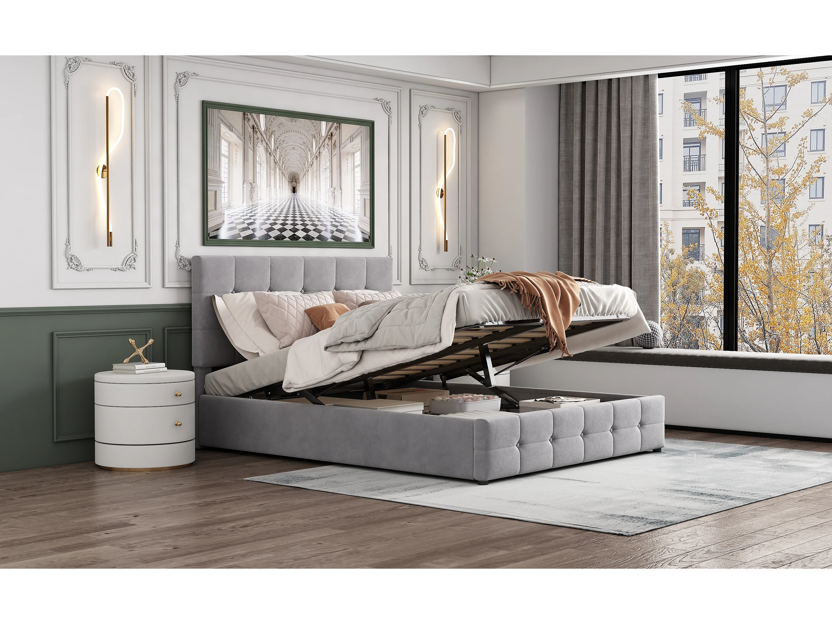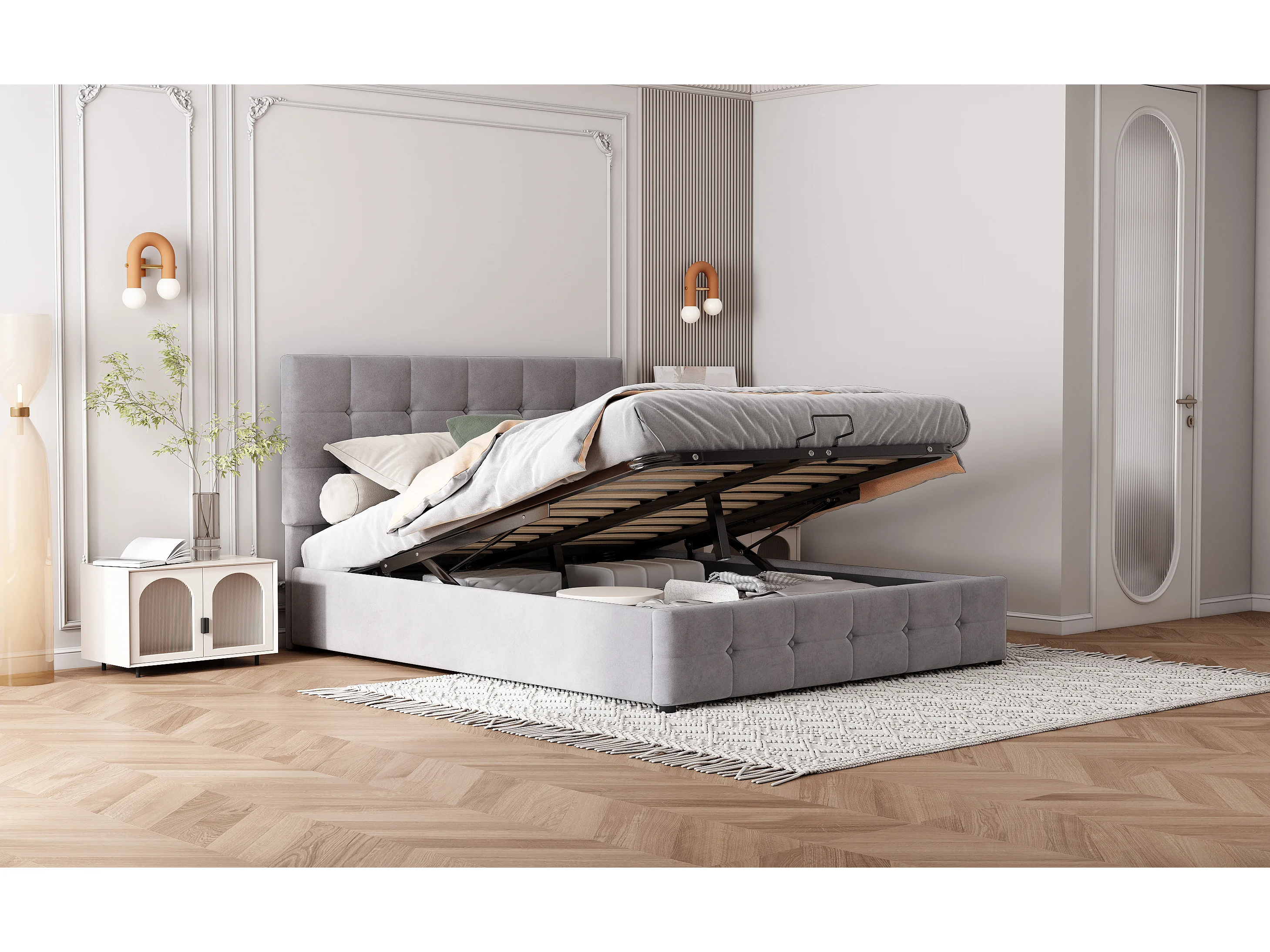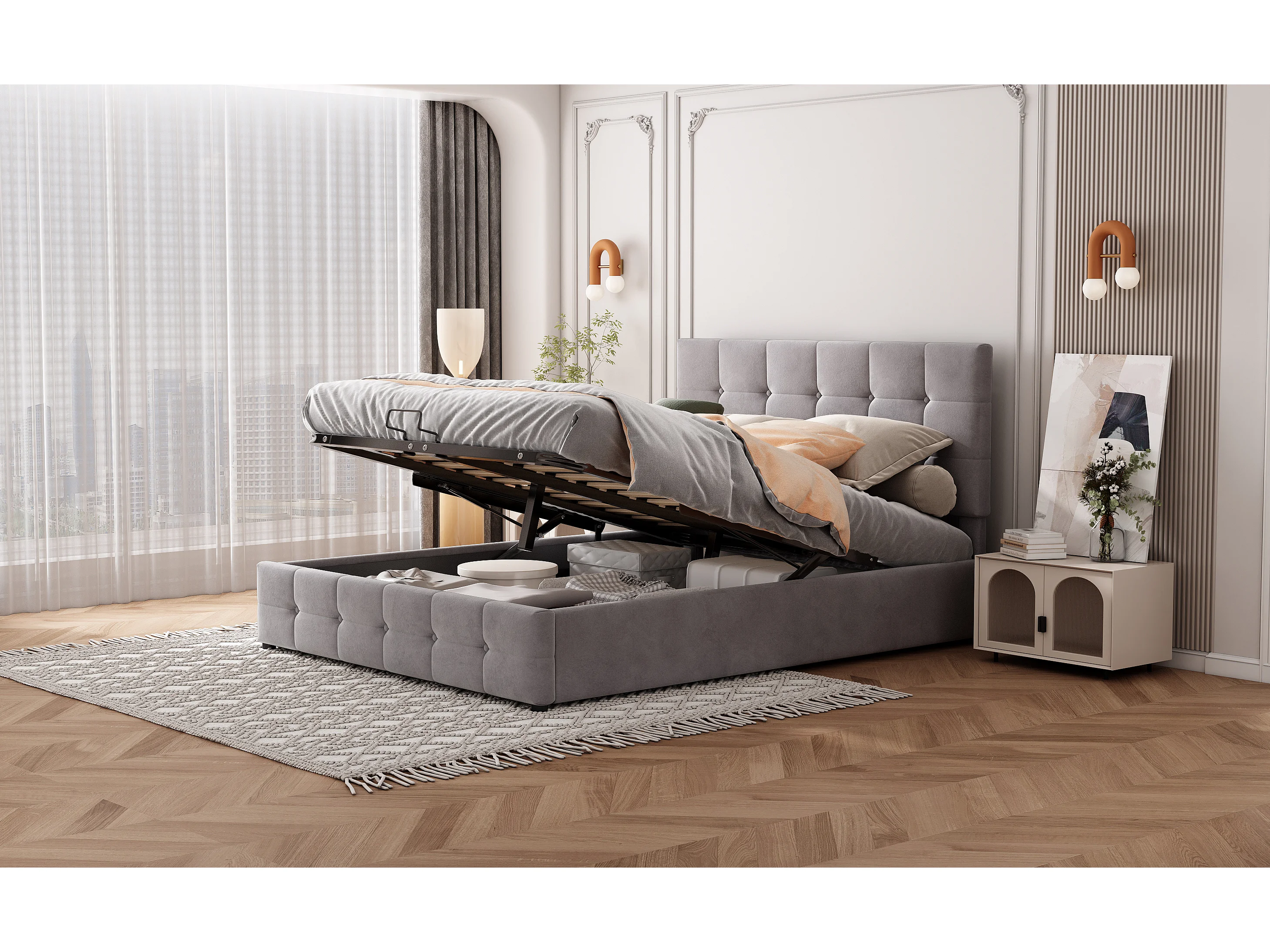 Lit rembourré 140x200 cm avec rangement hydraulique, tête réglable, sommier métal, velours gris, lit adulte