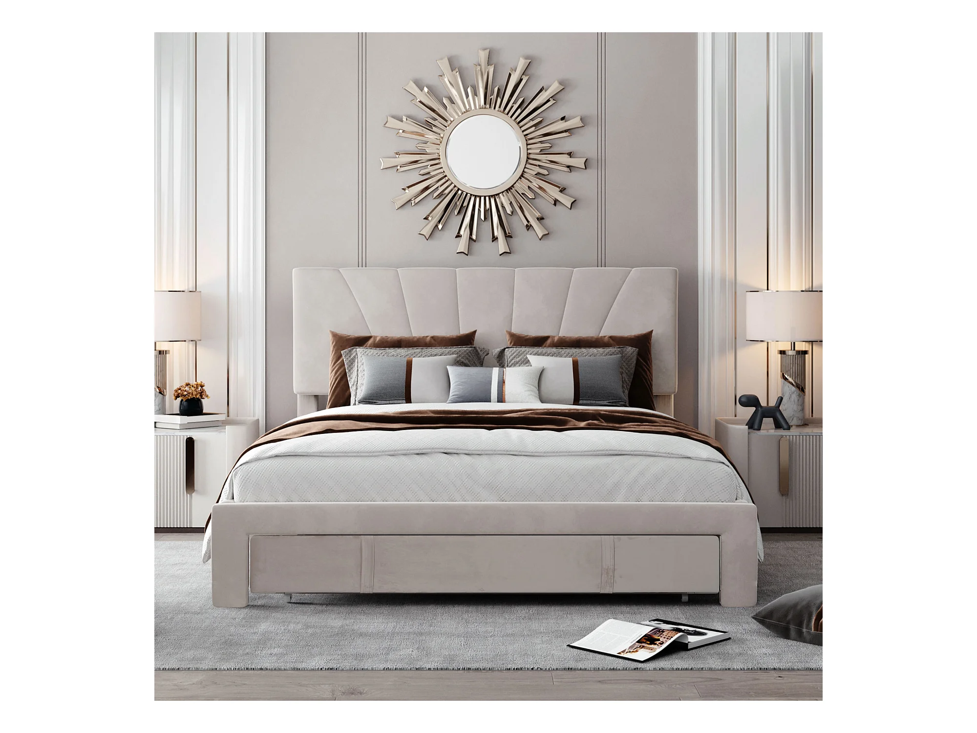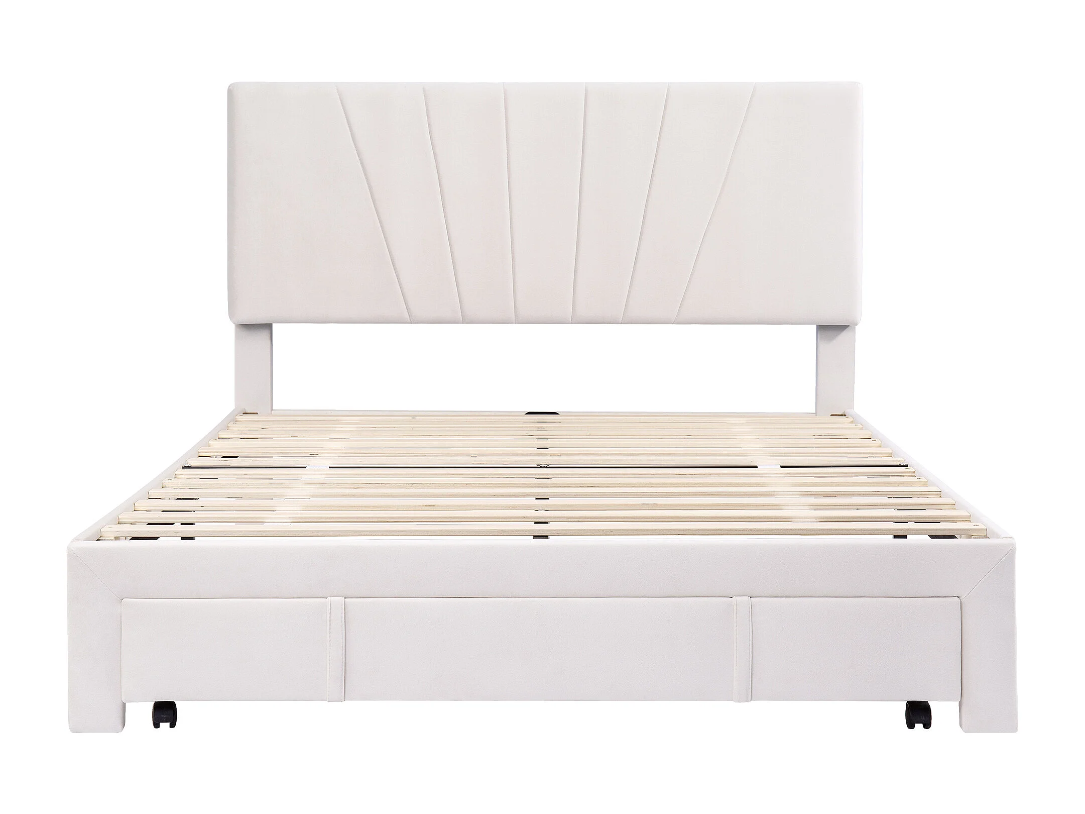 Lit rembourré 140x200 cm avec sommier, tête et grand tiroir, velours beige, lit adulte et junior, matelas non inclus