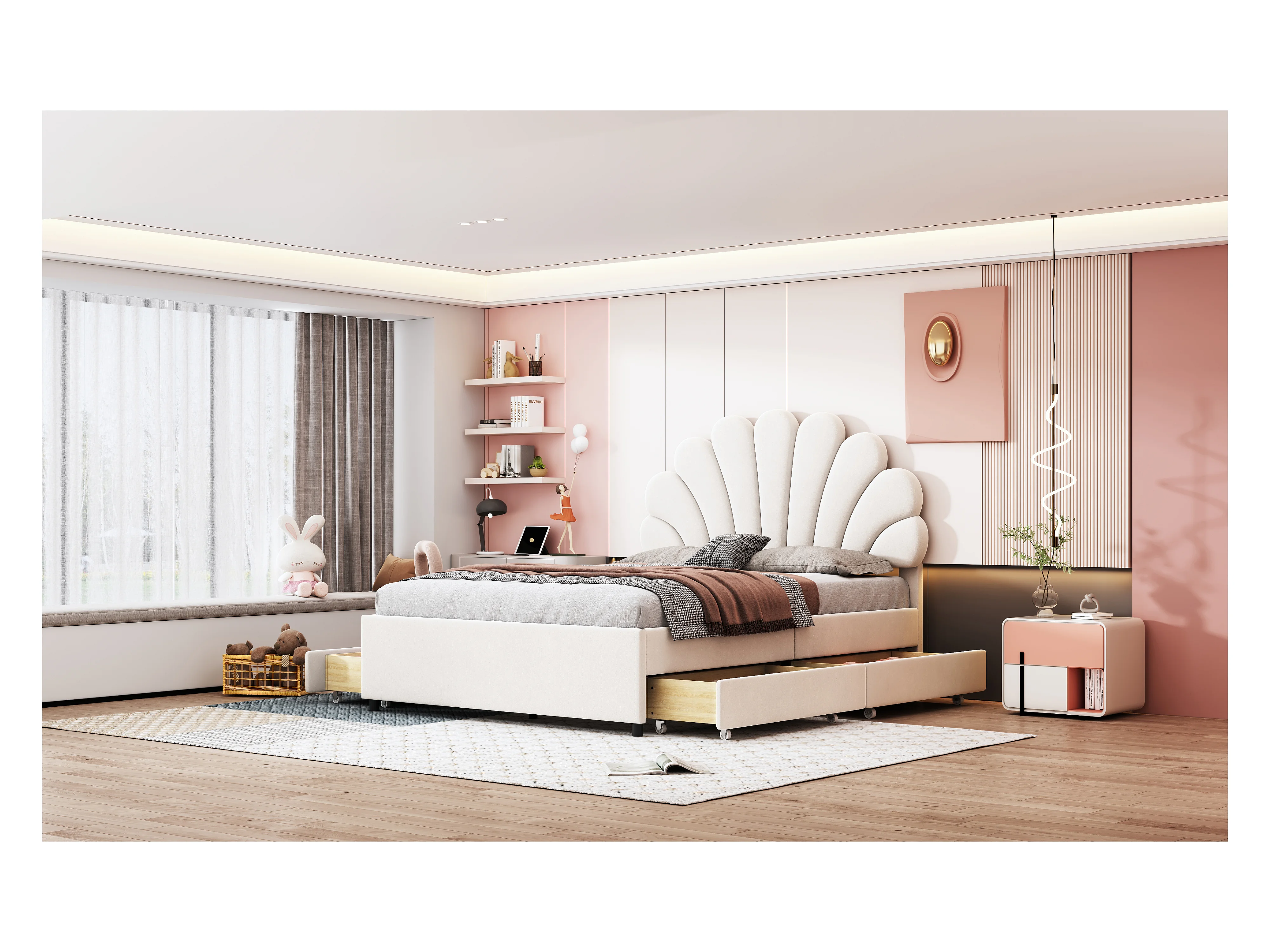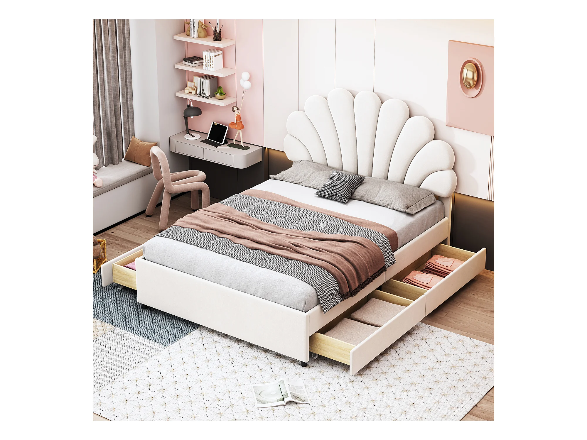 Lit rembourré 140x200 cm, cadre avec tête fleurie, sommier et rangements, velours beige, lit adulte et junior