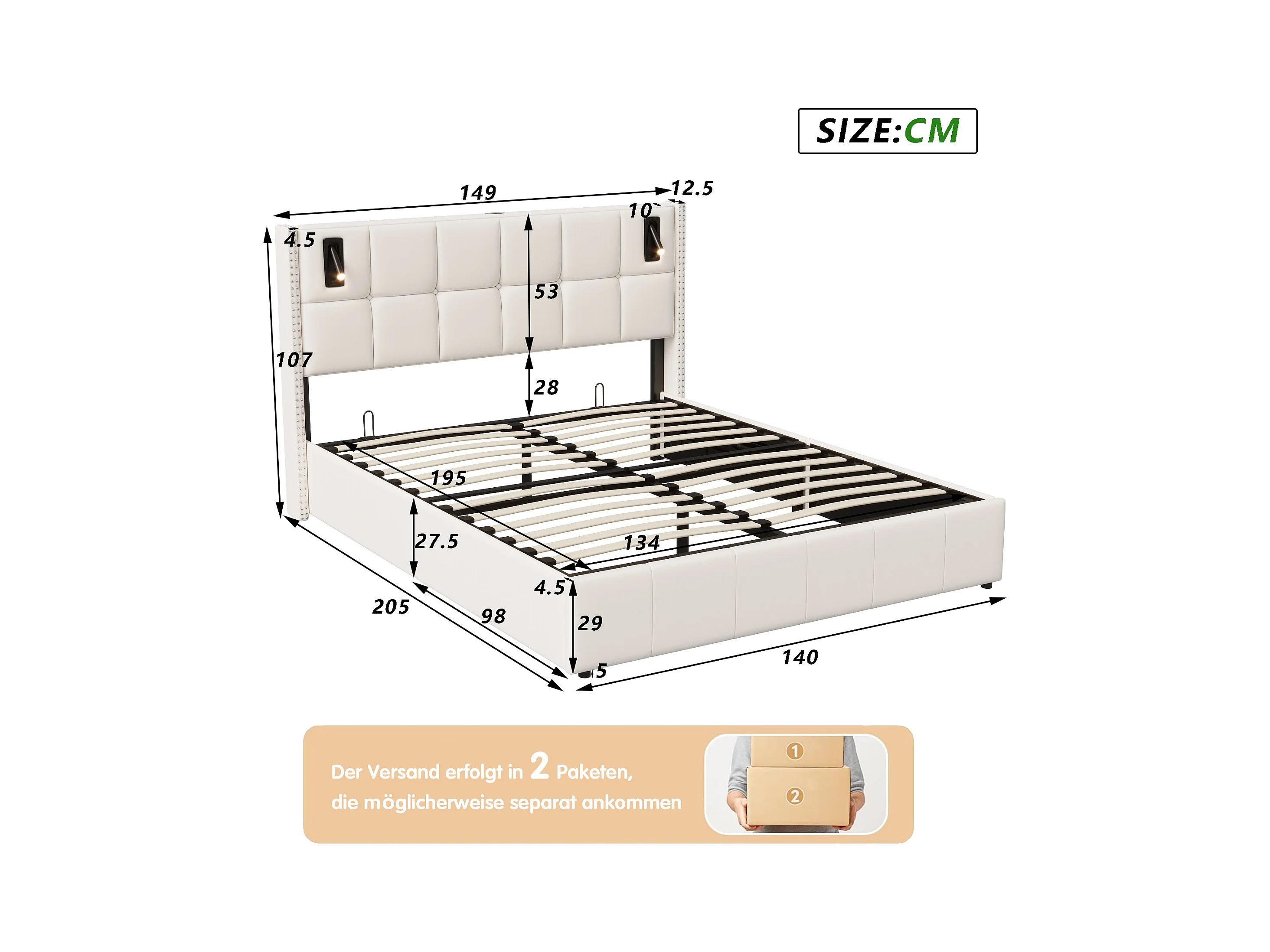 Lit Rembourré 140x200cm avec sommier à lattes & liseuses, lit coffre lit double, velours, beige
