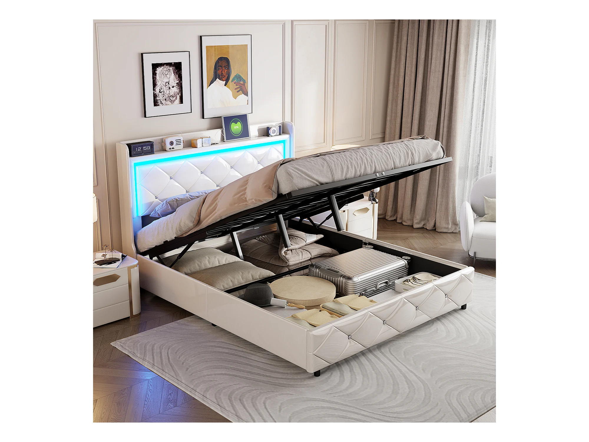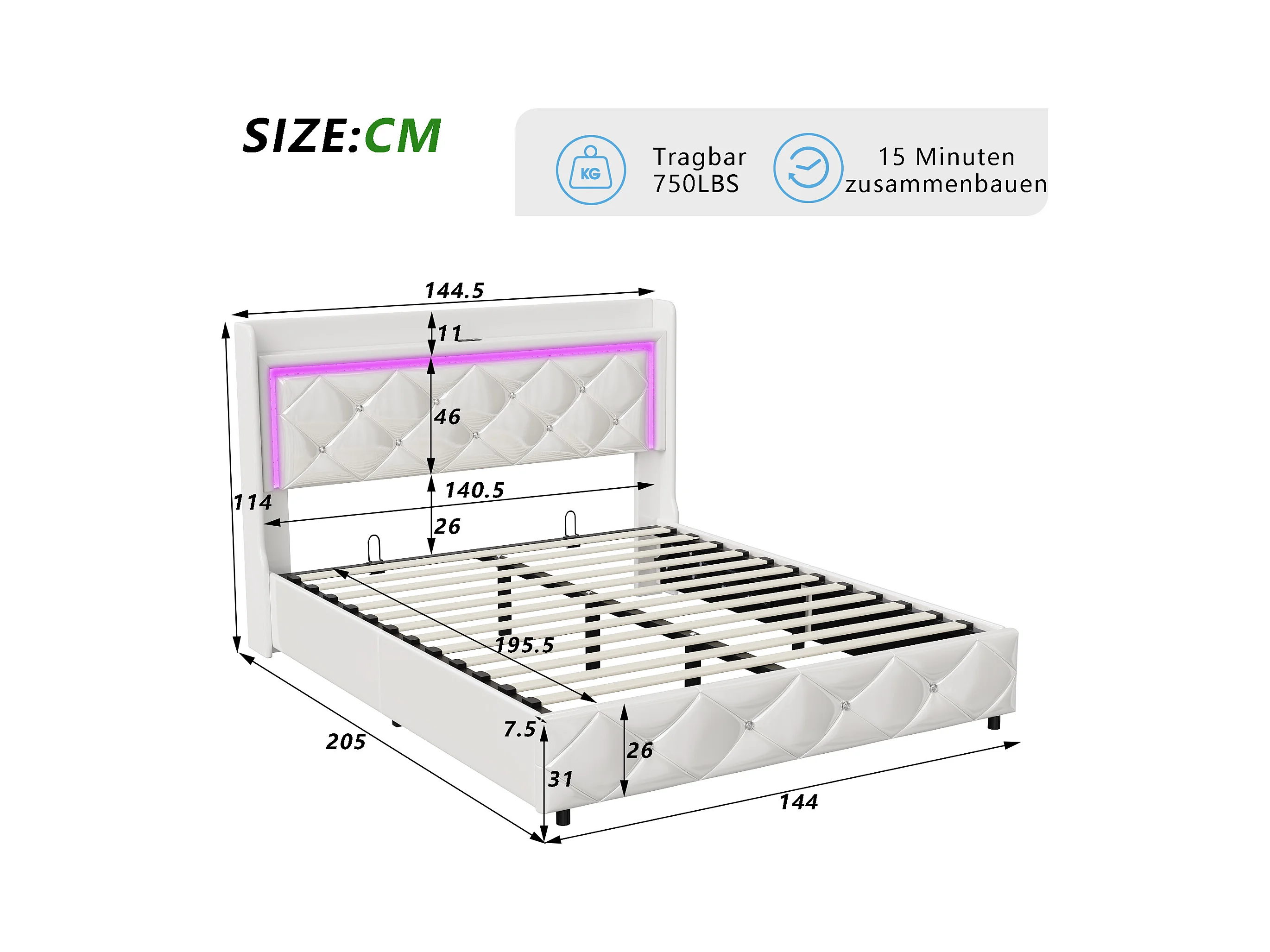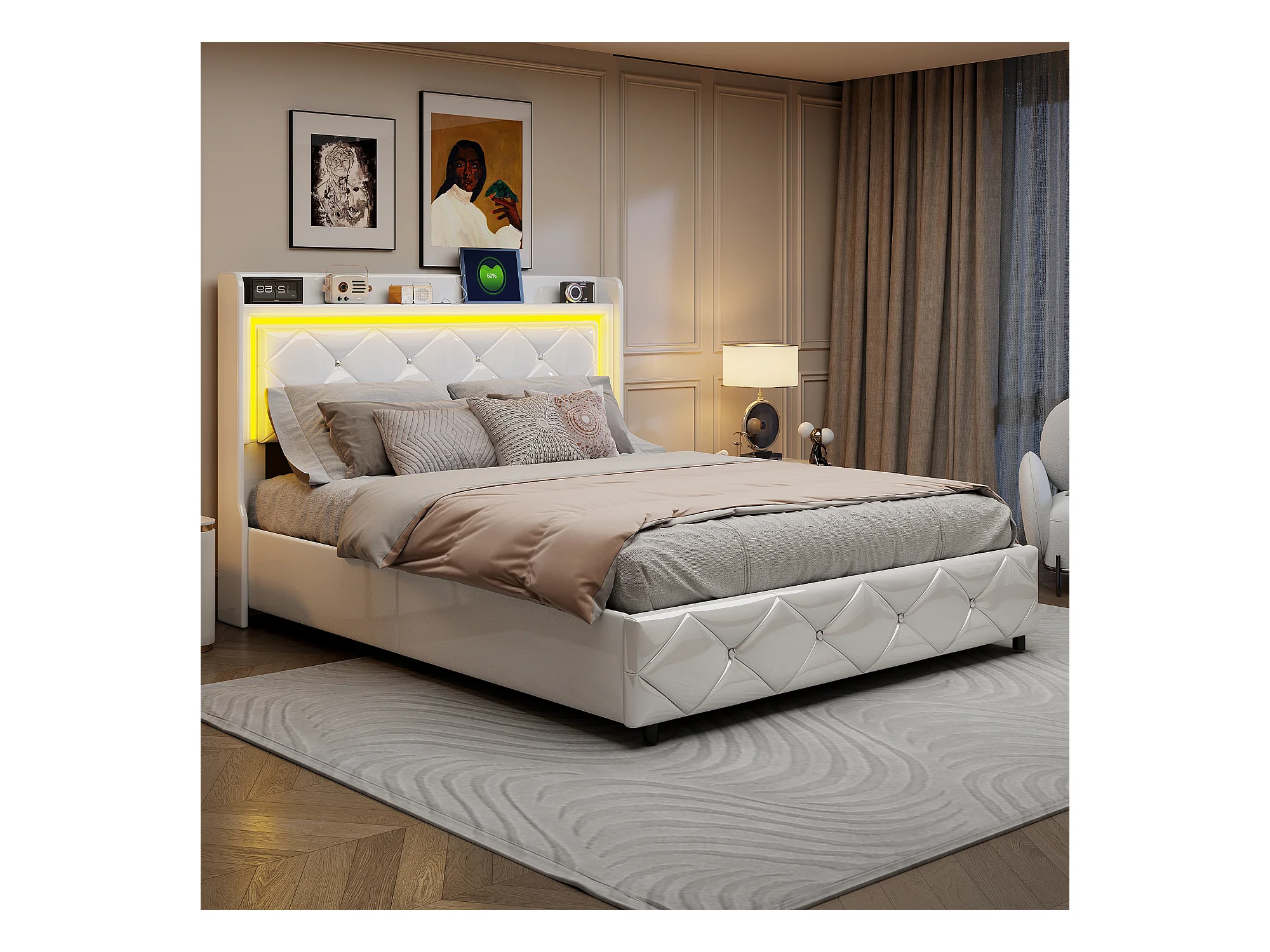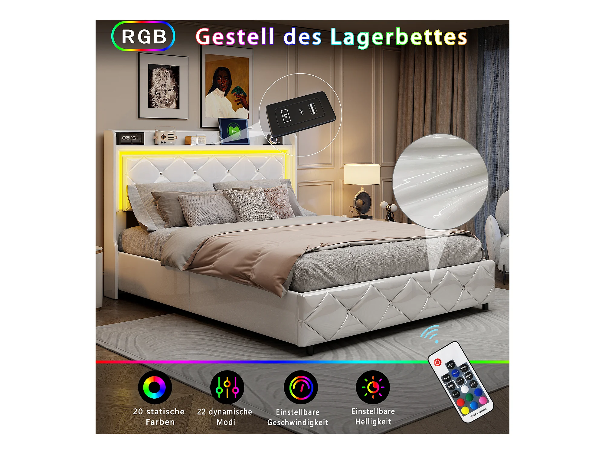 Lit Rembourré 140x200cm avec USB, lit double, lit rangement avec LED,simili cuir, cadre de lit,blanc