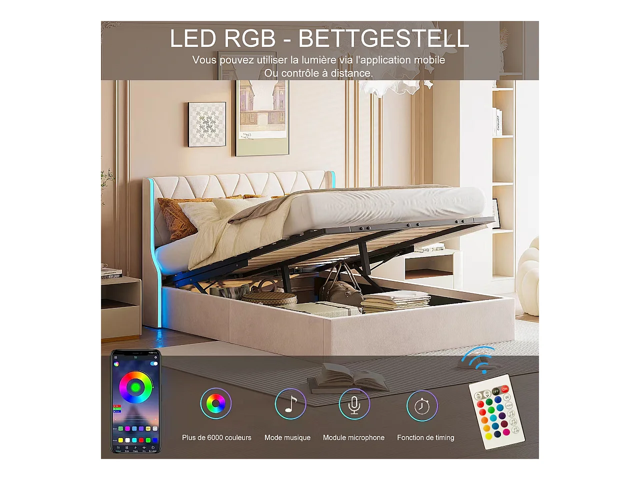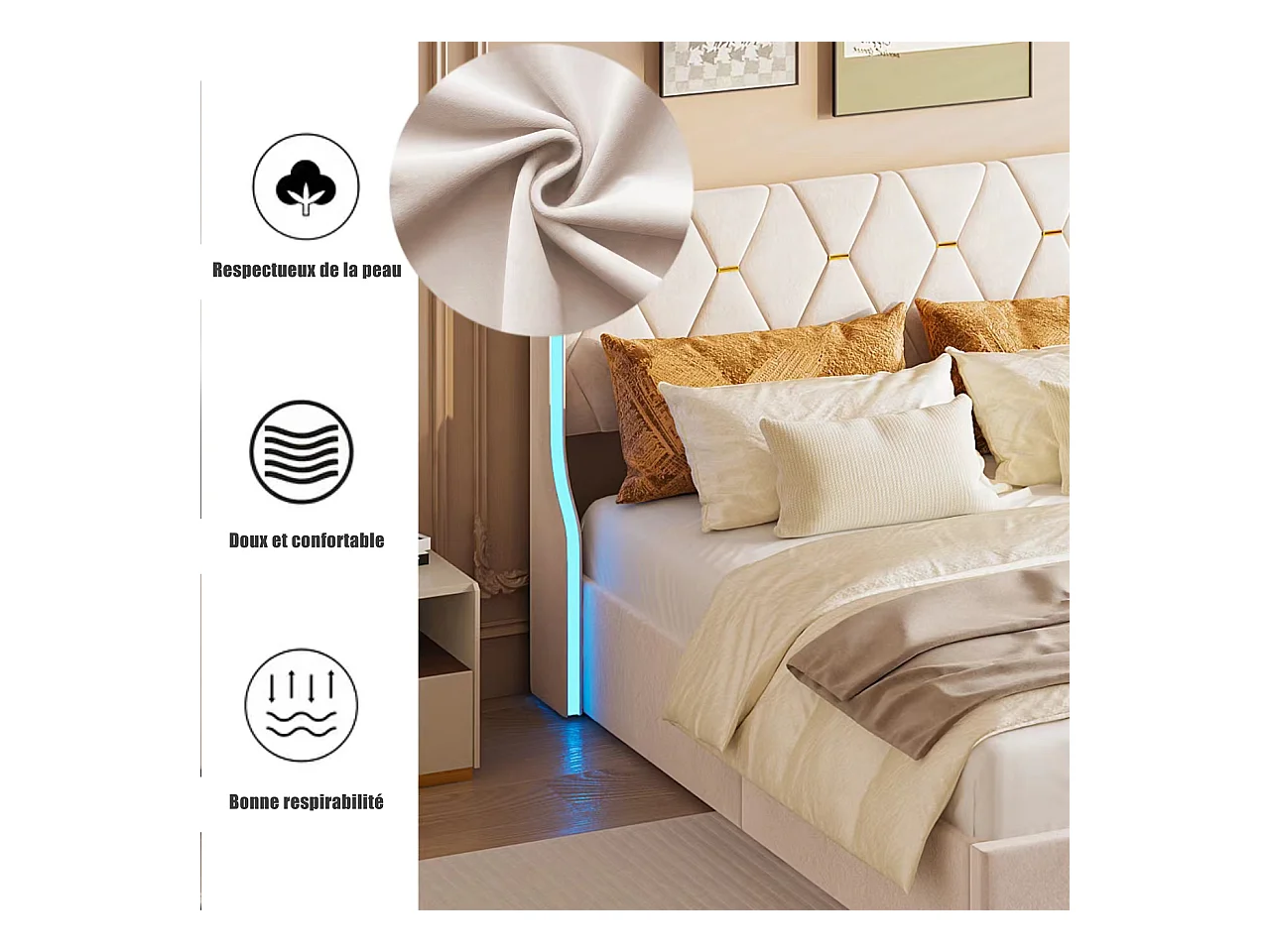 Lit Rembourré 160x200 avec LED et Rangement, Lits capitonné avec Sommier à Lattes, Velours,Beige