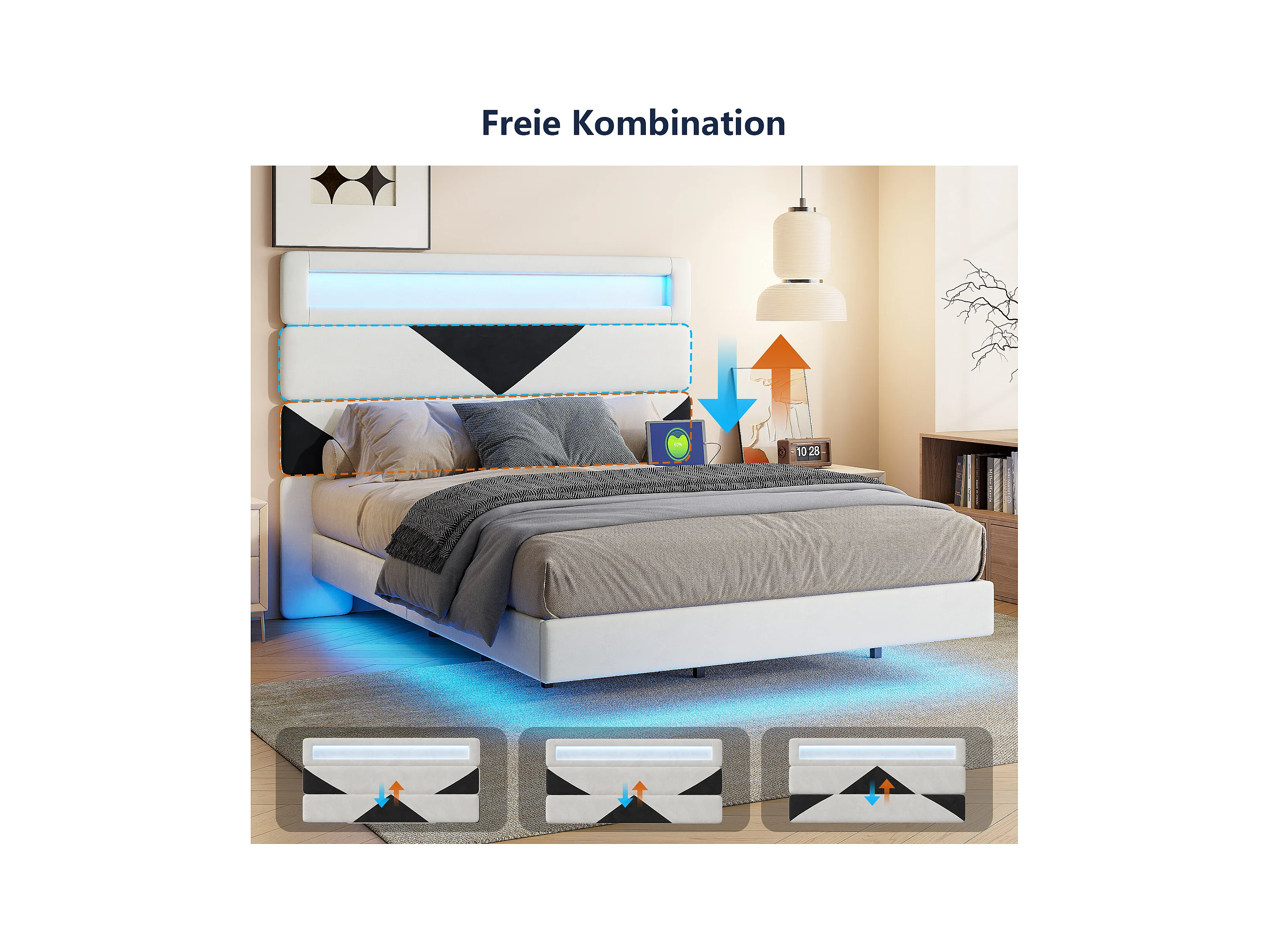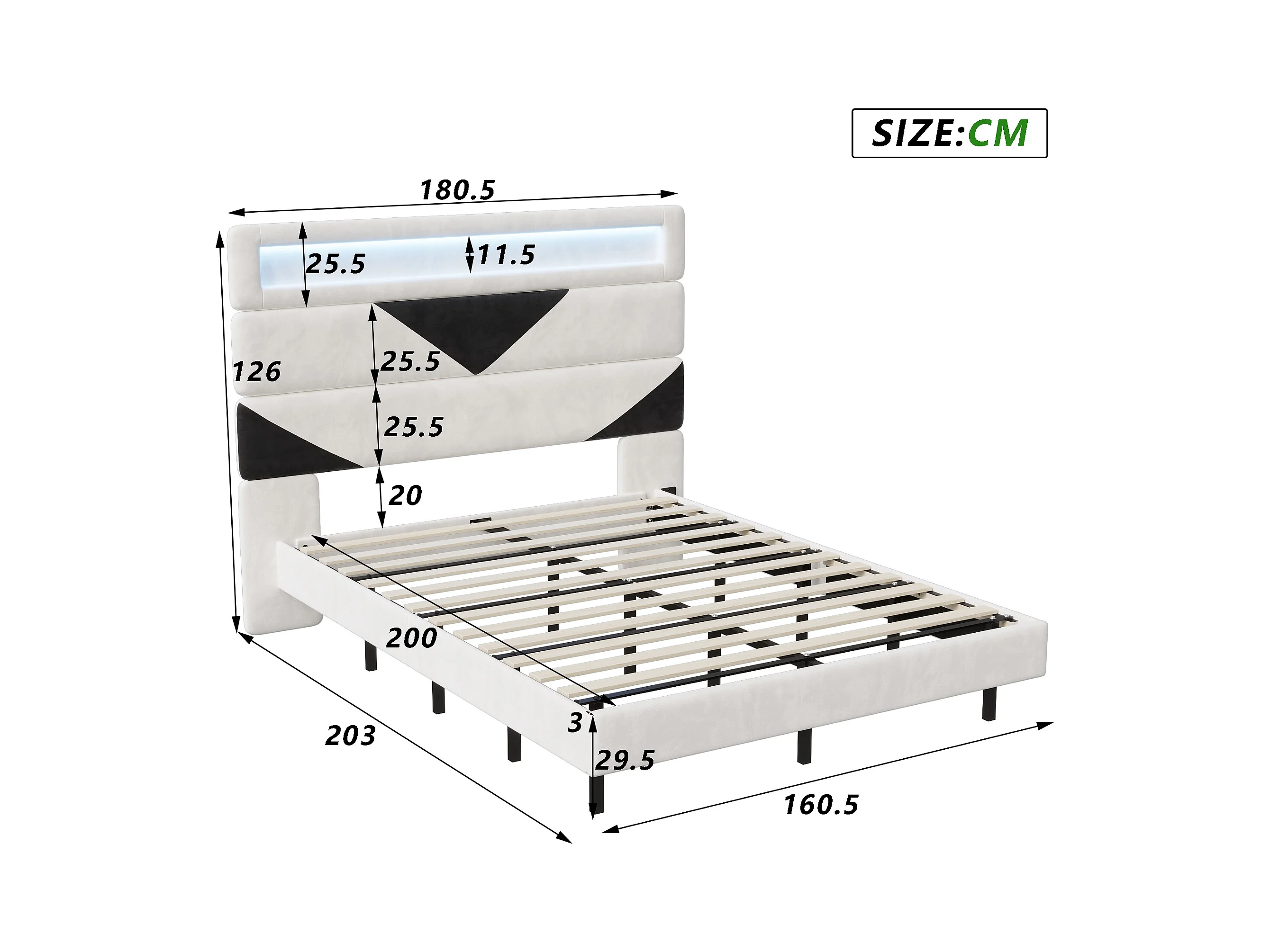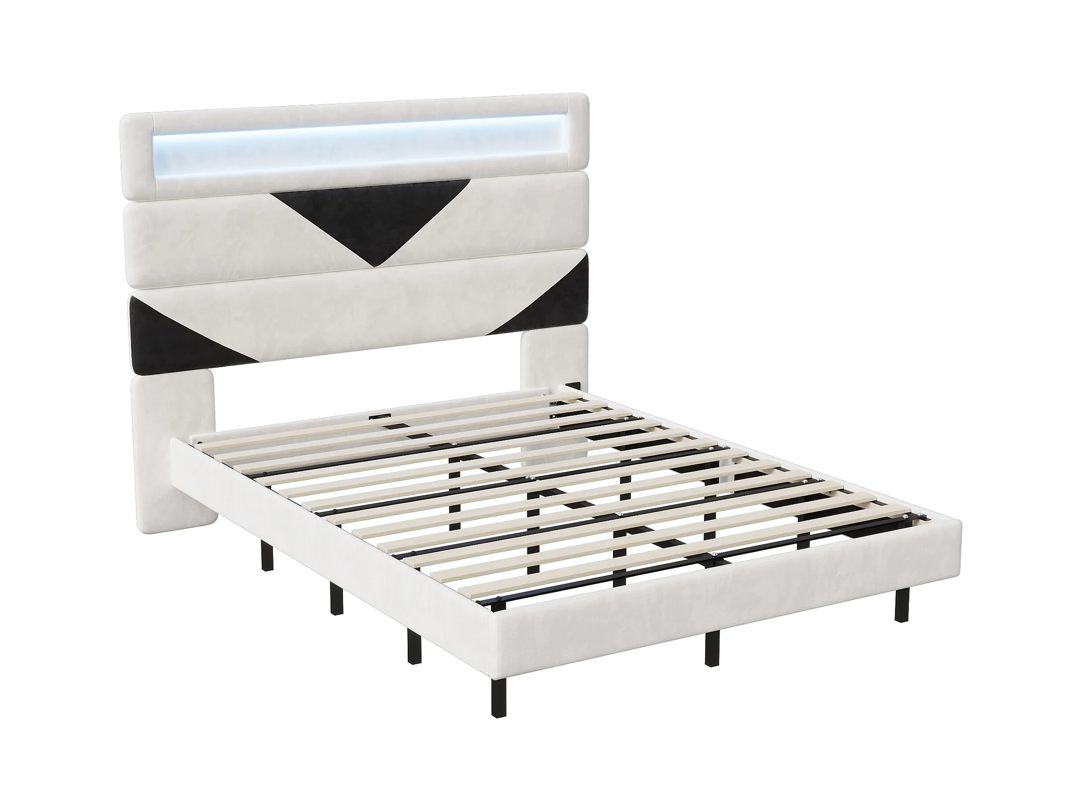Lit Rembourré 160x200cm avec USB & LED,lit coffre avec tête de lit triangulaire,velours,blanc & noir