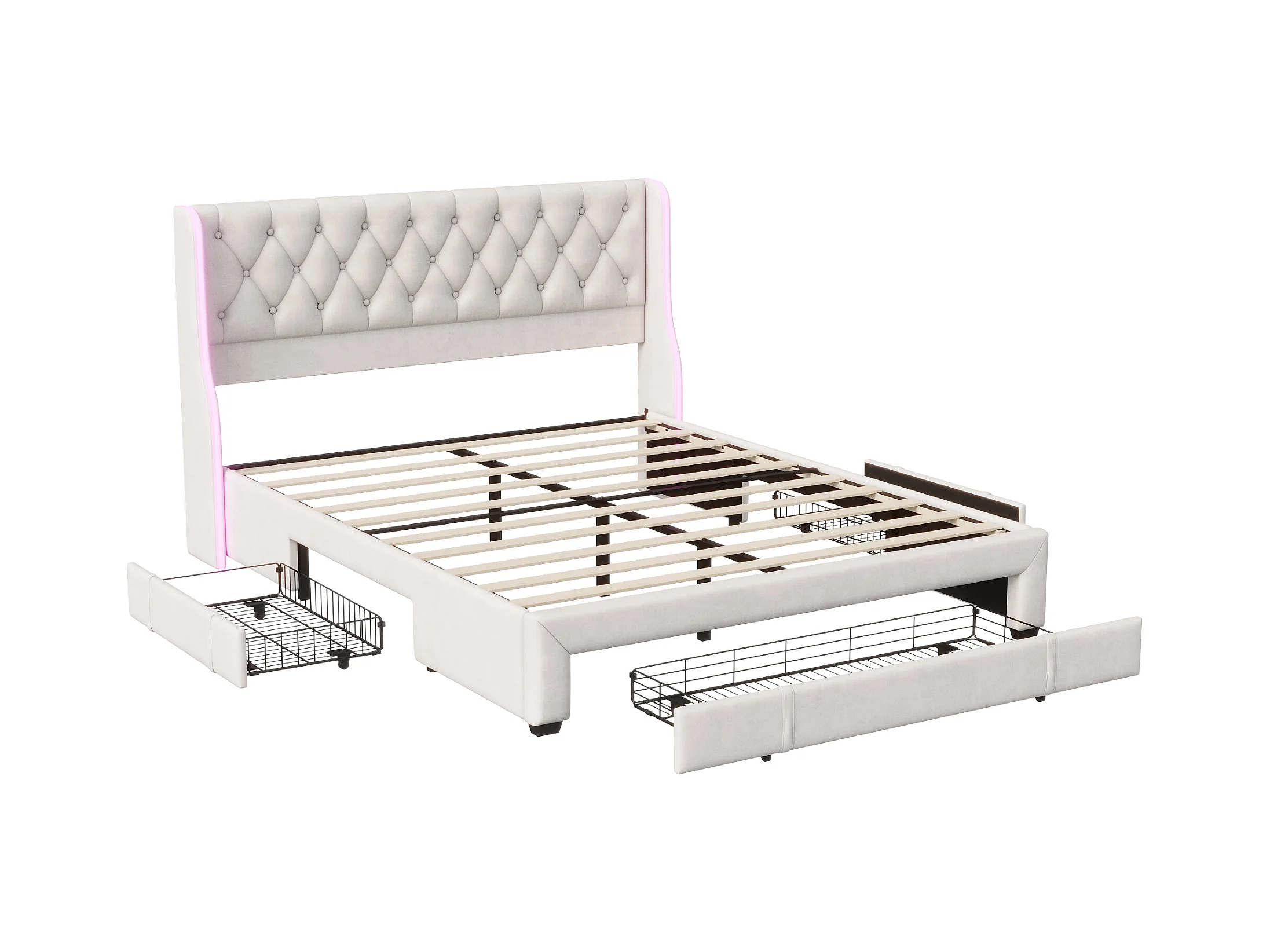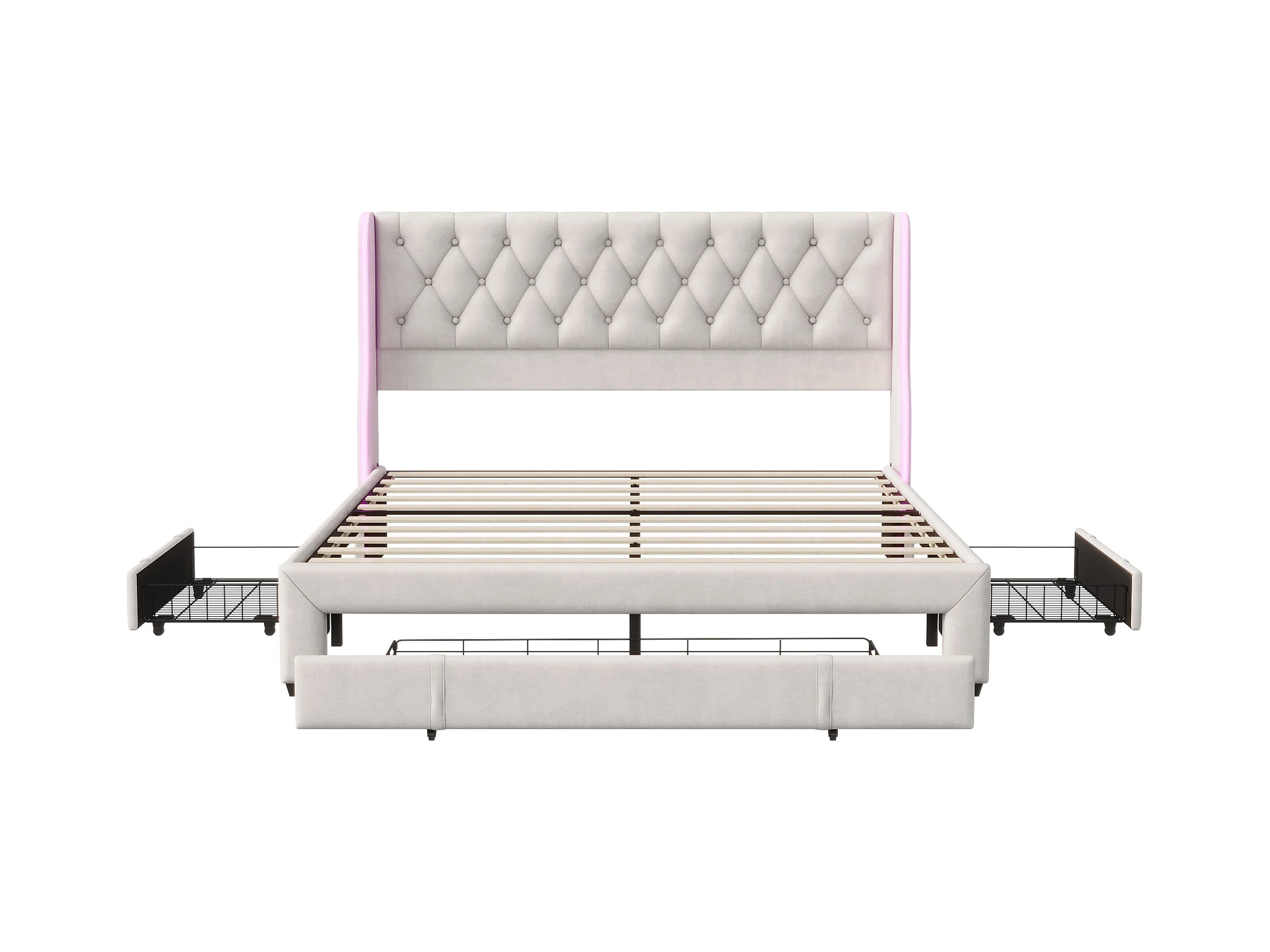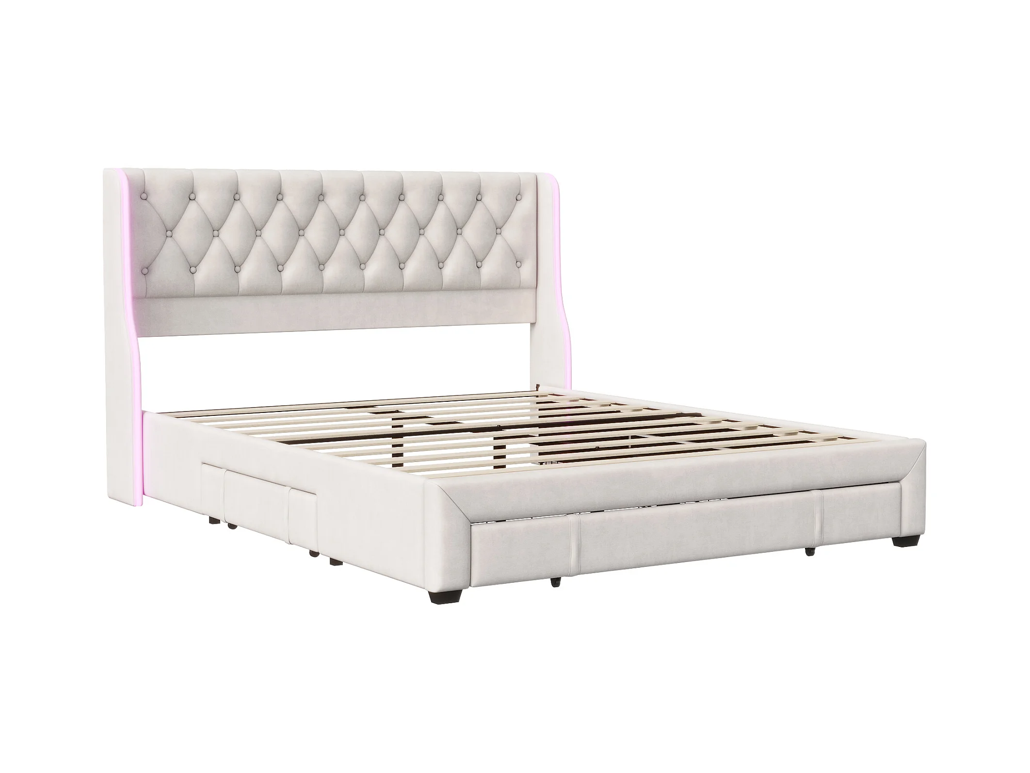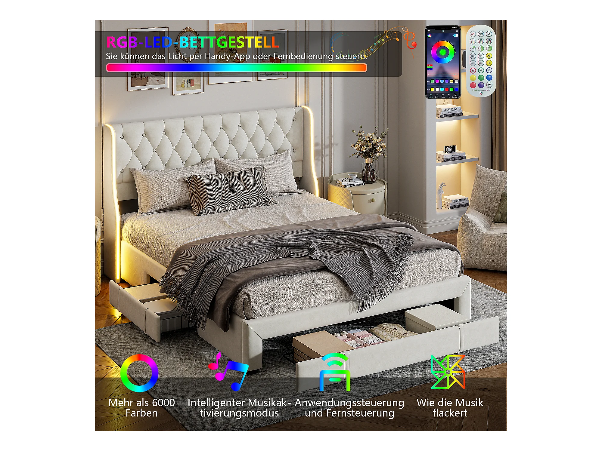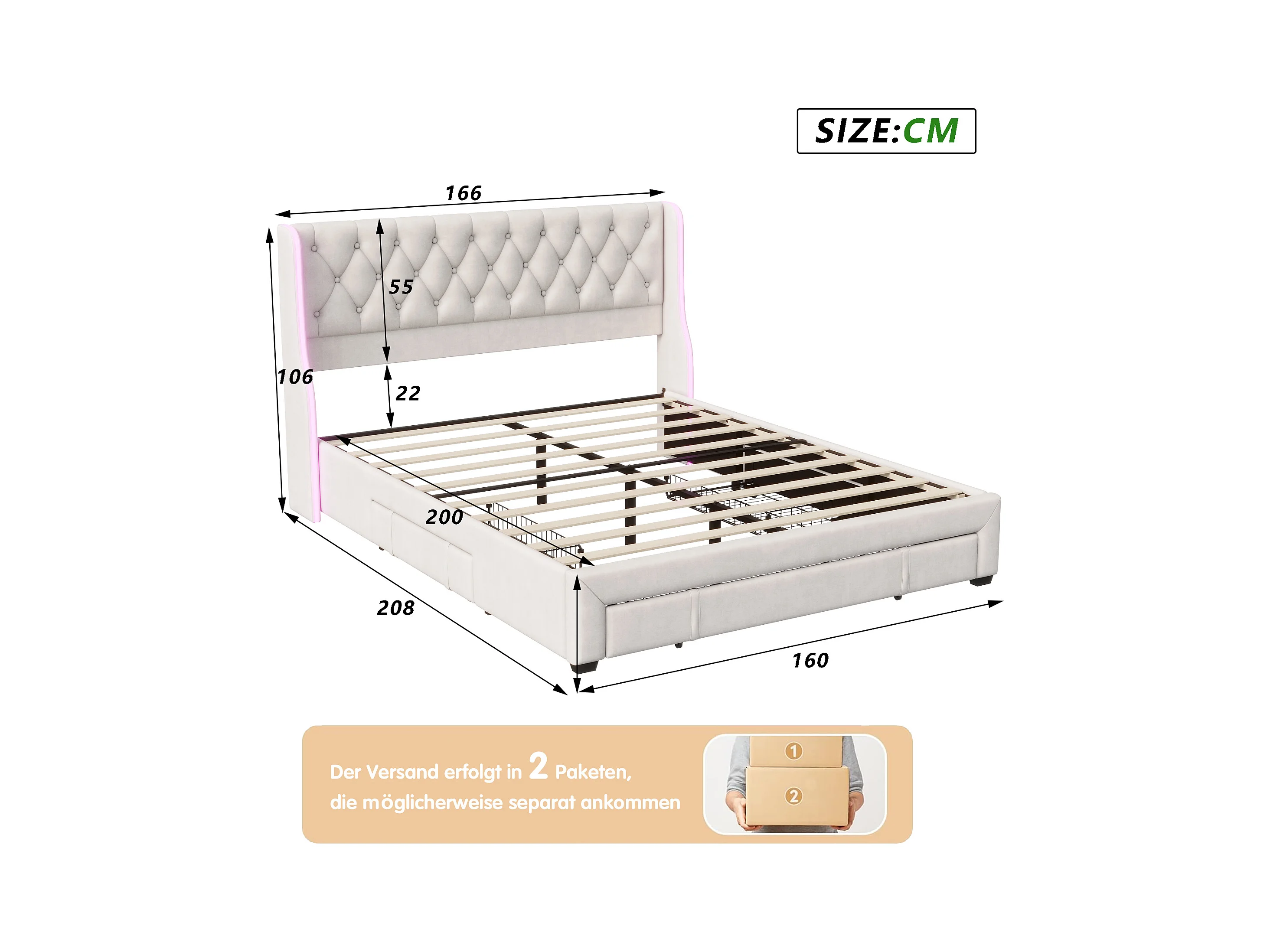 Lit Rembourré 160x200cm, lit double avec 3 tiroirs, LED, cadre de lit, velours, beige