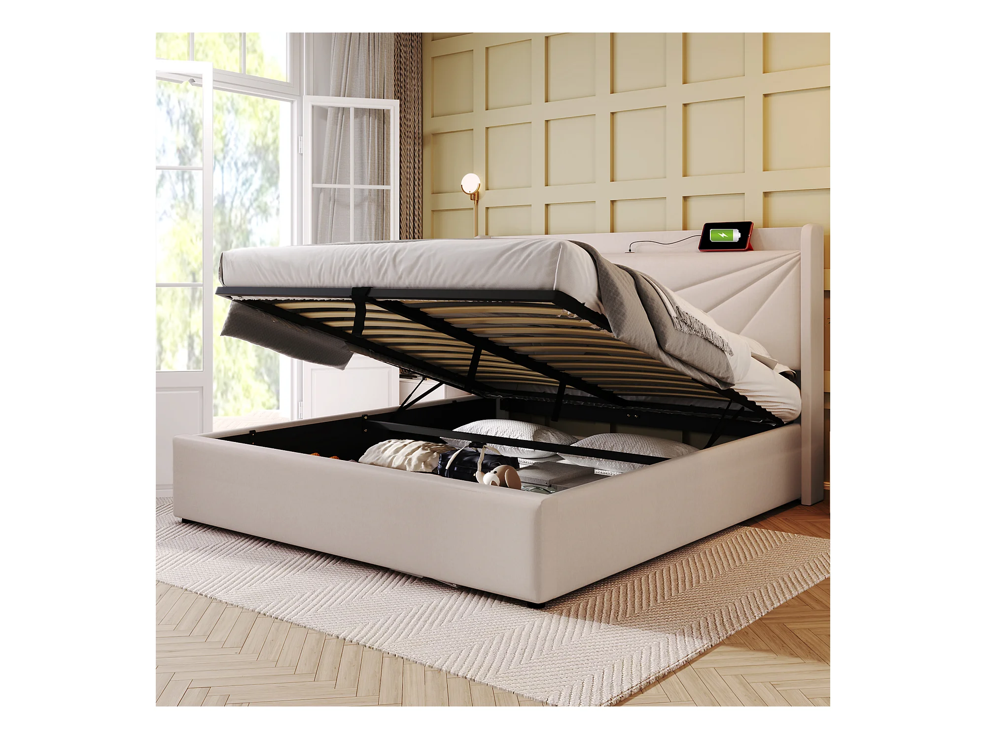 Lit rembourré 180x200, double boîte de rangement avec fonction de chargement USB type C, cadre en lin (sans matelas)