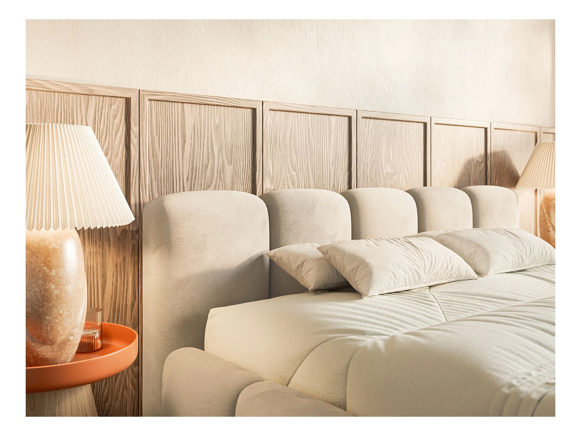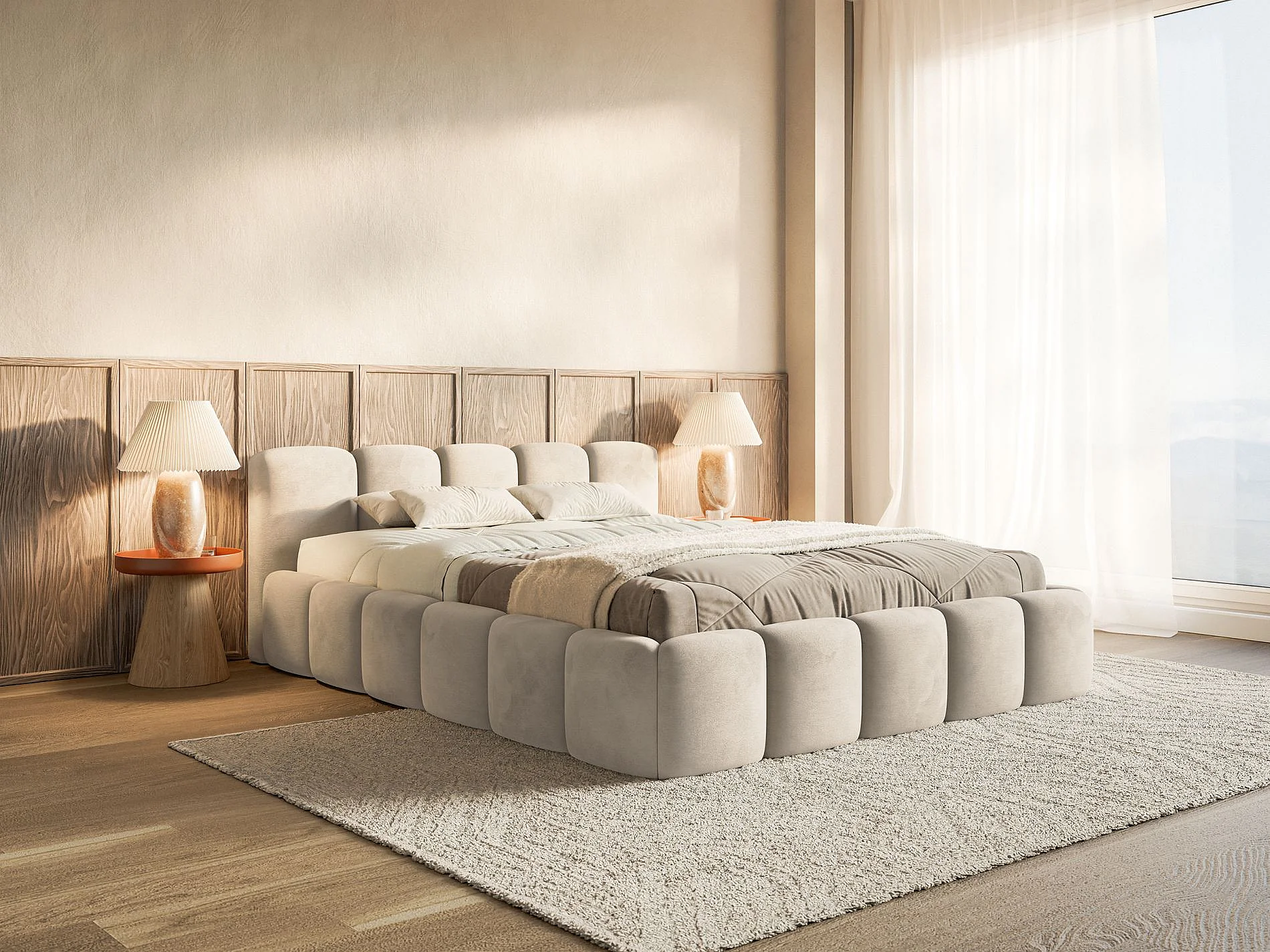 Lit rembourré – 200x200 cm – beige clair – avec coffre de rangement – velours hydrophobe - CLOUDY LOW