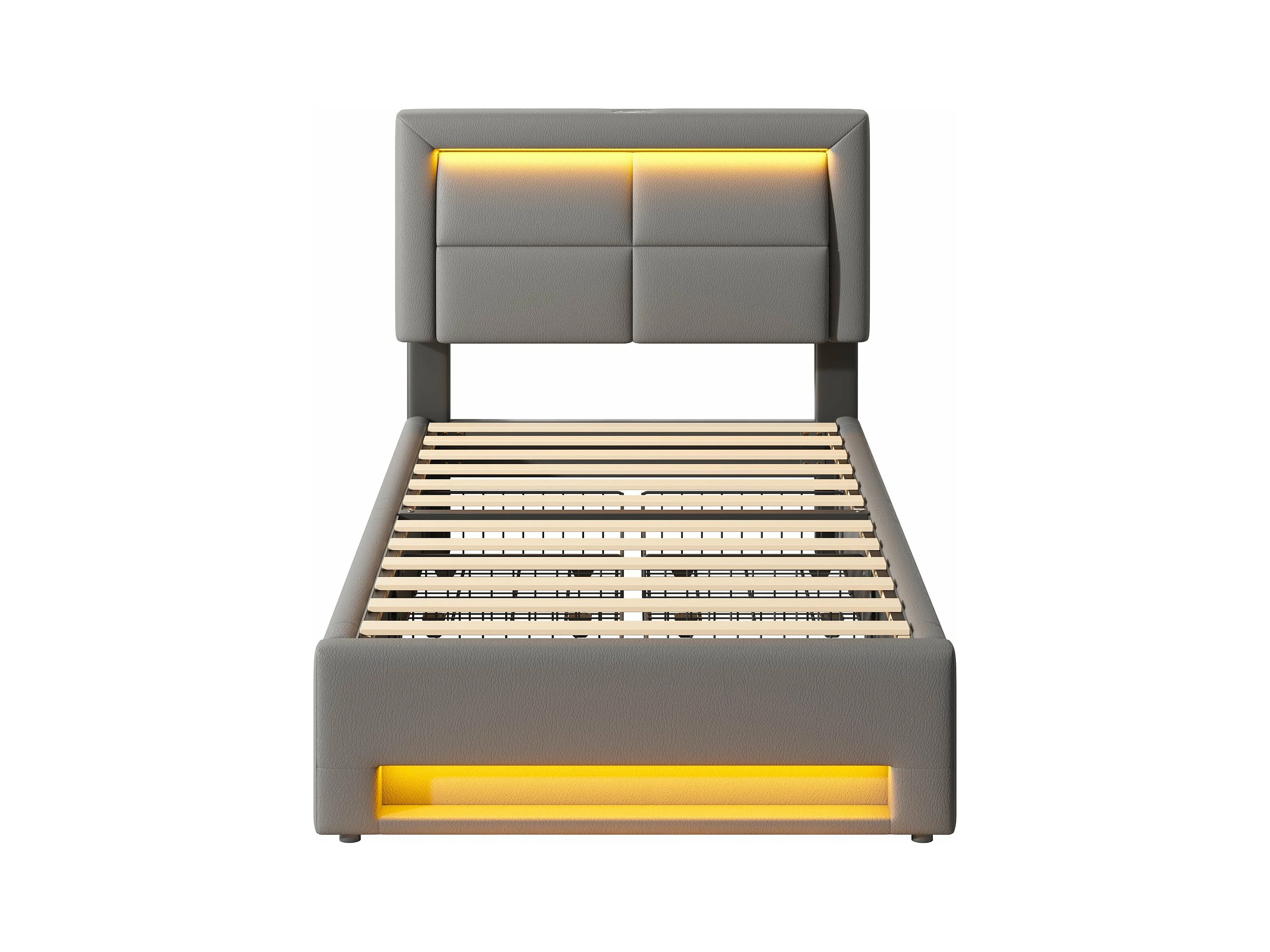 Lit rembourré 90x190 cm, avec port USB (supporte le chargement sans fil et filaire), avec éclairage LED et quatre tiroirs, PU-Litschi, gris