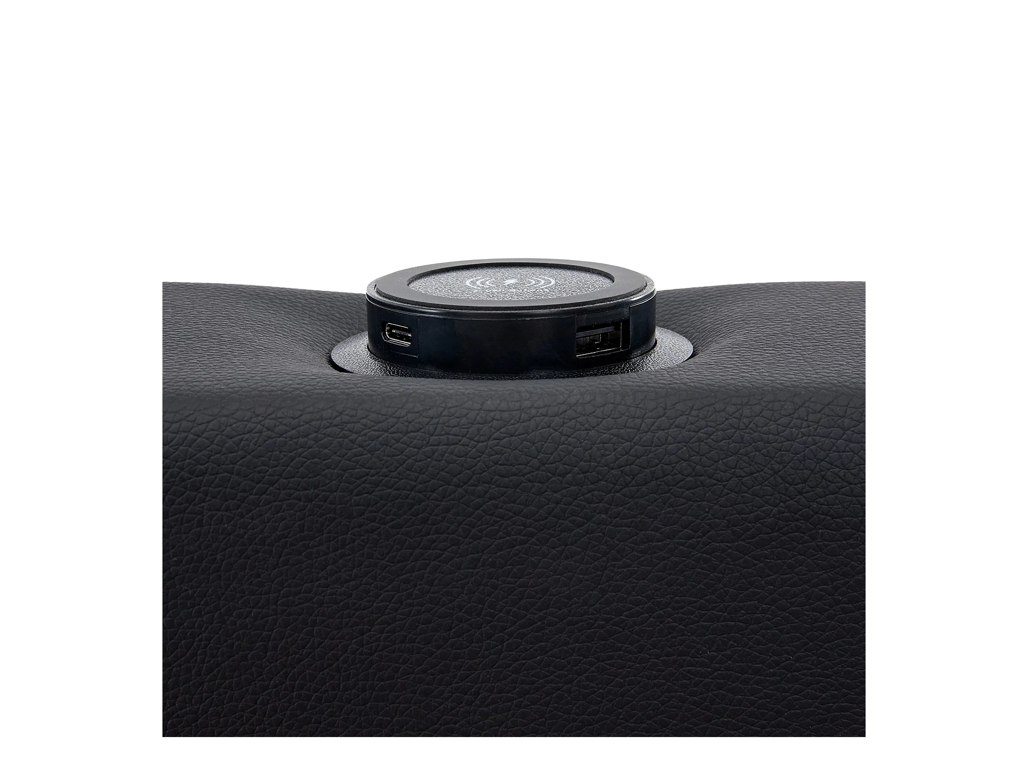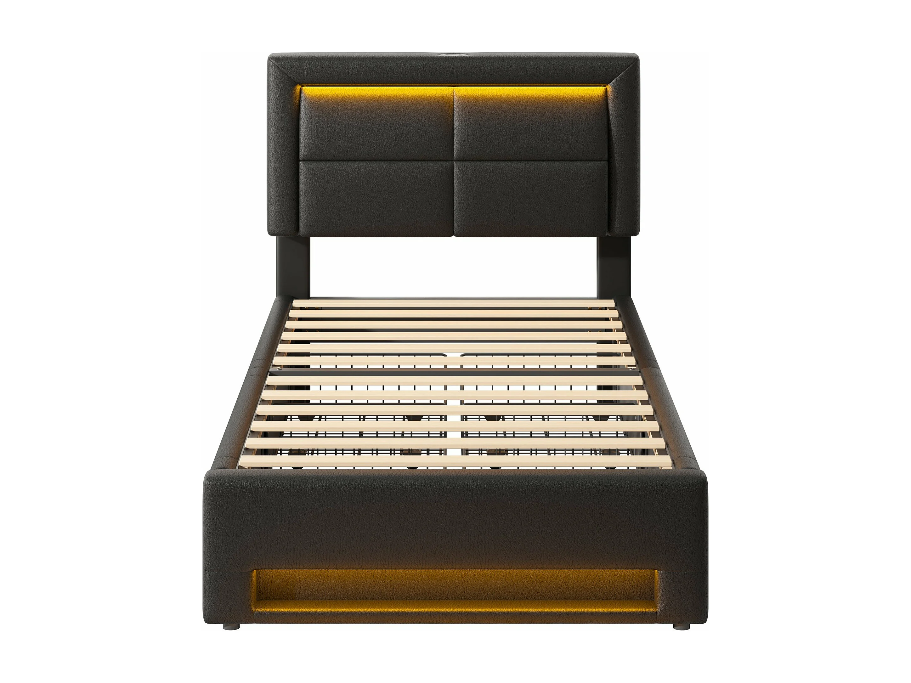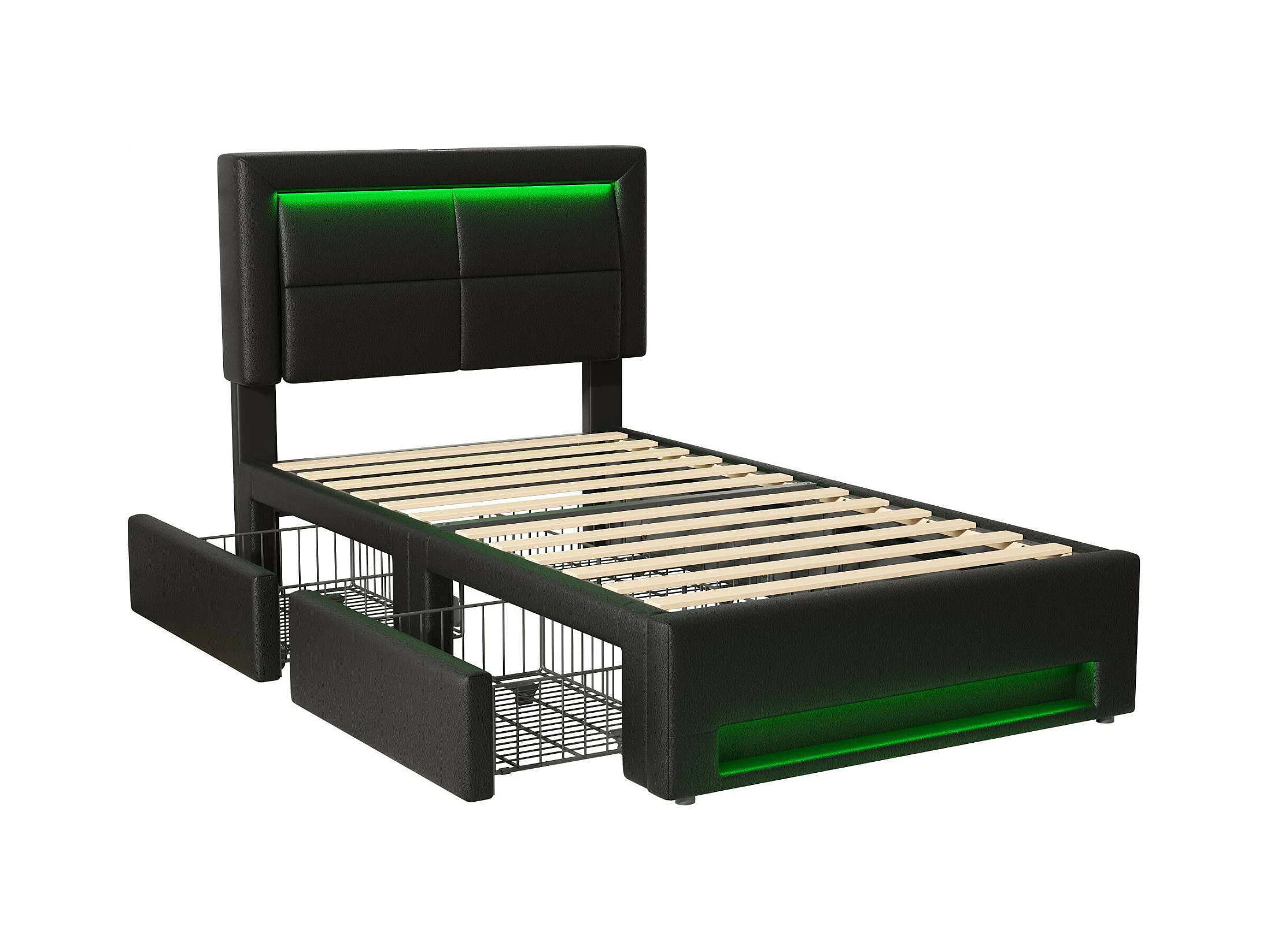 Lit rembourré 90x190 cm, avec port USB (supporte le chargement sans fil et filaire), avec éclairage LED et quatre tiroirs, PU-Litschi, noir